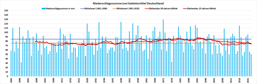 Erinnert sich noch jemand an die „Schafskälte“? Dieser Begriff beschreibt eine sogenannte Wettersingularität, nach der im Laufe der ersten oder zweiten Junidekade mit späten Kälterückfällen in Mitteleuropa durch eine feuchtkalte Nordwestlage zu rechnen ist. Die Wahrscheinlichkeit dafür lag bis 1990 bei bis zu 70% und ist danach im Zuge des Klimawandels deutlich gesunken. In den letzten Jahren trat sie kaum mehr auf, stattdessen entwickelte sich der Juni in rasantem Tempo vom Früh- zum Hochsommermonat, der regelmäßig die Temperaturen eines durchschnittlichen Julis erreicht oder sogar überbietet – so auch in diesem Jahr. Auch beim Sonnenschein ist er in neue Dimensionen vorgestoßen: wie im Vorjahr fehlten nur zehn Stunden zum erst 2019 aufgestellten Rekord von fast 300 Stunden. Auf Regen mussten Mensch und Natur hingegen erst lange warten, bevor Tief „Lambert“ mit den höchsten 24-Stunden-Summen seit „Alfred“ im Juli 2017 für deutliche Entspannung in Sachen Trockenheit sorgte.