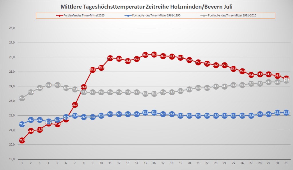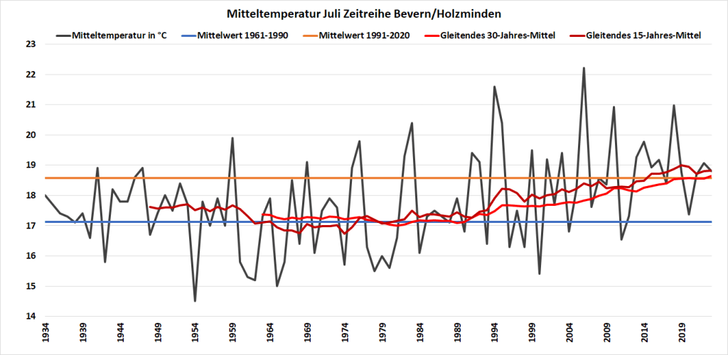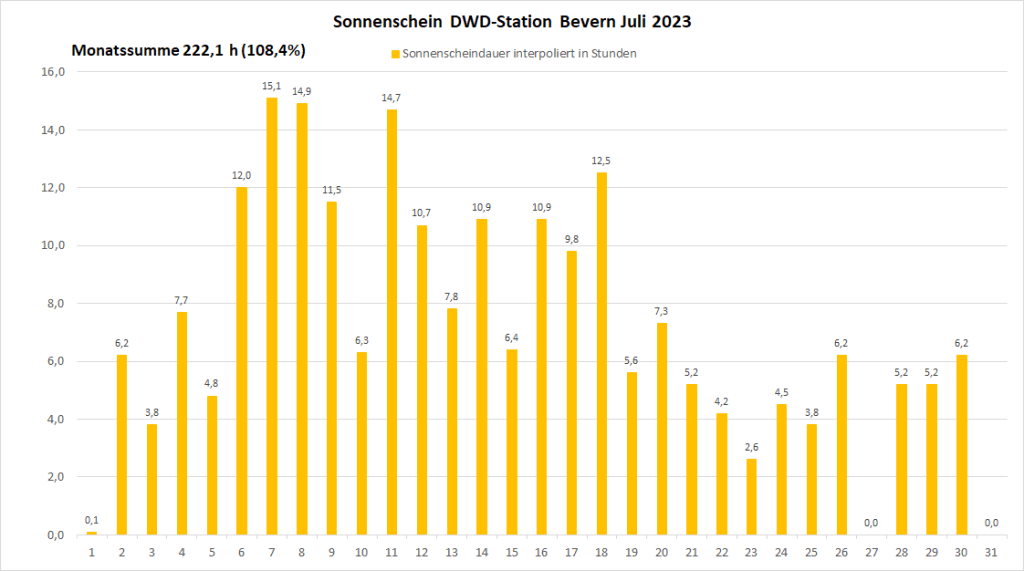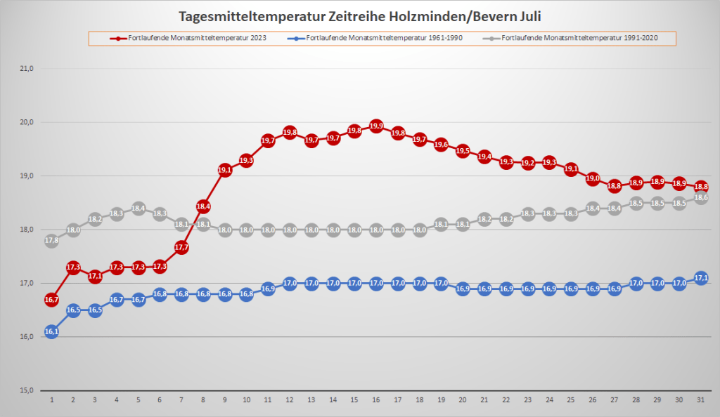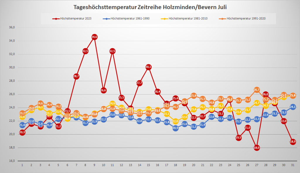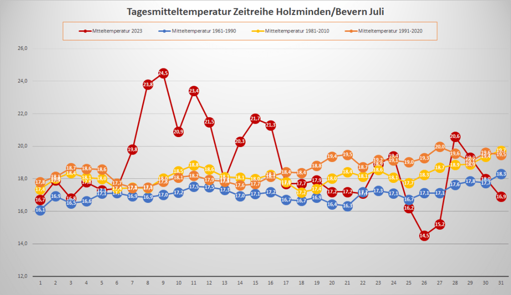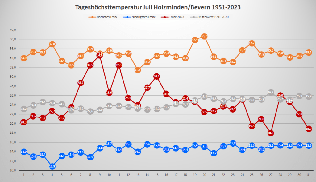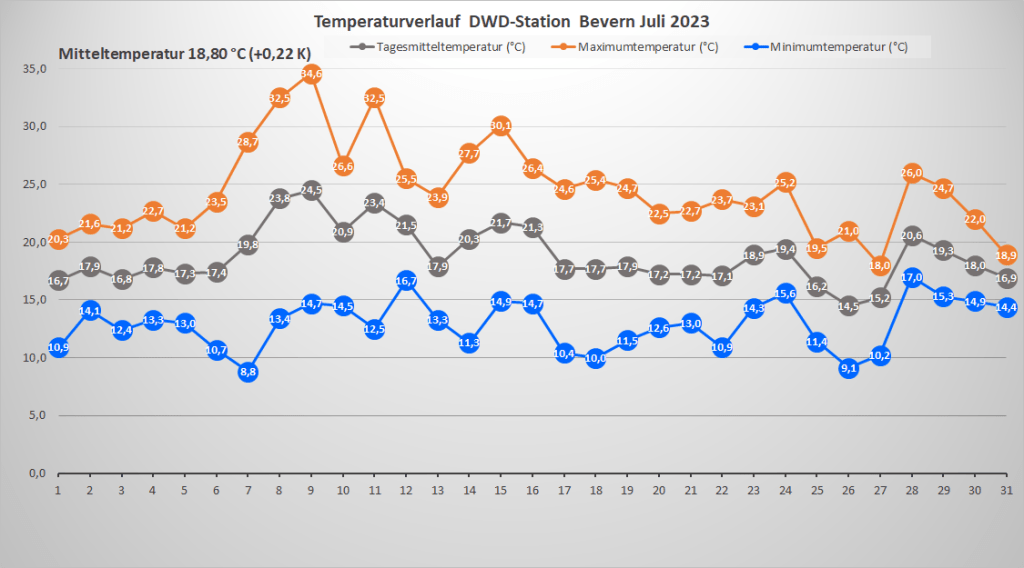 Mit einer Monatstemperatur von 18,80 °C lag der Juli 2023 an der DWD-Klimastation in Bevern um 0,2 K über dem Mittelwert von 1991-2020; gegenüber der älteren, kühleren Norm von 1961-1990 gab es ein Plus von 1,7 K. Das Maximum wurde am 9. mit 34,6 °C gemessen, nachdem im vergangenen Jahr am 20.07. ein neuer Allzeitrekord von 38,7 °C Wettergeschichte geschrieben hatte. Insgesamt gab es vier heiße Tage mit einem Höchstwert von mindestens 30,0 °C, was genau dem Durchschnitt der letzten 30 Jahre entspricht, während die Anzahl der Sommertage (mindestens 25 Grad) mit zwölf leicht darunter lag. Unter der 20-Grad-Marke landeten wie im Juni nur zwei Tage – der Trend zu kaum noch kühlen Tagen im Sommer setzte sich also weiter fort. Die Nächte blieben überwiegend recht frisch mit Minima meist zwischen 10 und 15 Grad, die wärmste Nacht war mit einem Tiefstwert von 18,0 °C weit von einer Tropennacht entfernt.