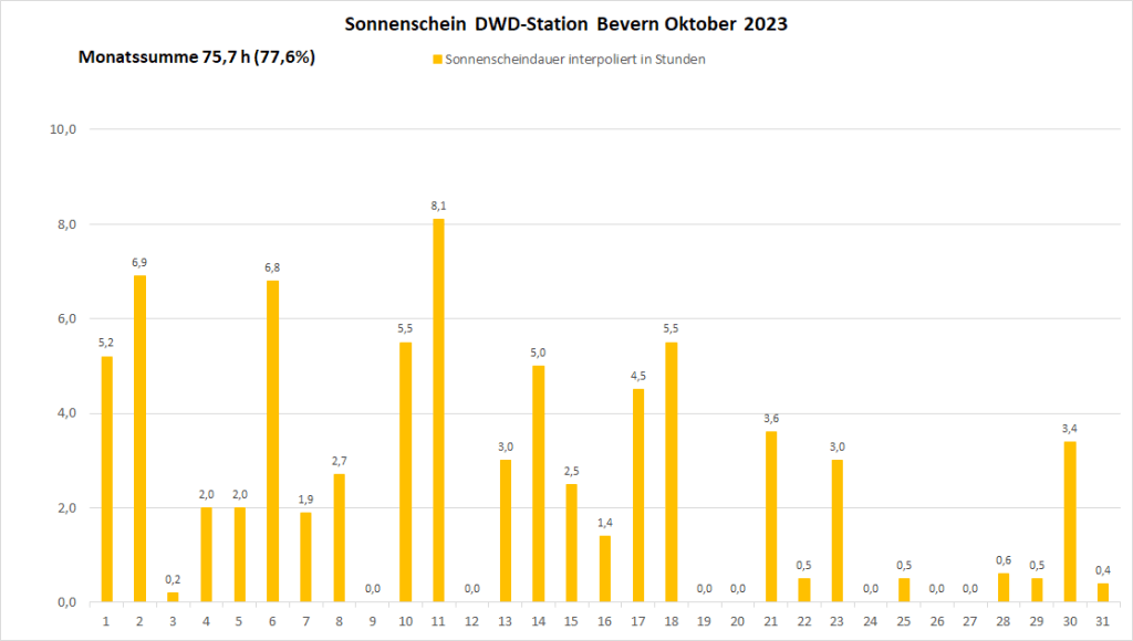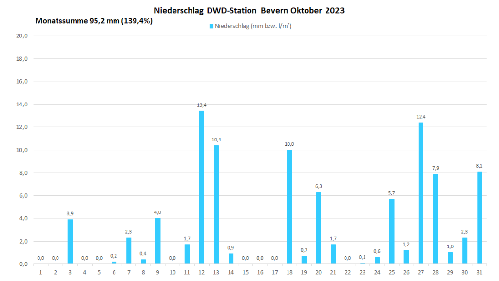 Auf der anderen Seite der Skala blieben kühle Nächte die Ausnahme, da meist dichte Bewölkung eine stärkere Ausstrahlung verhinderte. So blieb der tiefste in zwei Metern Höhe gemessene Wert in Bevern mit 3,1 °C weit vom ersten Luftfrost entfernt. Deutlich knapper wurde es in 5 cm Höhe über dem Boden, wo die Temperatur am 17. auf 0,1 °C sank. Im ebenfalls sehr milden Oktober des vergangenen Jahres lag die durchschnittliche Höchsttemperatur noch ein Stück höher als in diesem Jahr, dafür waren die Tiefstwerte oft niedriger – und damals hatte es einen kuriosen Temperaturverlauf mit im Laufe des Monats entgegen dem jahreszeitlichen Trend immer weiter ansteigenden Werten gegeben. Ein solches Phänomen blieb diesmal aus, ab Monatsmitte sanken die Maxima und die 15-Grad-Marke wurde nur noch an wenigen Tagen überschritten, auf der anderen Seite aber die 10-Grad-Marke nie unterschritten.