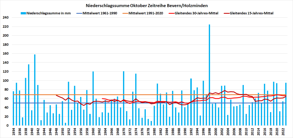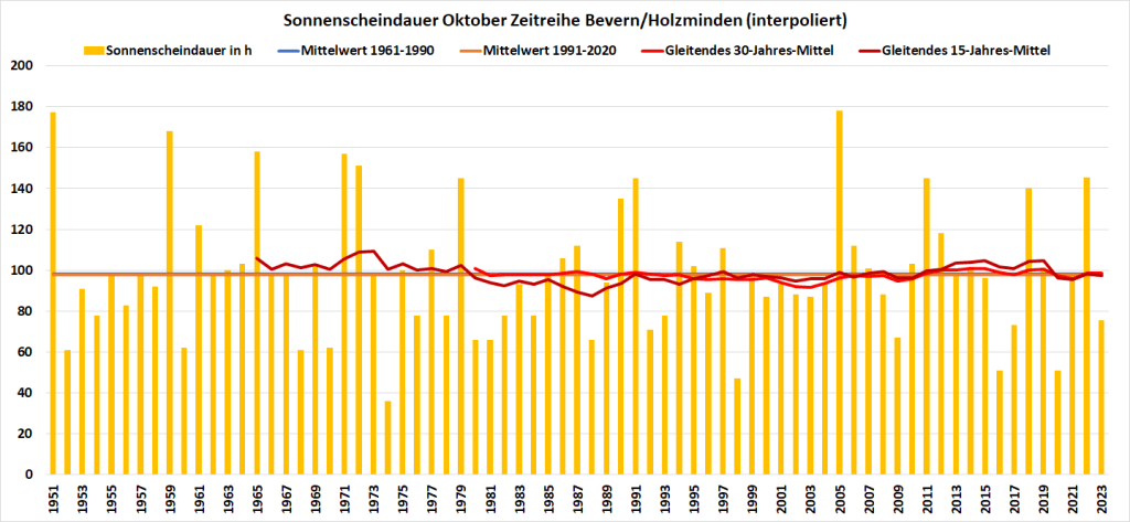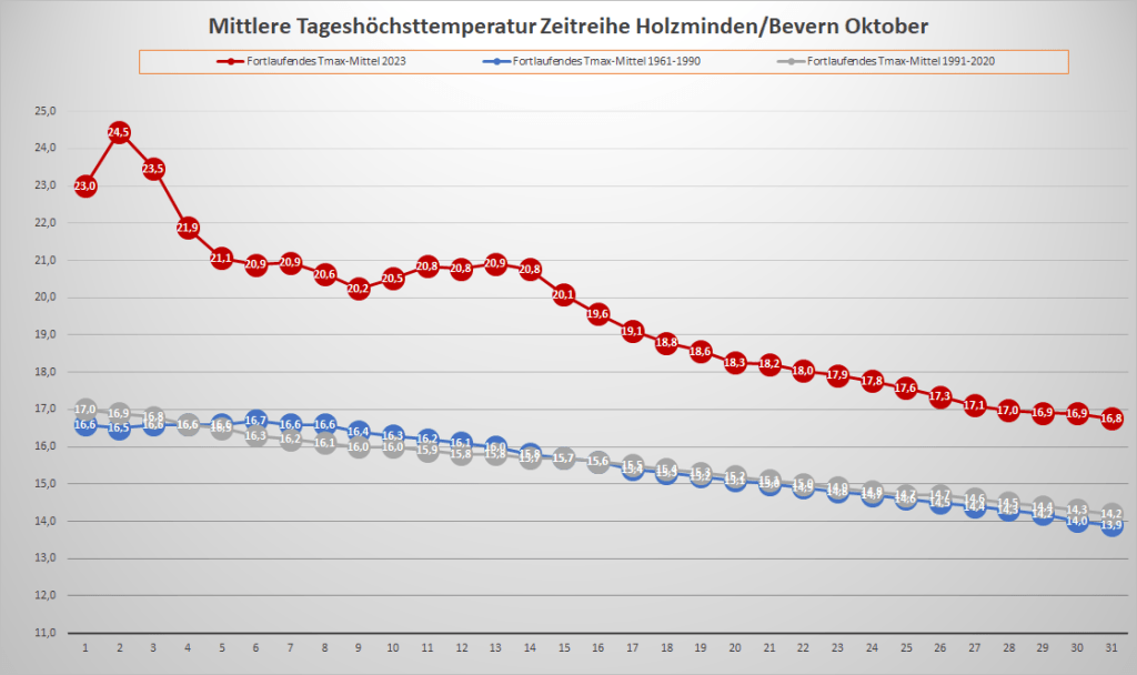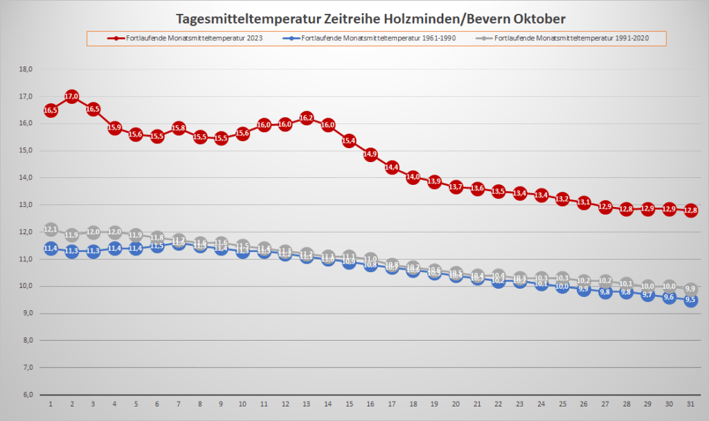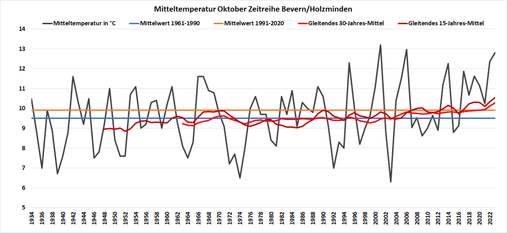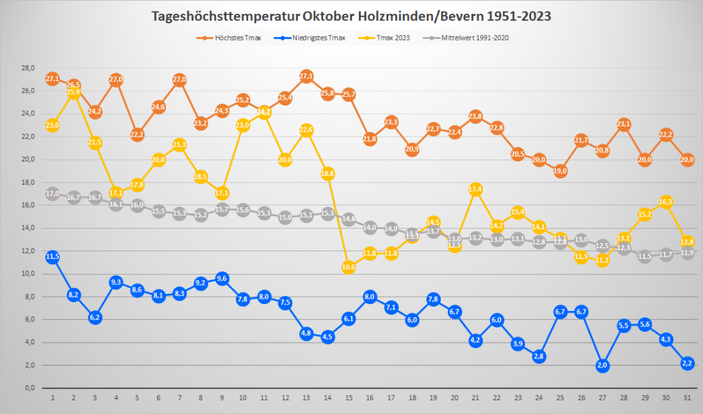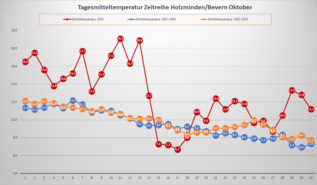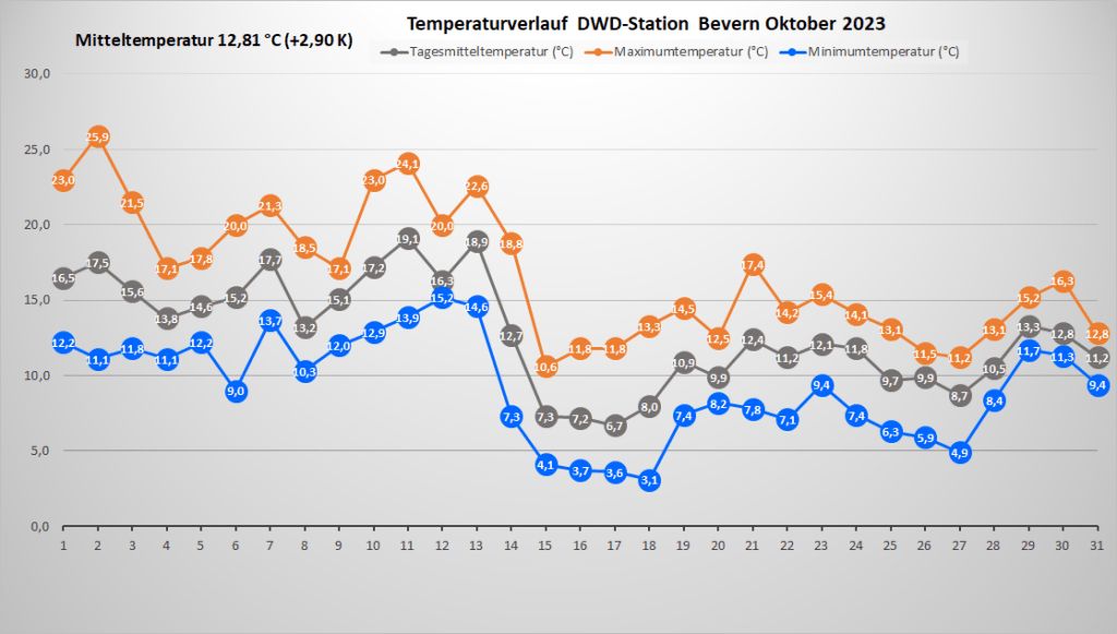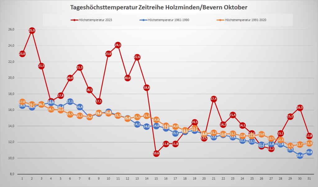 Mit einer Monatstemperatur von 12,81 °C war der Oktober 2023 an der DWD-Klimastation in Bevern um fast 3 Kelvin wärmer als im Mittel der Jahre 1991-2020. Im Vergleich zum niedrigeren, 30 Jahre älteren Klimawert der Periode 1961-1990 betrug das Plus sogar 3,3 K. Damit war es hinter 2001 und 2006 der drittwärmste Oktober der Zeitreihe Bevern/Holzminden ab 1934. Ungewöhnlich hoch waren dabei vor allem die Höchstwerte in den ersten zwei Wochen, als die 20-Grad-Marke noch neunmal überschritten wurde und es am 2. sogar noch einmal für einen späten meteorologischen Sommertag reichte mit dem Monatshöchstwert von 25,9 °C.