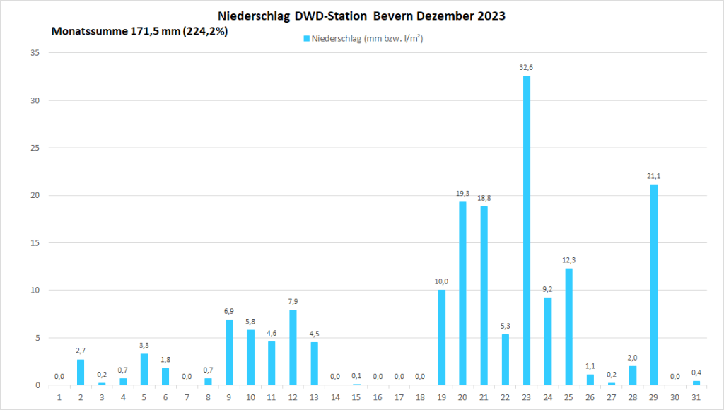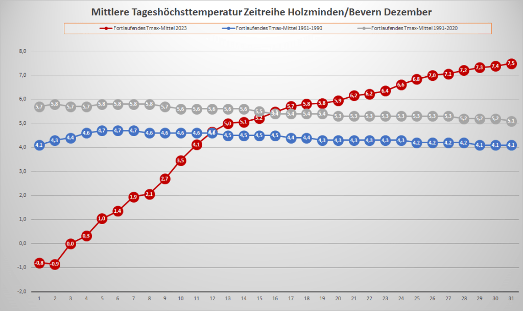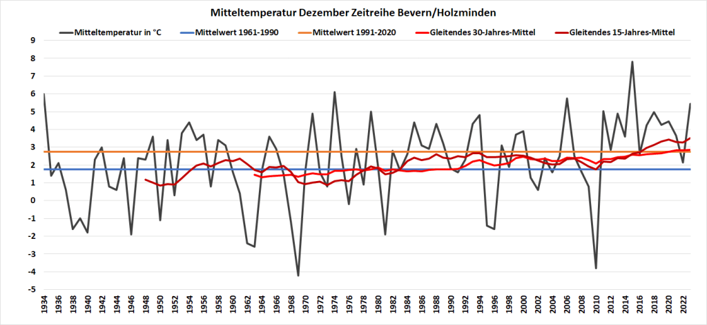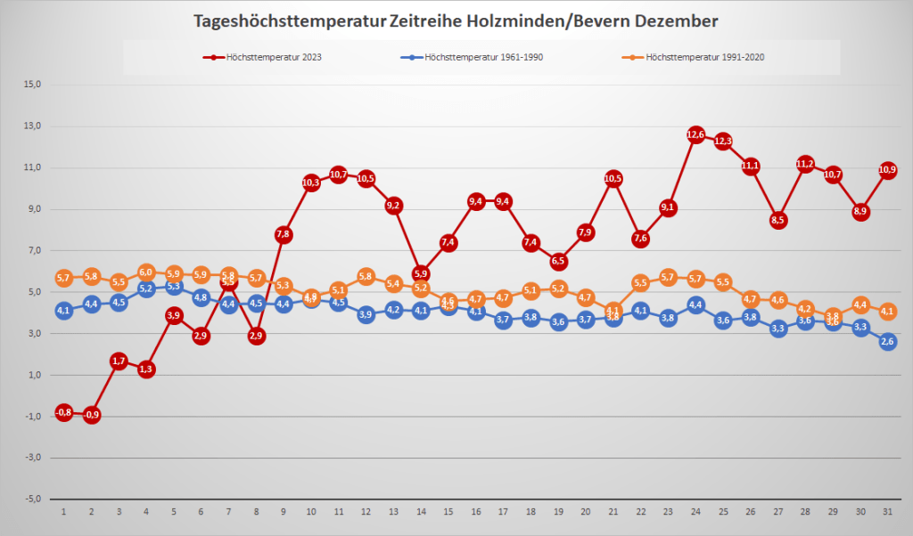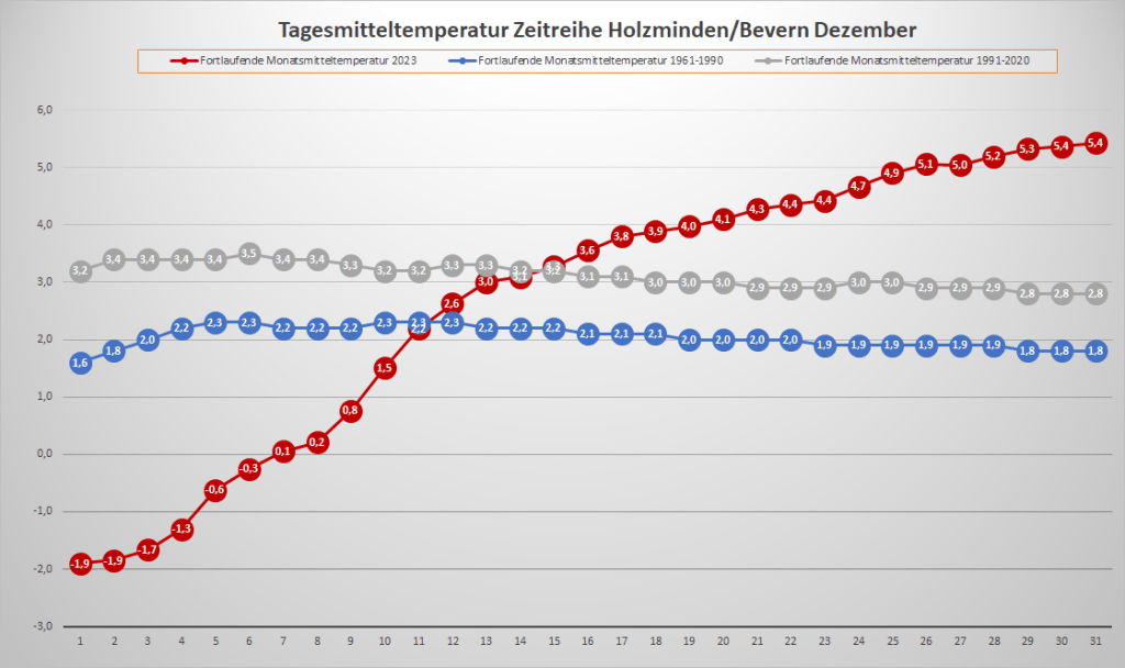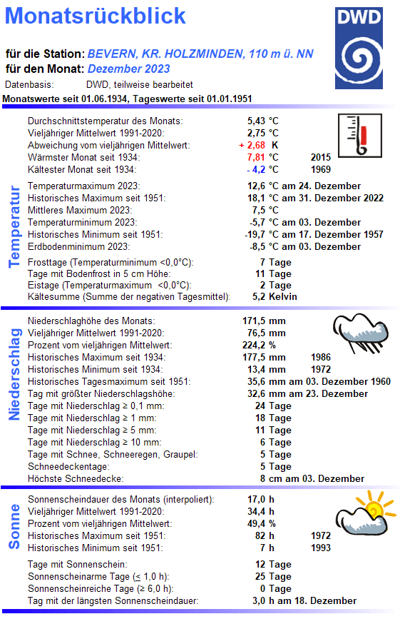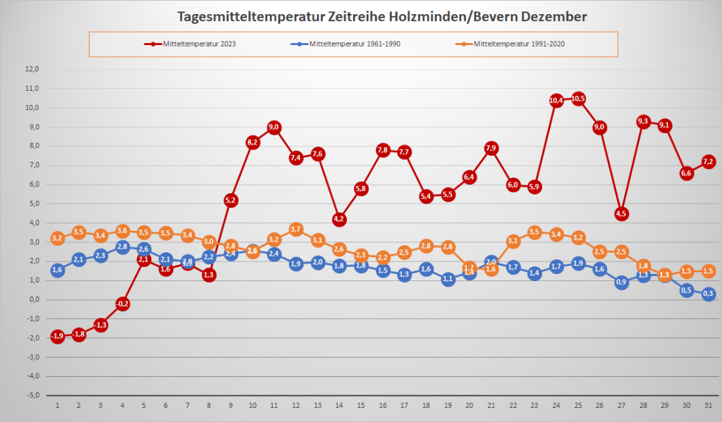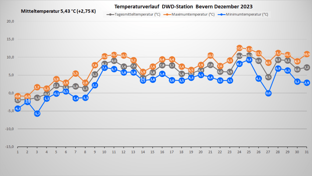 Mit einer Monatstemperatur von 5,43 °C war der Dezember 2023 an der DWD-Klimastation in Bevern um fast 2,7 Kelvin wärmer als im Mittel der Jahre 1991-2020. Im Vergleich zum niedrigeren, 30 Jahre älteren Klimawert der Periode 1961-1990 betrug das Plus sogar 3,7 K. Damit war es der fünftwärmste Dezember seit Aufzeichnungsbeginn 1934 – trotz eines durchaus winterlichen Starts mit leichtem Dauerfrost. Von außergewöhnlichen Höchstwerten wie den rekordwarmen 18,1 Grad am Silvestertag 2022 blieb die milde Westwetterlage ab dem Ende der ersten Dekade in diesem Jahr zwar weit entfernt, dafür gab es bis zum Jahresende aber keine kühle, geschweige denn kalte Phase mehr – Durchschnittswerte bei den Maxima von 9,5 °C und fast fünf Grad bei den Minima ab dem 10. Dezember erinnern deutlich mehr an Herbst als an Winter. Auch die Zahl der Frosttage blieb mit sieben, die allesamt in den ersten acht Tagen gemessen wurden, deutlich unter den langjährigen Mittelwerten. Die Zeit ab 9. markiert eine der bisher längsten frostfreien Perioden in einem Dezember überhaupt.