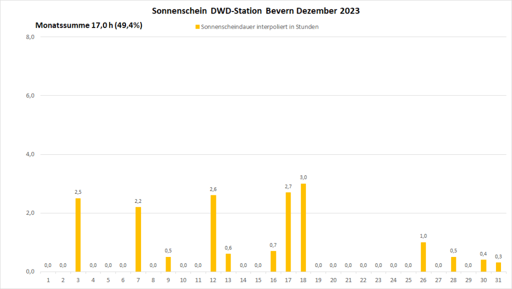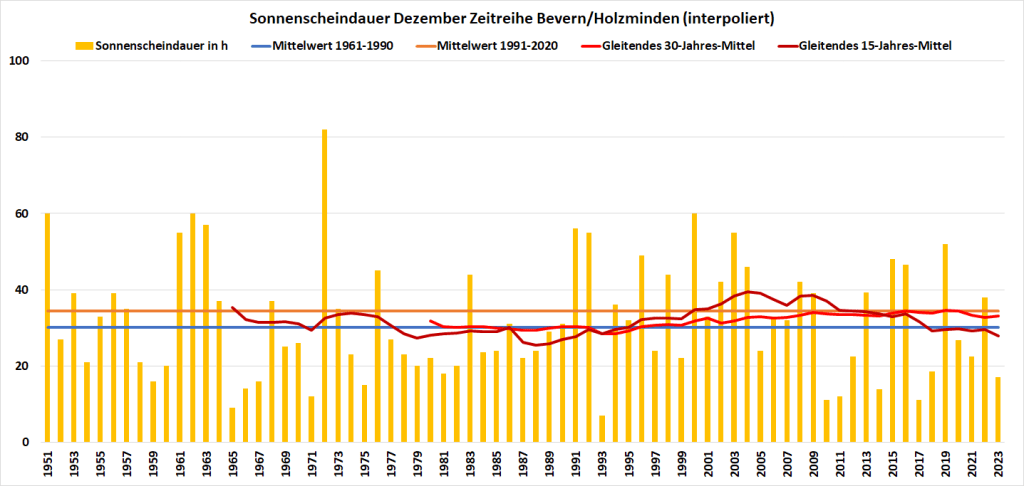 Sonnenschein suchten die Kreis-Holzmindener in diesem Dezember oft vergeblich und wenn sie ihn mal fanden, dann meist nur kurz – mit diesen Worten lassen sich die höchste Tagessumme von gerade mal drei Stunden sowie die Monatssumme von ganzen 17 Stunden wohl am besten zusammenfassen. Damit wurde nicht einmal ganz die Hälfte des langjährigen Mittelwerts erreicht und auch die Quartalsbilanz fällt mit 117 Stunden sehr bescheiden aus: Im Schnitt zeigt sich die Sonne von Oktober bis Dezember immerhin 60 Stunden länger am Himmel.