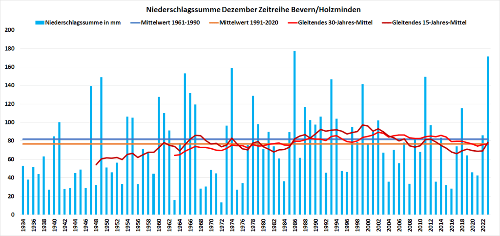 Der Frühwinter kam überpünktlich und bescherte der Region bereits Ende November Schnee bis in die Niederungen, bevor ein Wetterwechsel mit deutlicher Milderung am zweiten Dezemberwochenende auch die stattliche Schneedecke im Hochsolling binnen kurzer Zeit verschwinden ließ. Für den großen Rest des ersten meteorologischen Wintermonats dominierten atlantische Luftmassen mit für die Jahreszeit ungewöhnlich lang anhaltenden hohen Temperaturen und im Laufe der zweiten Hälfte immer längeren und intensiveren Regenfällen, die das Wesertal in der Weihnachtswoche unter Wasser setzten und dem Hochsolling den nassesten Dezember seit Beginn der dortigen Wetterbeobachtungen bescherten. Trotz einiger Dauerfrosttage zu Beginn fiel die Monatsbilanz bei den Temperaturen sehr mild aus. Die Sonnenscheindauer blieb mit ganzen 17 Stunden noch zurückhaltender als ohnehin schon üblich zu dieser Jahreszeit.