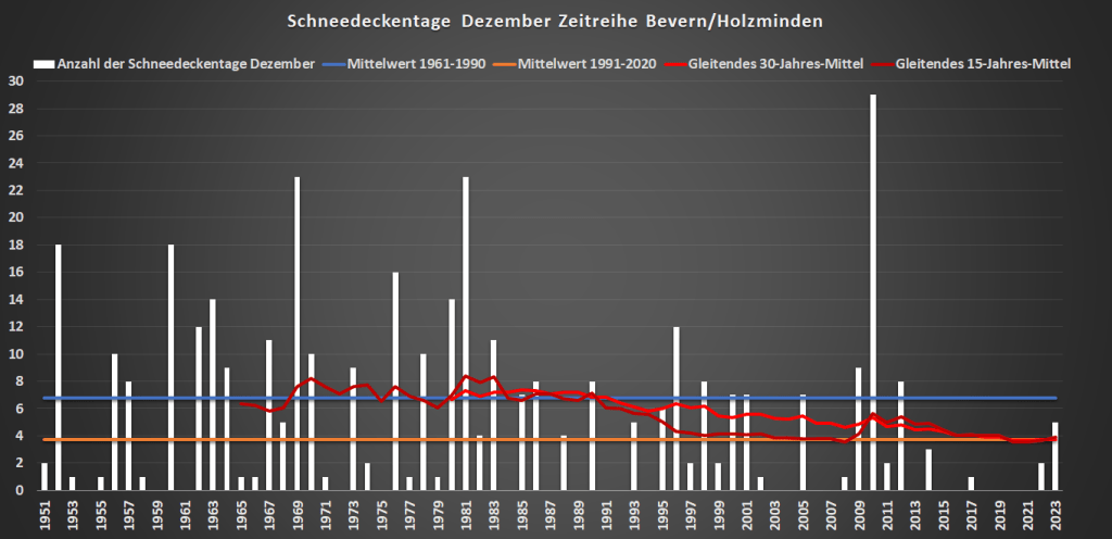 Schnee gab es zu Monatsbeginn bis in die Niederungen, in Bevern waren es am Morgen des 3. acht Zentimeter auf 110 m Stationshöhe, in Holzminden und Lüchtringen immerhin noch sechs. Der dickste Schnee kam diesmal nicht im Solling zum Vorschein, sondern am Elfaß in Vorwohle, wo die Bedeckung am 5. Dezember auf bis zu 25 cm angewachsen war.