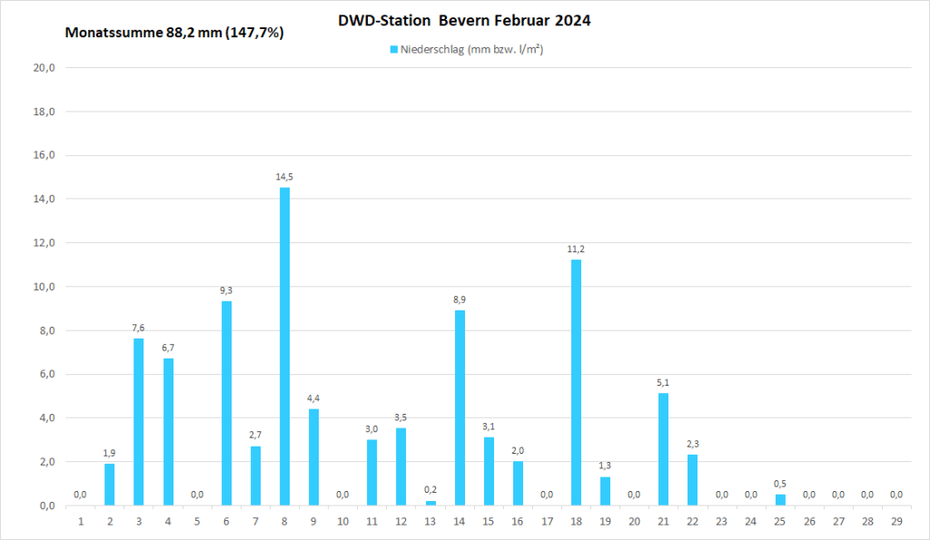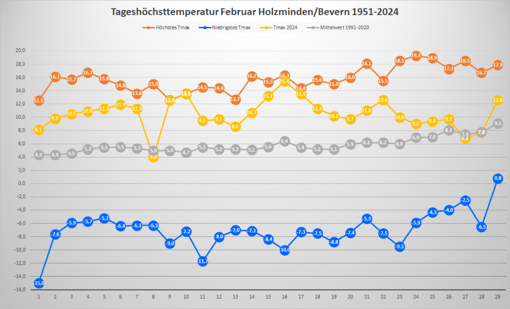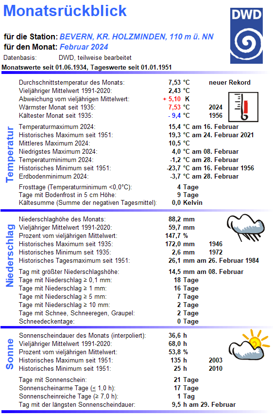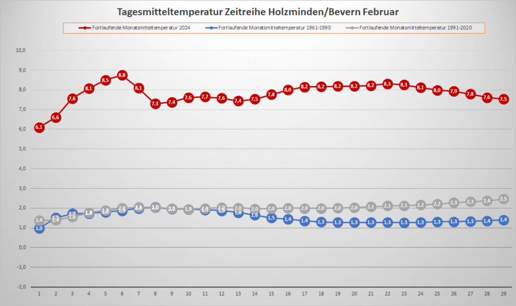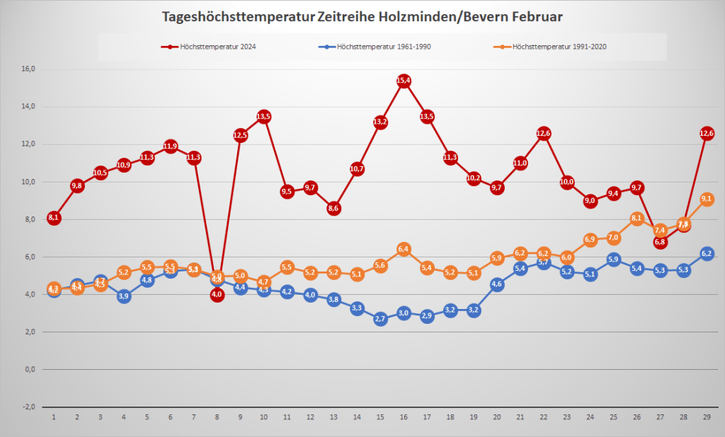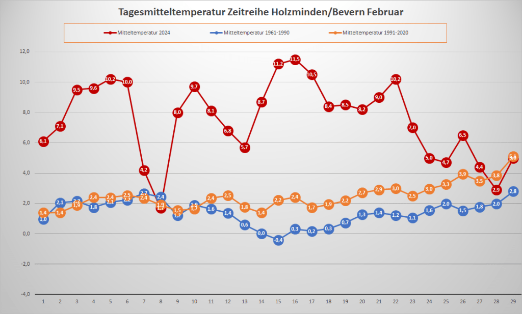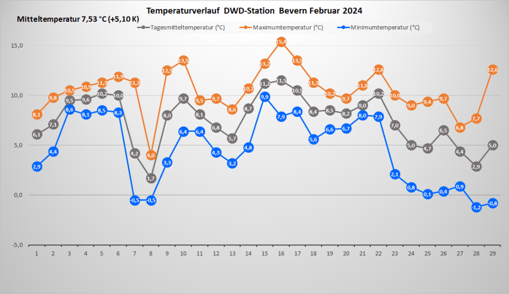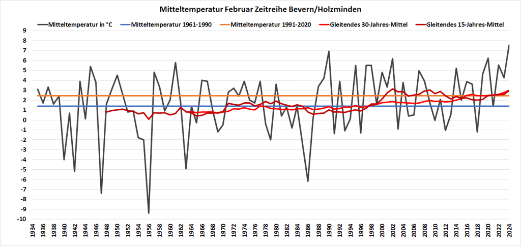 Mit einer Monatstemperatur von 7,53 °C war der Februar 2024 an der DWD-Klimastation in Bevern um satte 5,1 Kelvin wärmer als im Mittel der Jahre 1991-2020, im Vergleich zur kälteren Klimaperiode von 1961-1990 betrug das Plus sogar fast 6,2 K. Damit wurde der Rekord von 1990 um 0,7 K übertroffen und es gab den zweitwärmsten Wintermonat seit Beginn der Beobachtungen – nur der Dezember 2015 hatte die Kapriolen mit 7,8 °C und an Weihnachten geöffneter Außengastronomie noch ein Stück weiter auf die Spitze getrieben. Zur Einordnung: Ganze zweimal seit 1935 war ein März bisher wärmer als der abgelaufene Februar, und selbst der April schloss immerhin 22 Mal kälter ab.
