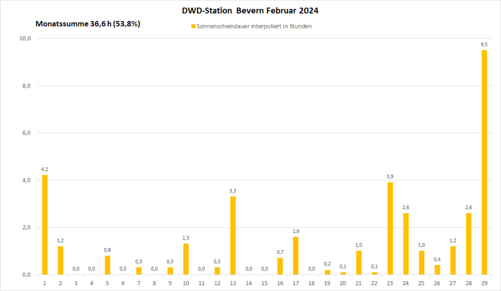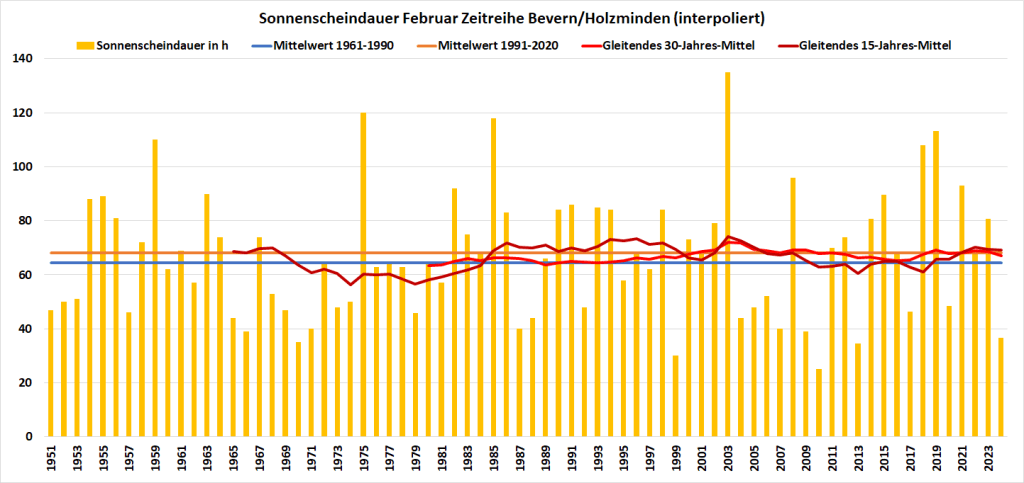 Bei der Sonnenscheindauer sortiert sich der Februar 2024 weit unten ein, obwohl er durch das Schaltjahr einen Tag mehr zur Verfügung hatte. Immerhin diesen „Bonustag“ nutzte er mit der höchsten Tagessumme von 9,5 Stunden voll aus, was die Monatsbilanz noch auf knapp 37 Stunden verbesserte, das langjährige Mittel von 68 Stunden wurde jedoch deutlich verfehlt. Insgesamt war es nur viermal seit 1951 noch trüber, beim Negativrekord im Februar 2010 schien die Sonne sogar nur 25 Stunden lang.