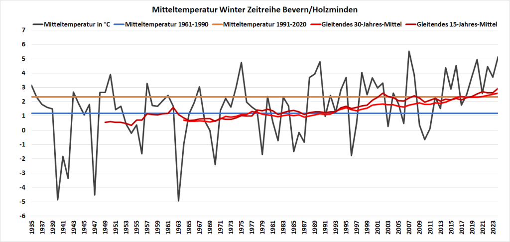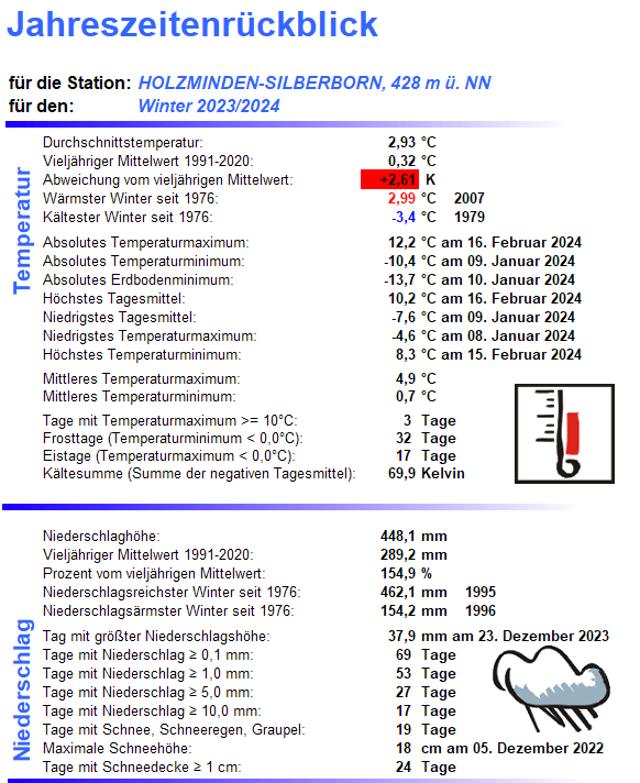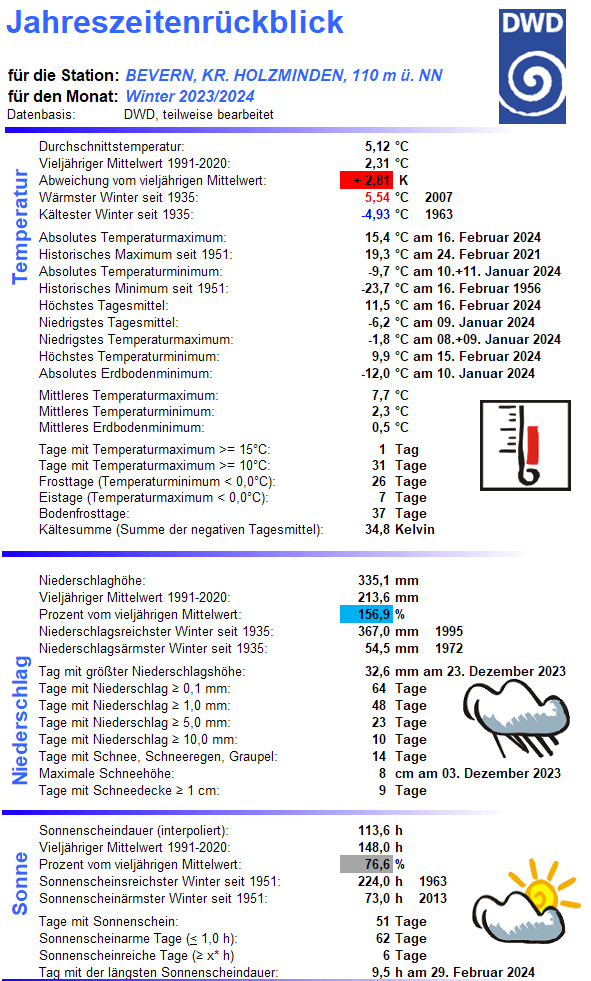Auch wenn spätwinterliche Rückfälle bis in den April hinein zumal im Solling keine Seltenheit sind, ziehen die Meteorologen nach dem Februar den Strich unter den Winter. Die regionale Auswertung zeigt für den Standort Bevern, stellvertretend für das Oberwesertal und die angrenzenden vergleichbar hoch gelegenen Orte den zweitwärmsten Winter seit Beobachtungsbeginn. Mit einer Mitteltemperatur von 5,12 °C verdrängte der Winter 2024 den von 2020 auf den dritten Platz, Spitzenreiter bleibt 2007 mit 5,54 °C. Das Mittel 1991-2020 wurde um gut 2,8 K übertroffen, das von 1961-1990 um fast 4 K.