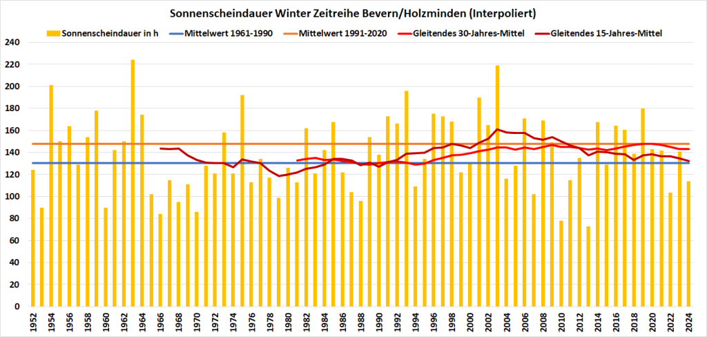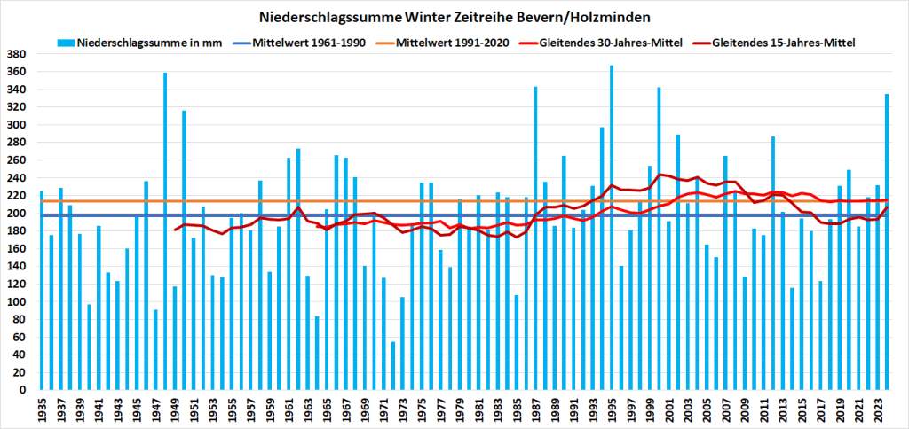 Viel Regen und zumindest im Dezember und Januar gelegentlich auch Schnee sorgten für einen sehr niederschlagsreichen Winter. In Bevern war es mit 335 mm der fünftnasseste seit Messbeginn 1935, in Silberborn mit 448 mm sogar der zweitnasseste seit mindestens 1949. Rekordhalter bleibt der Winter 1995 mit 367 bzw. 462 mm. Die langjährigen Klimawerte wurden in Bevern um 122 und in Silberborn um 159 mm übertroffen, was hier wie dort einem Plus von fast 57% entspricht. Der Überschuss in dieser Disziplin ging mit einer klar unterdurchschnittlichen Sonnenscheindauer einher: Mit 113 Stunden gab es nur gut 75% des langjährigen Mittels von 148 Stunden.
