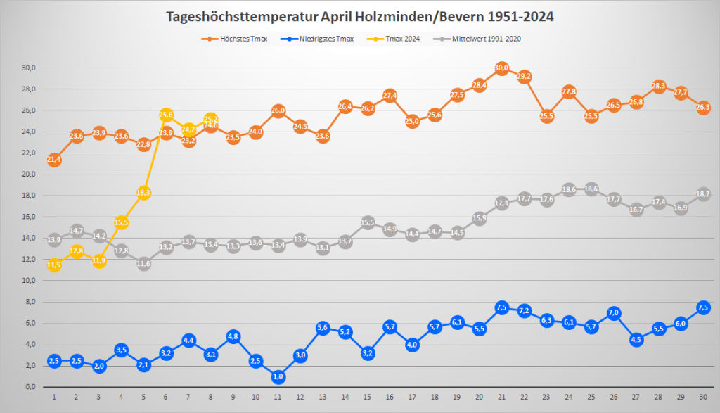 Nach diesem dreifachen Paukenschlag ist die Zeit der ganz hohen Temperaturen zwar erst einmal vorbei und zum Dienstag erwartet uns ein Rückgang um rund 10 Grad auf halbwegs durchschnittliche Werte, doch in der zweiten Wochenhälfte dürfte es bereits wieder ein Stück aufwärts gehen und am kommenden Wochenende sind nochmals Höchstwerte über 20 °C drin, auch wenn das aktuelle Niveau kaum mehr erreicht werden dürfte. Ob es danach zu einem deutlichen Temperaturrückgang auf seit langem mal wieder unterdurchschnittliche Werte kommt, bleibt noch abzuwarten, ist aber derzeit die von den Wettermodellen mehrheitlich favorisierte Variante. Dennoch bliebe auch dann die Option eines neuen Aprilrekords und damit des dritten Monatsrekords in Folge noch im Rennen – die Entscheidung dürfte erst in der letzten Woche fallen. Bisher stellt der April 2018 mit einem Monatsmittel von 13,0 °C (genau 12,99 °C) den Spitzenwert der Zeitreihe Bevern/Holzminden ab 1935.