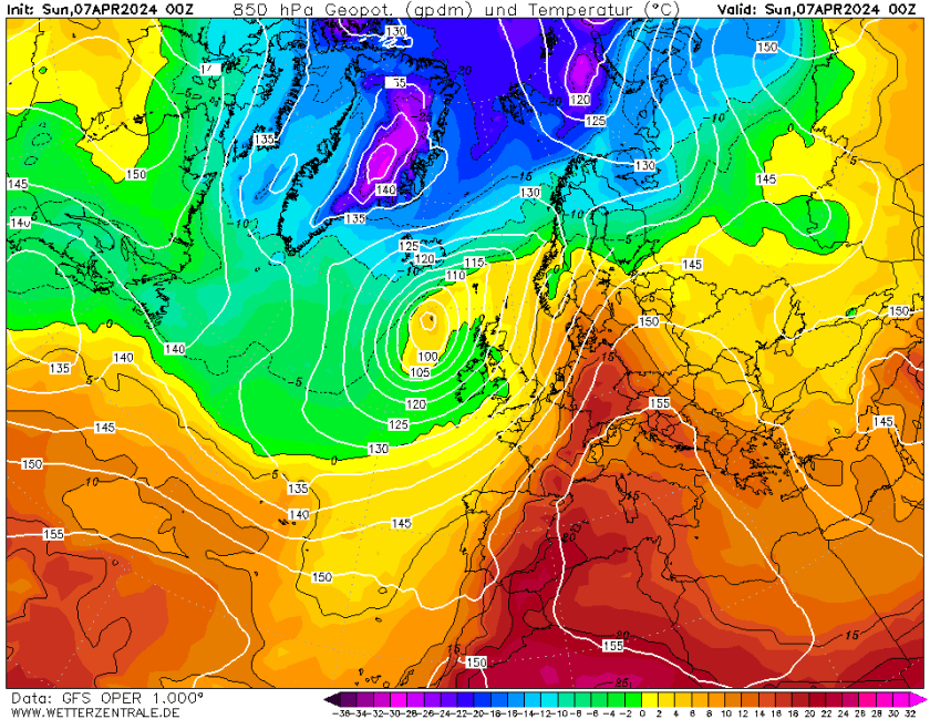 Und auch, wenn es vermessen klingen mag: Am Wochenende wäre bei „optimalem“ Verlauf sogar noch mehr drin gewesen. Dies zeigt ein Blick auf die Temperaturkarte in der 850-hPa-Fläche in ca. 1.500 m Höhe: