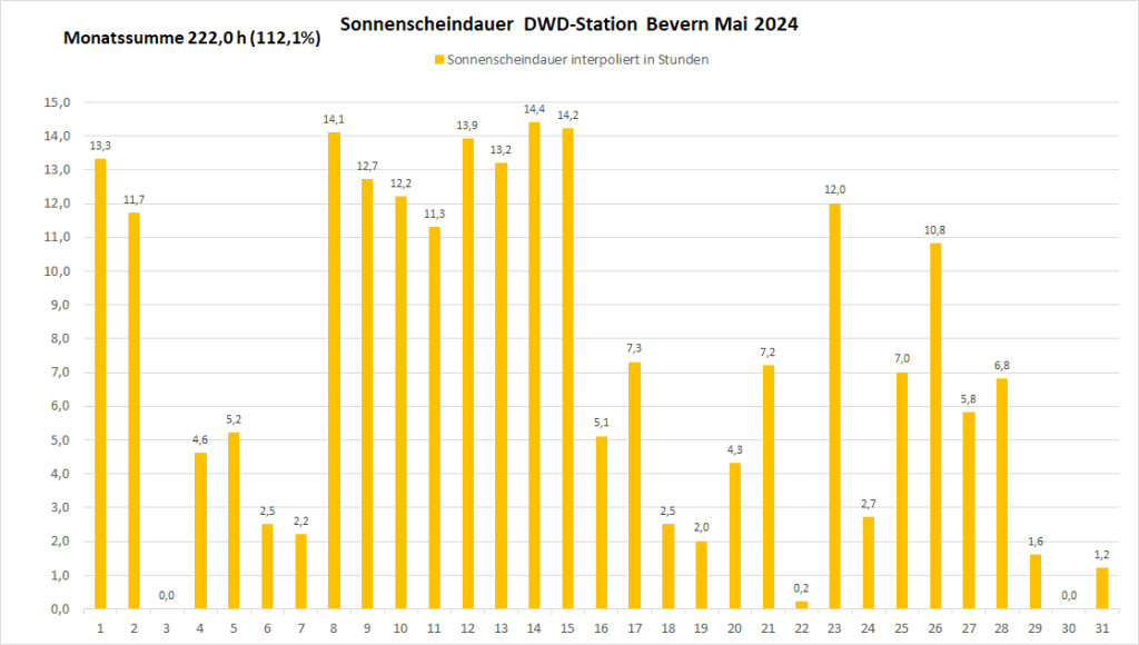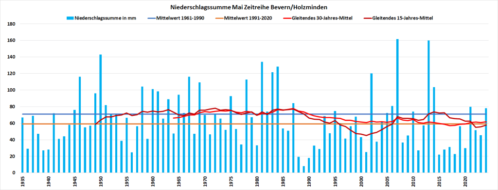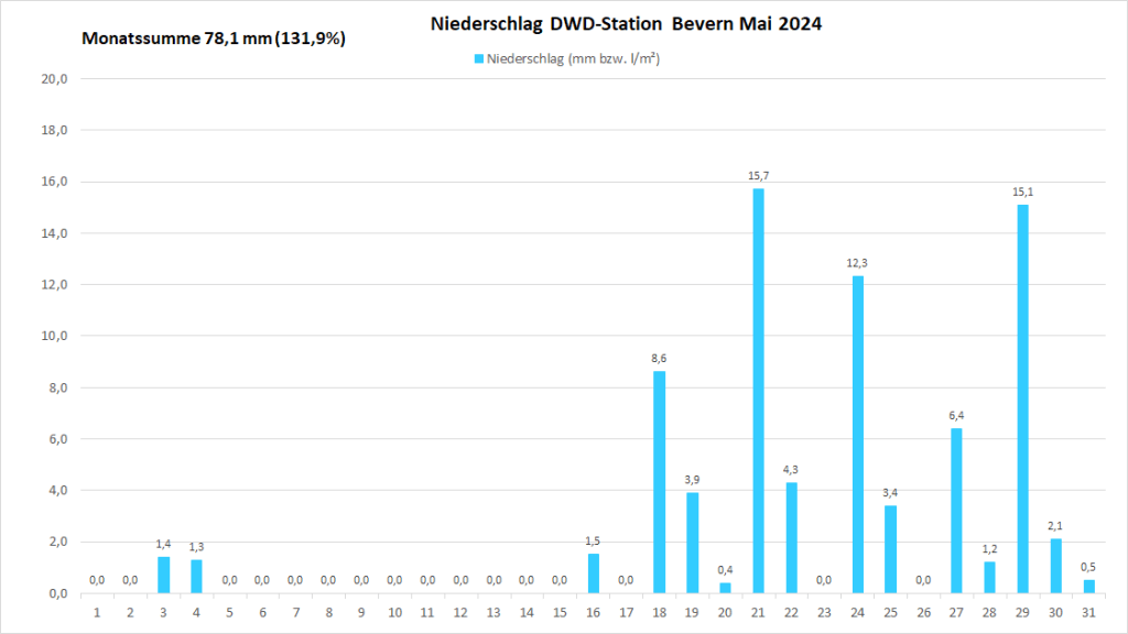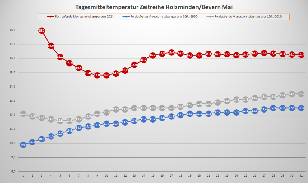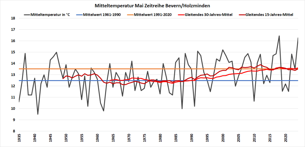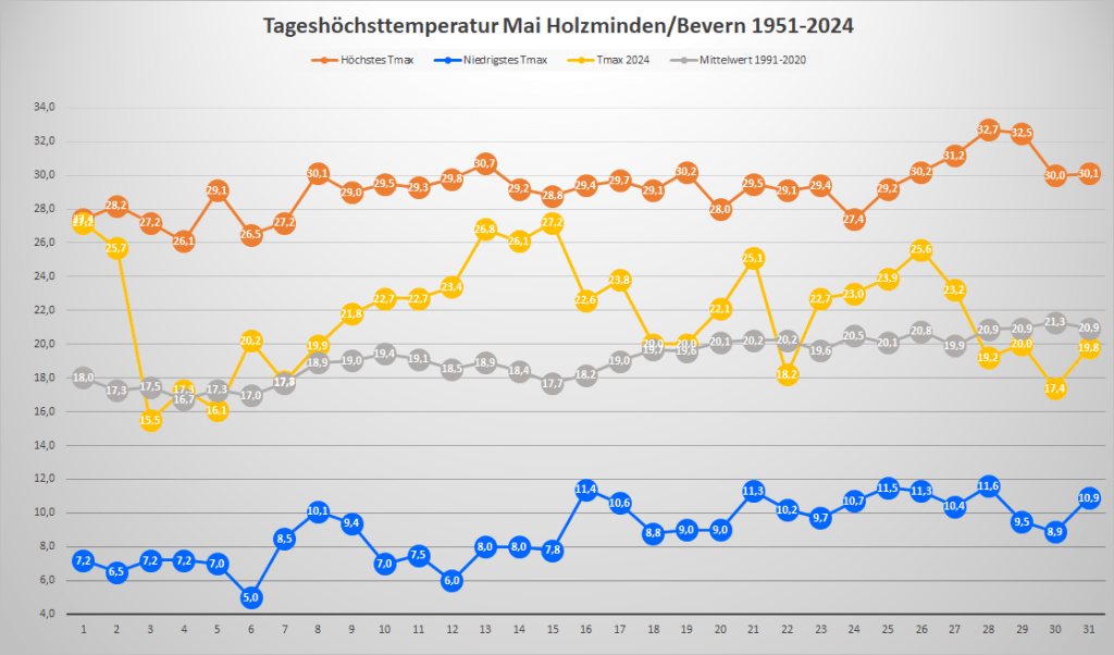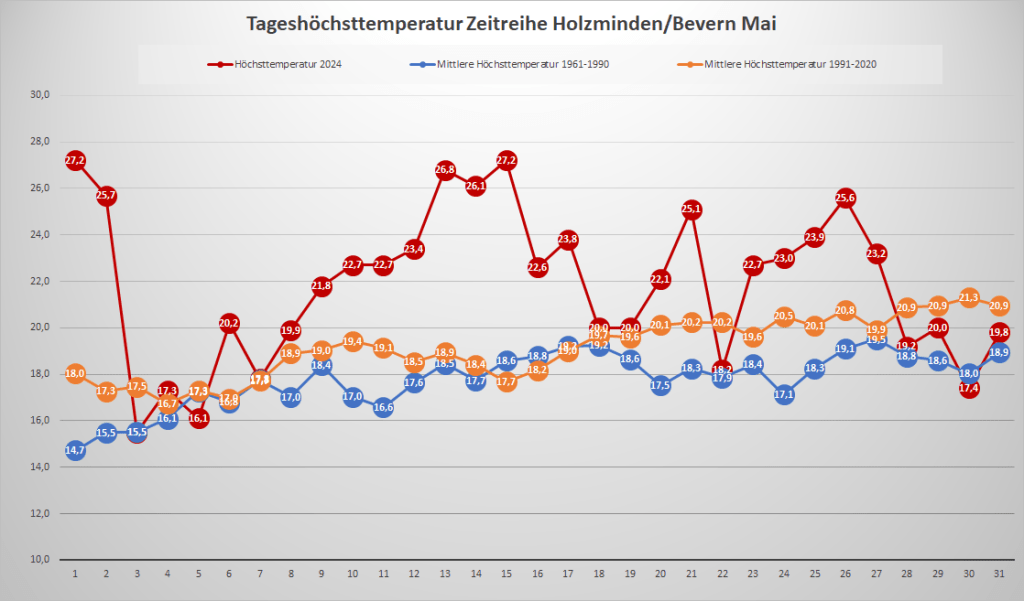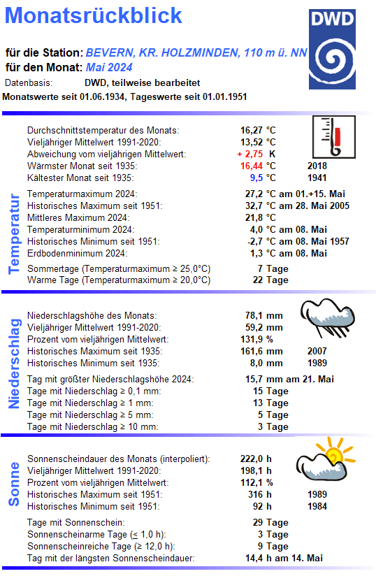 Mit einer Monatstemperatur von 16,27 °C war der Mai 2024 an der DWD-Klimastation in Bevern der zweitwärmste in der Zeitreihe Bevern/Holzminden seit Beobachtungsbeginn 1934 und erreichte damit fast das Niveau eines mittleren Junis. Gegenüber den langjährigen Maiwerten betrug das Plus bezogen auf die aktuelle Periode 1991-2020 2,75 K und sogar 3,79 K im Vergleich zum Klimamittel der Jahre 1961-1990. Die Höchstwerte lagen an ungewöhnlich vielen Tagen (22) über der 20-Grad-Marke, sieben Mal wurde ein meteorologischer Sommertag (ab 25 Grad) erreicht, Hitze blieb jedoch aus – der Höchstwert von 27,2 °C wurde gleich am 1. und nochmals am 15. gemessen. Der nächtliche Tiefstwert lag mit 4,0 °C am 8. so hoch wie noch nie in einem Mai, seit in Bevern gemessen wird (Inbetriebnahme Juli 2006) und erst zum dritten Mal blieb Bodenfrost im letzten Frühlingsmonat dort ganz aus.
