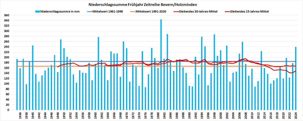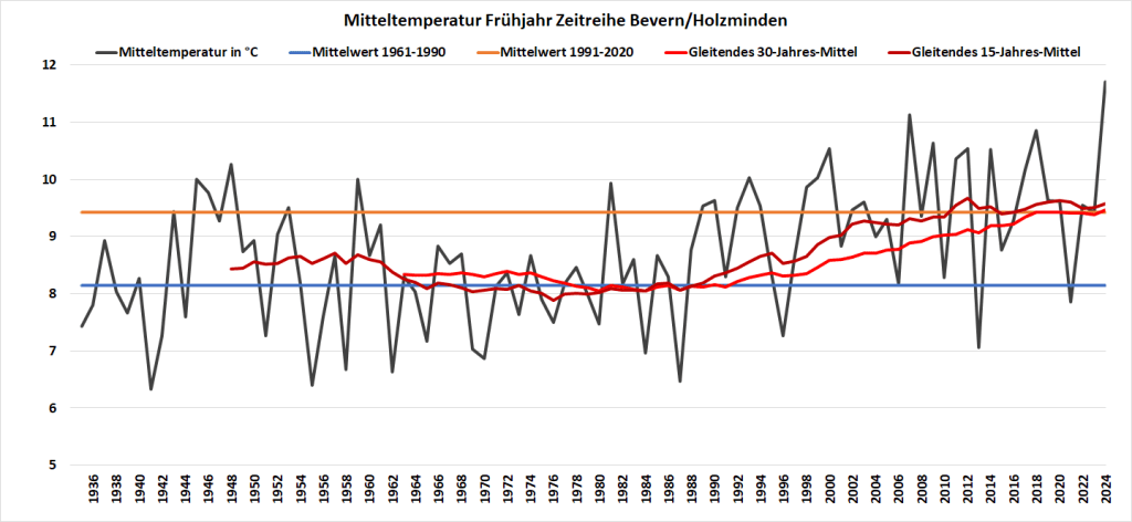 Mit dem Mai endete das meteorologische Frühjahr und es brachte im deutschen Gebietsmittel ebenso wie regional einen neuen Temperaturrekord, zugleich den ersten Jahreszeitenrekord seit 2007. Mit Temperaturen von 11,71 °C in Bevern und 9,64 °C in Silberborn wurden die bisherigen Höchstwerte von vor 17 Jahren um fast 0,6 bzw. knapp 0,4 K übertroffen und die jüngsten 30-jährigen Klimawerte um 2,3 bzw. 2,2 K.