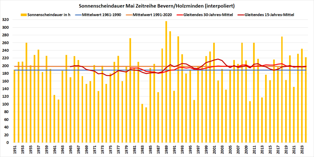 Beim Sonnenschein fällt eine deutlich unterschiedliche Verteilung zwischen der ersten und zweiten Monatshälfte auf: Waren es bis 16. imposante 150 Stunden, kamen danach kaum über 70 Stunden hinzu. Unter dem Strich bilanziert der Mai mit 222 aber noch um 24 Stunden oder 12% über dem Mittel der Jahre 1991-2020.