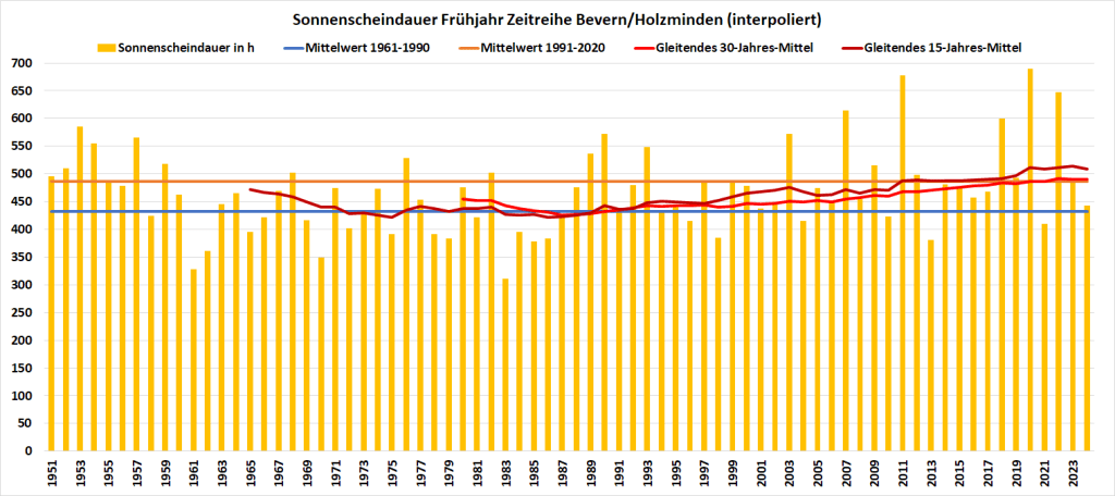 Beim Sonnenschein steht hingehen am Ende wie schon zuvor im Winter ein Minus: Mit rund 442 Stunden wurde das Klimamittel der Jahre 1991-2020 um knapp zehn Prozent bzw. 45 Stunden verfehlt. Damit war es das dritttrübste Frühjahr der letzten 20 Jahre.