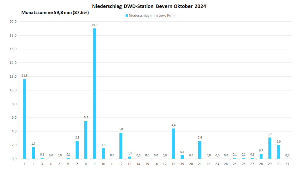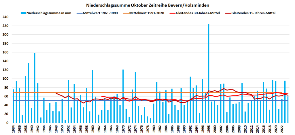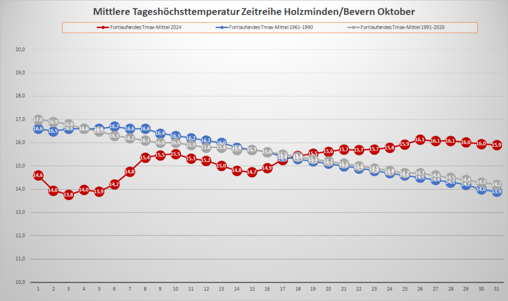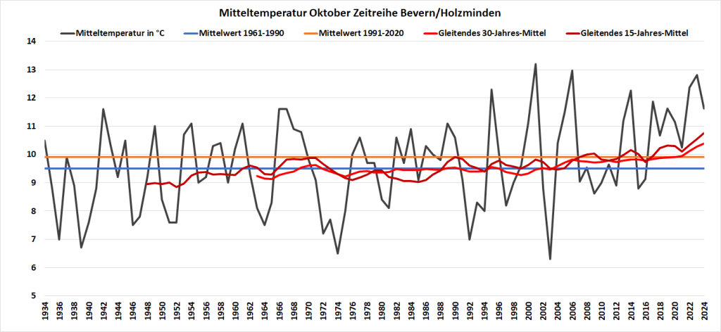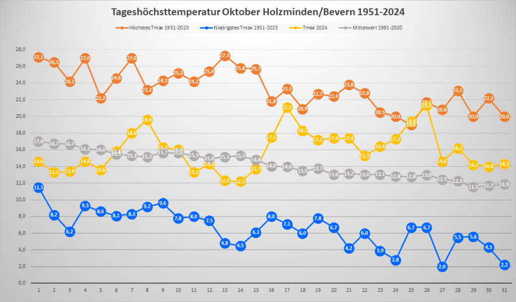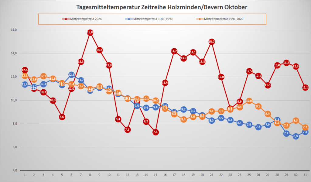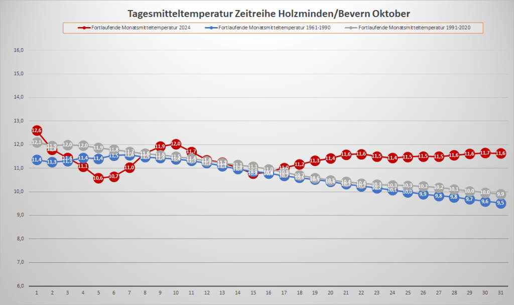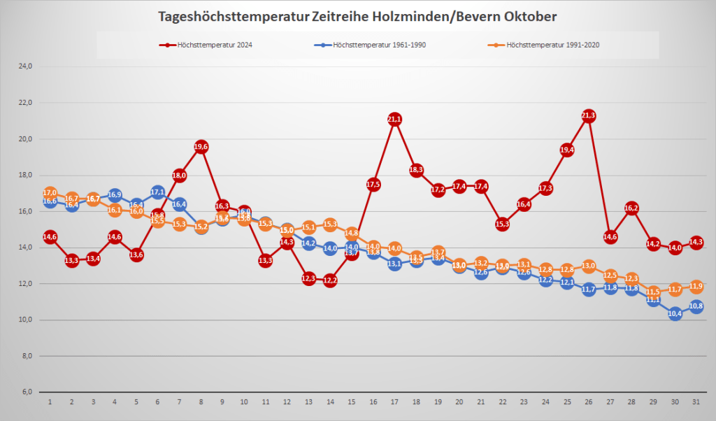 Mit einer Monatstemperatur von 11,63 °C war der Oktober 2024 an der DWD-Klimastation in Bevern um gut 1,7 K wärmer als im Mittel der Jahre 1991-2020. Im Vergleich zum niedrigeren, 30 Jahre älteren Klimawert der Periode 1961-1990 betrug das Plus 2,1 K. Damit war der achte überdurchschnittlich warme Oktober in Folge zugleich der achtwärmste in der Klimareihe Holzminden/Bevern seit Messbeginn 1934. Zweimal wurde in der zweiten Hälfte nochmals die 20-Grad-Marke überschritten, den Monatshöchstwert lieferte der sonnige Nachmittag des 26. mit 21,3 °C. Alle Maxima blieben im zweistelligen Bereich, kühlster Tag war der 14. mit einem Höchstwert von 12,2 °C. Zweimal gab es ganz leichten Bodenfrost am 11. und 12., in zwei Metern Höhe lag der Tiefstwert bei 1,2 °C am Morgen des 12. Oktober.