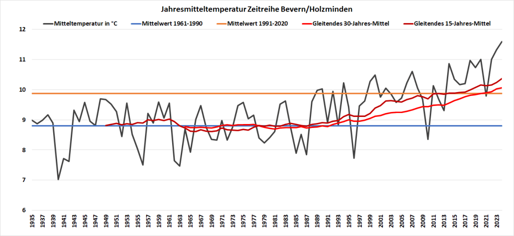 Das Wetterjahr 2024 liegt hinter und – und zum dritten Mal in Folge steht die höchste Jahrestemperatur seit Beobachtungsbeginn in der Schlussbilanz. An der DWD-Station in Bevern liegt der neue Rekord mit 11,6 °C um 0,3 K über der erst vor einem Jahr aufgestellten Marke, gegenüber dem 30-Jahres-Mittel der Jahre 1991-2020 ergibt sich ein stattliches Plus von über 1,7 K. Erstmals landeten alle zwölf Monate über dem Klimamittel der jüngsten Referenzperiode, der letzte Monat unter dem älteren Mittel der Jahre 1961-1990 liegt mit dem Mai 2021 schon über dreieinhalb Jahre zurück. Neue Monatsrekorde gab es im Februar und im März, der Mai war der zweitwärmste seit Aufzeichnungsbeginn und der August immerhin noch der sechstwärmste. Fast schon bescheiden angesichts der markanten Aufwärtsentwicklung der letzten Jahre nimmt sich der heißeste Tag mit einer Höchsttemperatur von 34,1 °C am 13.08. aus, am kältesten wurde es in Bevern am 11.01. mit -9,7 °C.