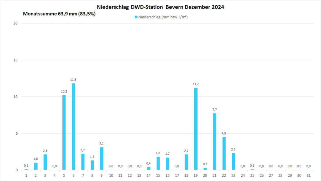 Nach dem sehr nassen Vorjahresmonat mit einer ausgeprägten Hochwasserlage zu Weihnachten hielt sich der Niederschlag in diesem Dezember etwas zurück, ohne dass es dabei auffällig trocken blieb. Die Monatssummen erreichten meist 80-90% des langjährigen Mittels. In Silberborn, wo am meisten Regen (inkl. einiger weniger Schneeflocken) gemessen wurde, waren es mit 102 mm nur drei Millimeter weniger als im Ortsdurchschnitt. In Hellental fielen 91,8 mm, in Amelith 88,7, in Polle 86,2 und in Vorwohle 75,8 mm. Ottenstein meldete 69,1 mm, Hehlen 64,8, Bevern 63,9 und Holzminden 62,1 mm. Schlusslicht war Lüchtringen mit 59,1 mm. Die höchsten Tageswerte lagen mit 12-18 mm am 6. im Nikolausstiefel, die Anzahl der trockenen Tage belief sich meist auf zwölf, die trockenste Phase bildeten die letzten acht Tage ab Heiligabend.