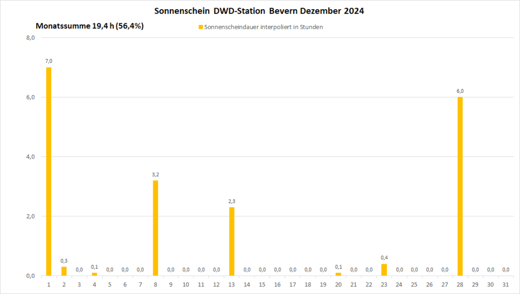 Auf der Suche nach Sonnenschein wurde man in der Region vor allem am 1. und am 28. fündig – diese beiden Tage sorgten zusammen für 13 der insgesamt nur gut 19 Stunden des Monats. An der deutlichen Mehrzahl der Tage (23) zeigte sich die Sonne gar nicht am Himmel, vom langjährigen Durchschnittswert der Monatssumme kam nur etwas über die Hälfte zusammen.