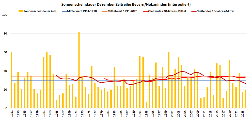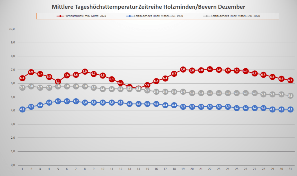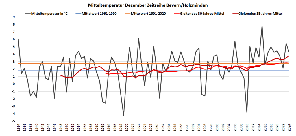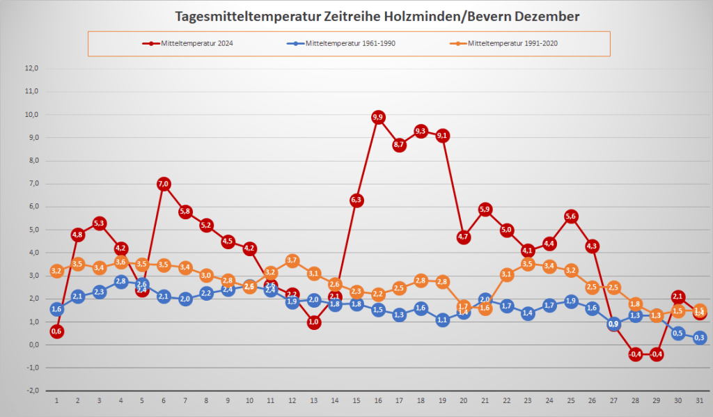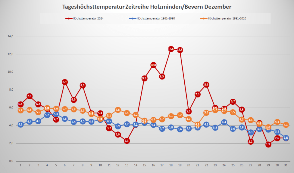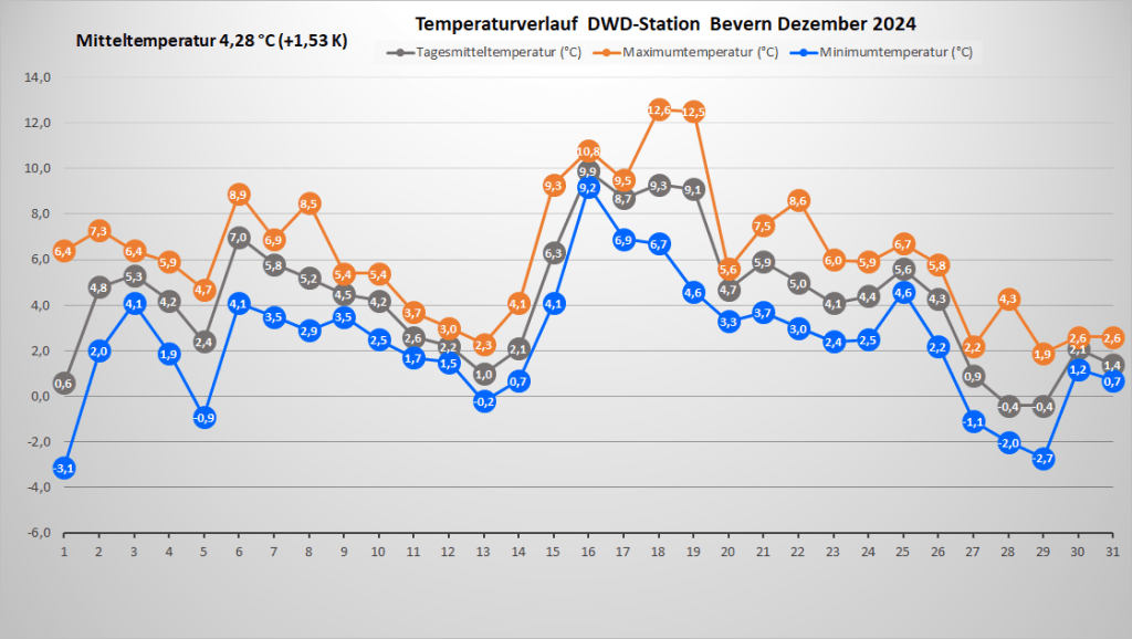 Mit einer Monatstemperatur von 4,28 °C war der Dezember 2024 an der DWD-Klimastation in Bevern um gut 1,5 Kelvin wärmer als im Mittel der Jahre 1991-2020. Im Vergleich zum 30 Jahre älteren Klimawert der Periode 1961-1990 betrug das Plus 2,5 K. Der letzte Dezember mit einer negativen Abweichung zu dieser früheren Klimanorm ist mittlerweile 14 Jahre her. Die tiefsten Temperaturen wurden gleich am 1. mit -3,1 °C in zwei Metern Höhe und -5,3 °C auf fünf Zentimetern Höhe über dem Erdboden gemessen, insgesamt gab es sechs Frost- und sieben Bodenfrosttage. Aber auch nach oben blieben die Ausschläge diesmal vergleichsweise gering: Der Monatshöchstwert von 12,6 °C am 18. war einer von drei Tagen mit zweistelligem Maximum, die mildeste Nacht brachte es auf ein Minimum von 10,3 °C.