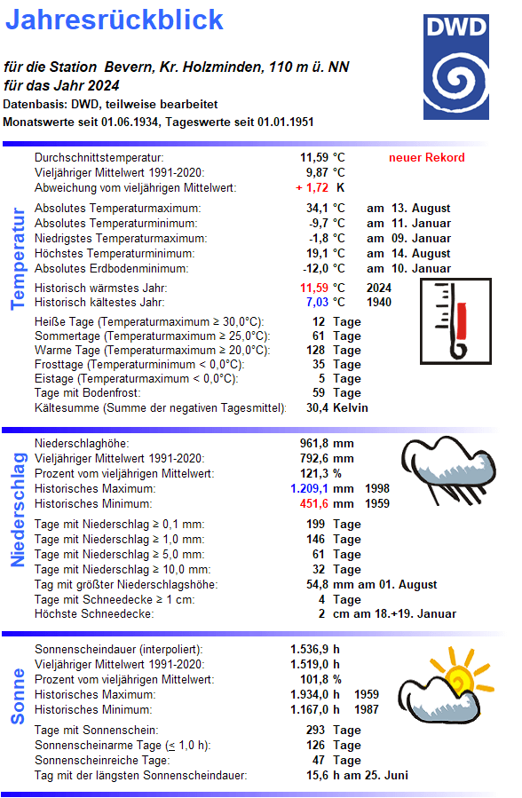 „In Deutschland war noch nie seit Messbeginn 1881 ein Jahr so warm wie 2024. Damit muss der Deutsche Wetterdienst (DWD) nach 2023 erneut ein „Rekordjahr“ melden.“ So beginnt die Pressemeldung des DWD vom 30.12.2024 und ihre Aussage trifft auch auf unsere Heimatregion zu: Sowohl an der Wetterstation des DWD in Bevern, repräsentativ für die Niederungen des Kreises, als auch an der Station in Silberborn, einem privaten Gemeinschaftsprojekt mit der Stadt Holzminden und stellvertretend für den Hochsolling, erreichten die Jahrestemperaturen 2024 neue Höhen. Und das ohne extreme Temperaturspitzen, auch in diesem Punkt unterscheidet sich das lokale Wetter nicht von der bundesweiten Bilanz des DWD.