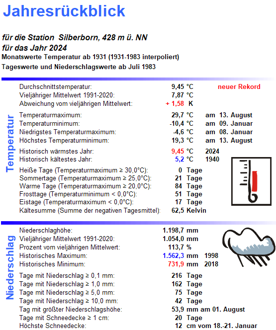 An der Wetterstation in Silberborn auf 428 m gab es ebenfalls einen neuen Jahresrekord: Mit 9,45 °C wurden die langjährigen Mittelwerte um 1,6 K (1991-2020) bzw. 2,65 K (1961-1990) und die bisherige Höchstmarke aus dem Jahr 2022 um 0,2 K übertroffen. Auf einen neuen Februarrekord folgten ebenso wie in Bevern weitere Rekorde im März und im Frühjahr, wärmster Monat war wie im Wesertal der August und kältester der Januar, der für den einzigen wirklich winterlichen Abschnitt des Jahres im Hochsolling mit einer Schneedecke bis 12 cm und fast zwei Wochen Dauerfrost sorgte. Die weiteren Eckdaten des Jahres von der Station sind in der Übersicht aufgeführt.