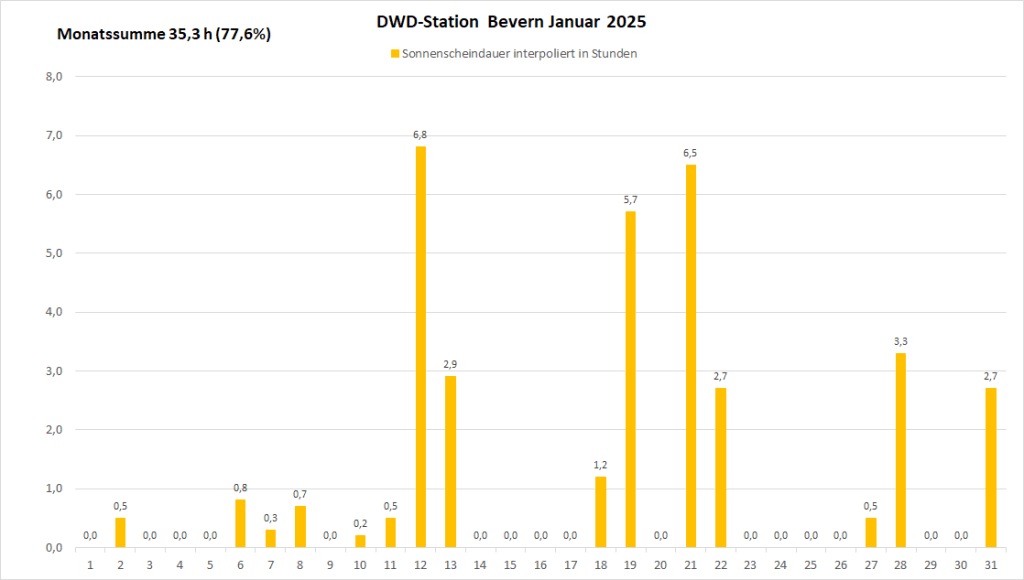 Mit einer Monatstemperatur von 2,51 °C war der Januar 2025 an der DWD-Klimastation in Bevern um 0,66 K wärmer als im Mittel der Jahre 1991-2020. Gegenüber der älteren Norm von 1961-1990 betrug das Plus 2,1 K. Das neue Jahr begann mild, auf einen ersten Temperaturrückgang am ersten Wochenende folgte zum Dreikönigstag ein Tief mit kräftigem Regen und einem markanten Warmluftsektor, der für einen neuen Tagesrekord und zugleich den Monatshöchstwert von 13,6 °C sorgte. Nachfolgend sanken die Werte unter zunehmendem Hochdruckeinfluss ab, in der trockenen zweiten Dekade gab es nachts oft leichten bis mäßigen Frost mit bis zu -6,9 °C in zwei Metern Höhe und bis -8,9 °C über dem Erdboden sowie dreimal leichten Dauerfrost. In der dritten Dekade übernahmen Tiefs mit fast täglichem Regen und wieder deutlich milderer Luft die Wetterregie, erst am Monatsletzten breitete sich wieder Hochdruck mit Nachtfrost aus.