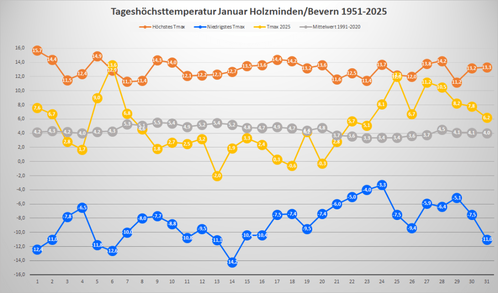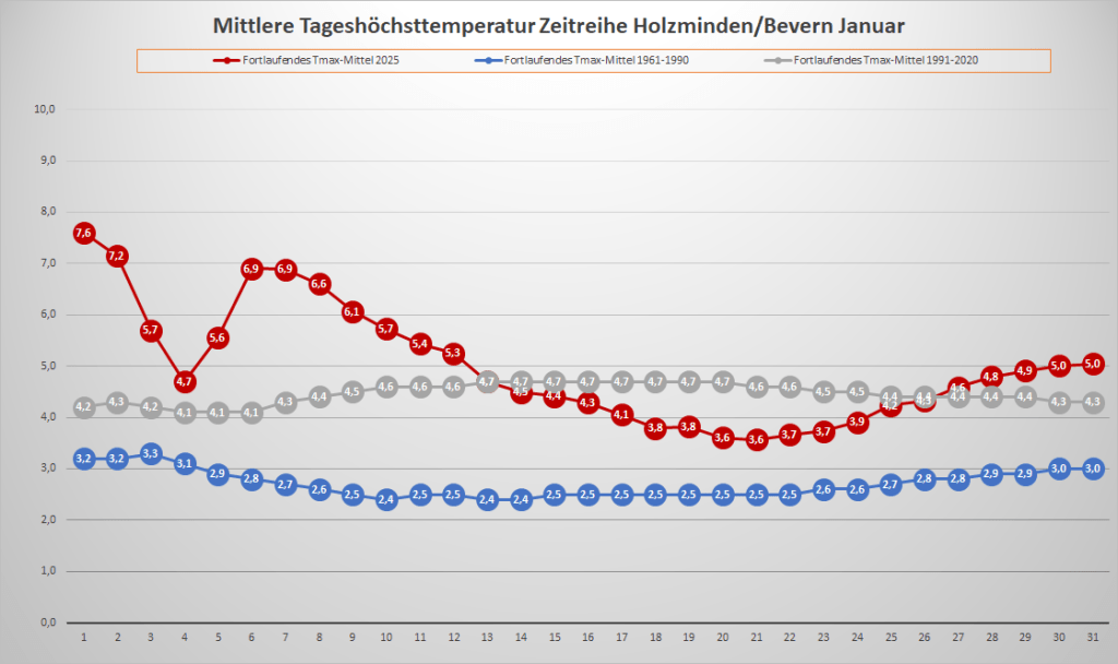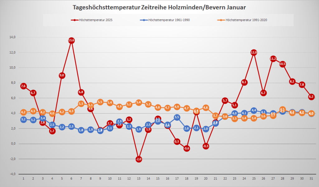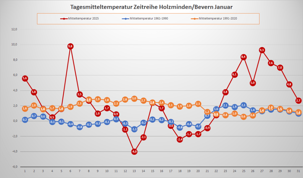 An der Wetterstation in Silberborn betrug die Mitteltemperatur 1,07 °C und das Plus zu den langjährigen Mittelwerten 1,2 K (1991-2020) bzw. 2,7 K (1961-1990) – relativ zum kälteren Hochsollingklima war es also gut ein halbes Grad wärmer als in den Niederungen. Ursache war die die Inversionslage im Laufe der zweiten Dekade mit ihrem Höhepunkt am Wochenende 18./19.01. mit zeitweise bis zu 10 K höheren Werten in Silberborn gegenüber Holzminden zur Vormittags- und frühen Mittagszeit.