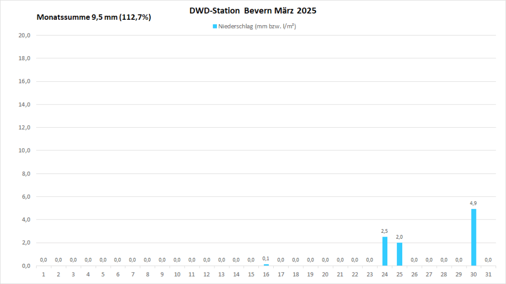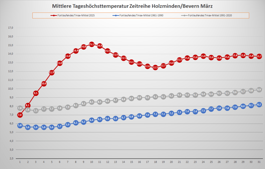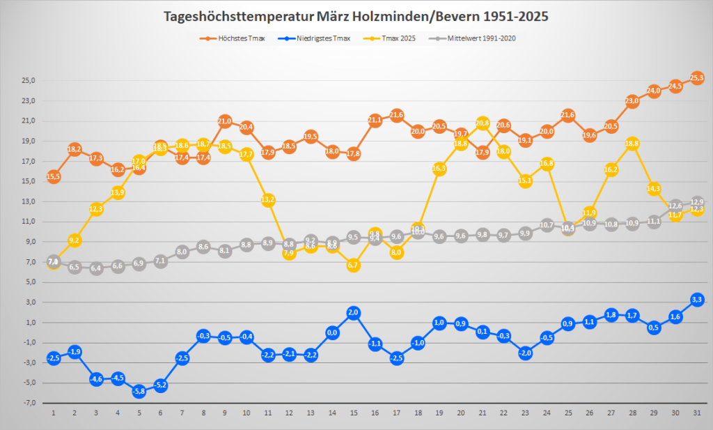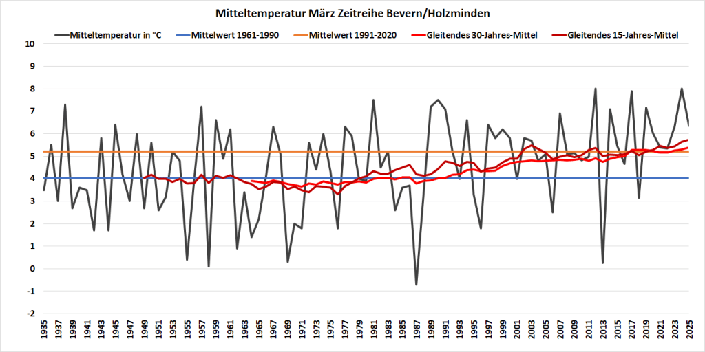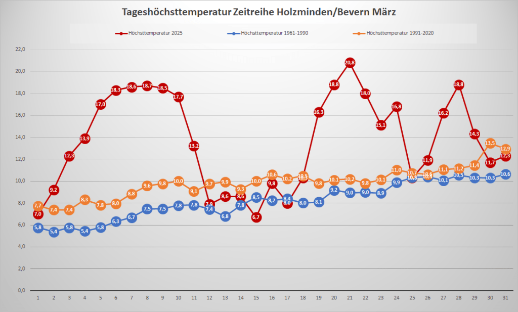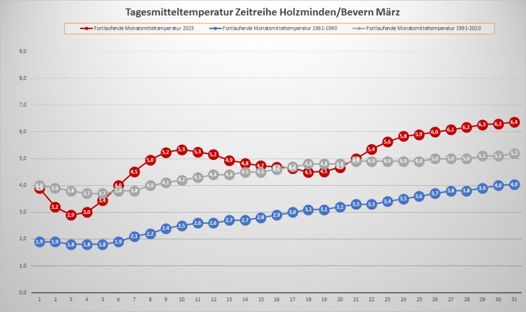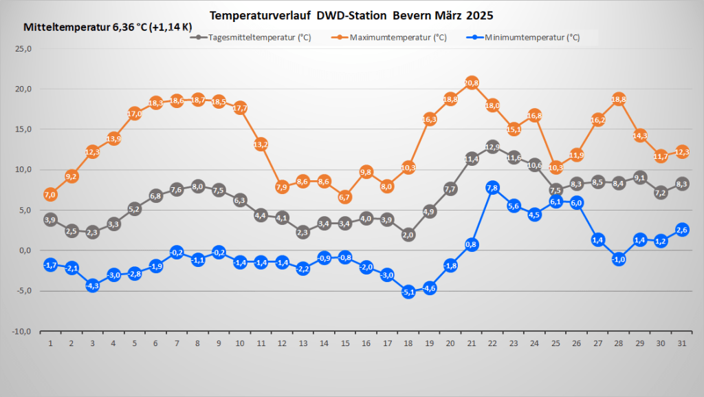 Mit einer Monatstemperatur von 6,36 °C war der März 2025 an der DWD-Klimastation in Bevern um 1,14 Kelvin wärmer als im Mittel der Jahre 1991-2020. Noch deutlicher fällt das Plus mit 2,3 K gegenüber der Periode von 1961-1990 aus, die der Deutsche Wetterdienst weiterhin als Referenz für langfristiges Klimamonitoring verwendet. Ungewöhnlich waren sowohl die Tageshöchstwerte mit vier neuen Tagesrekorden und einem Durchschnitt von 13,7 °C, der eher einem April entspricht, als auch die hohe Anzahl der Frosttage mit 21 in zwei Metern Messhöhe und 26 über dem Erdboden. Der Tagesgang, also die Differenz zwischen Minimum und Maximum, betrug mehrfach rund 20 Grad bzw. Kelvin – bei der Bekleidungsauswahl hieß es dann: morgens Winterjacke, nachmittags T-Shirt. Am wärmsten wurde es am 21. mit 20,8 °C und an 14 Tagen wurde die 15-Grad-Marke überschritten, während es tagsüber am 15. mit maximal 6,7 °C am kühlsten blieb und die kälteste Nacht am 18. mäßigen Luftfrost bis -5,1 °C und Bodenfrost bis -8,3 °C brachte.