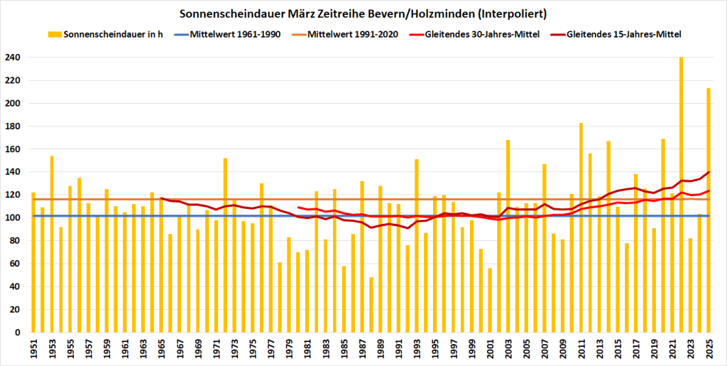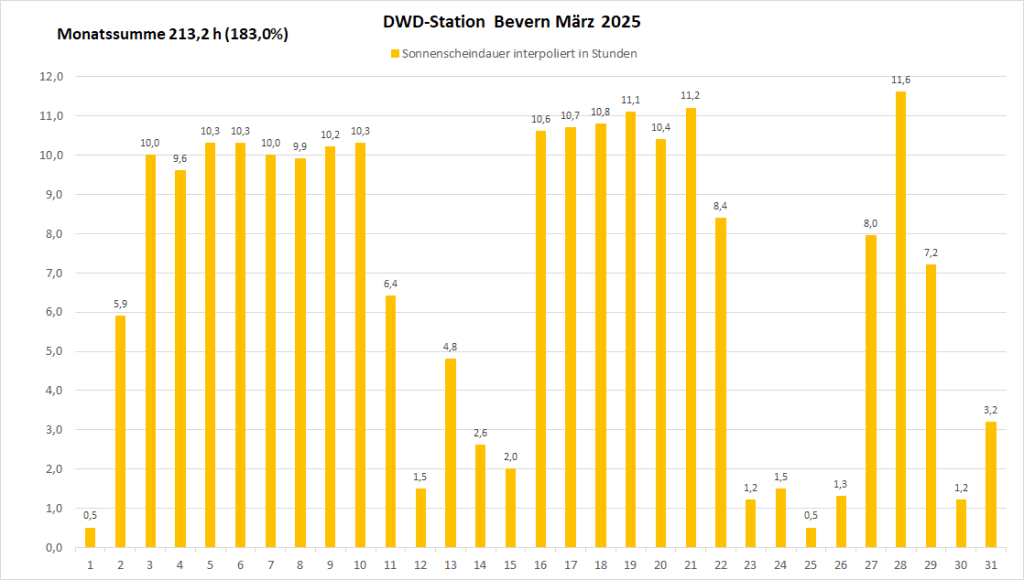 Sonne satt hieß es an vielen Tagen in der Region – und mit ca. 213 Stunden war es nach 2022 mit sogar 240 Stunden der zweitsonnigste März der Historie. Das Klimamittel von 1991-2020 wurde um über 80% übertroffen und selbst das des im Schnitt sonnigsten Monats Juli noch um rund acht Stunden. Auch hierzu bietet der DWD neue Daten: Obwohl vor Ort kein Sonnenschein mit Sensoren am Boden gemessen wird (nächster Standort ist Lügde-Paenbruch), gibt es inzwischen aktuelle und historische Werte für den Standort Bevern, die mit Messungen in der Umgebung (wie Lügde) und anhand von Satellitenbildern zur Bewölkung in einem komplexen Verfahren errechnet werden. Was die einzelnen Tageswerte angeht, besteht hier aber noch Verbesserungspotenzial, wie erste Auswertungen zeigen. So kommt der DWD im März für die „Pseudostation“ Bevern nur auf 205 Stunden.