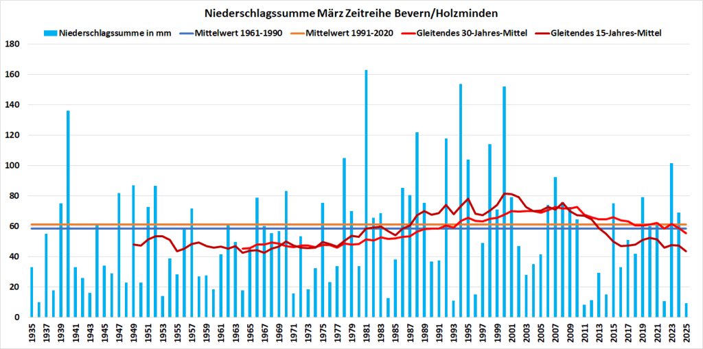 Die Analyse der Großwetterlagen über Europa zeigt zu Monatsbeginn eine Hochdruckbrücke, anschließend ein ebenfalls hochdruckgeprägte Süd-, später Südostlage mit deutlichem Temperaturanstieg tagsüber. Mit einem Wechsel auf nördliche Winde wurde es zu Beginn der zweiten Dekade wieder kühler und dazu machte sich schwacher Tiefdruckeinfluss bemerkbar, der aber so gut wie keinen Regen brachte, so dass es zur Monatsmitte vielerorts noch vollständig trocken geblieben war. Wieder zunehmender Hochdruckeinfluss und eine erneute Südlage brachten ab dem Ende der zweiten Dekade neben viel Sonnenschein, anhaltender Trockenheit und wieder deutlich ansteigenden Temperaturen im Verlauf auch wieder Staub aus der Sahara mit – ein mittlerweile im Frühjahr regelmäßig auftretendes Wetterphänomen. In diese Phase fiel auch die Zufuhr sehr trockener Luft mit nachmittäglicher relativer Feuchte von bis zu unter 30%. Mit einer Kaltfront kam zu Beginn der letzten Woche zumindest etwas Niederschlag auf, mehr als wenige Millimeter waren aber nicht drin. Nach einer weiteren Hochdruckbrücke brachte der Sonntag der Zeitumstellung am 30. Höhenkaltluft aus Norden mit, in der sich einzelne lokale Schauer bildeten, die am Standort Bevern einen neuen Trockenheitsrekord noch verhinderten, während an anderen Standorten der trockenste März seit Aufzeichnungsbeginn nicht mehr in Frage gestellt wurde. Damit fiel nahezu der gesamte Monat in das Schema „Blocking“, bei dem blockierende hochreichende Hochdruckzellen die Tiefs vom Atlantik fernhalten. Insgesamt gab es 2025 im ersten Quartal nur eine kurze Westlage – das geringste Auftreten seit 1996.