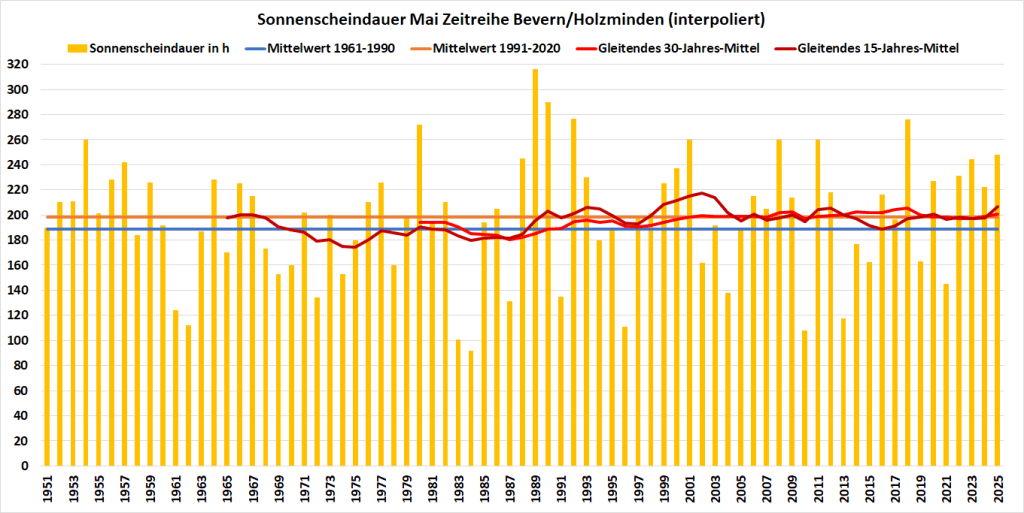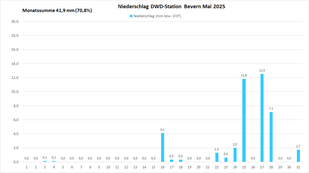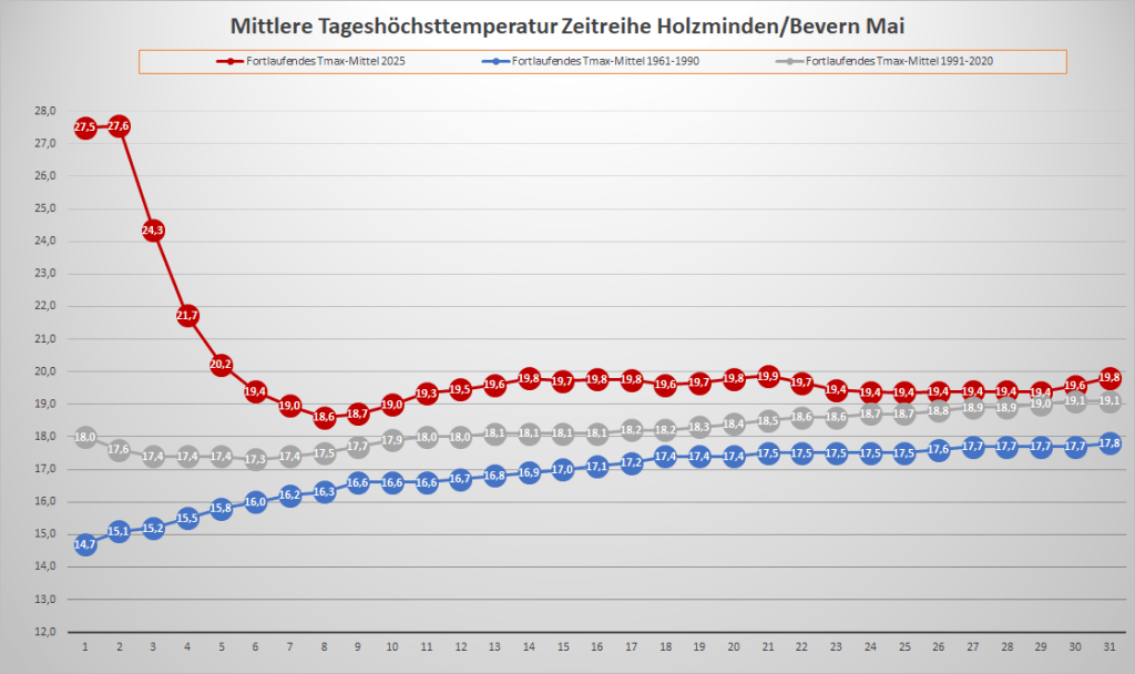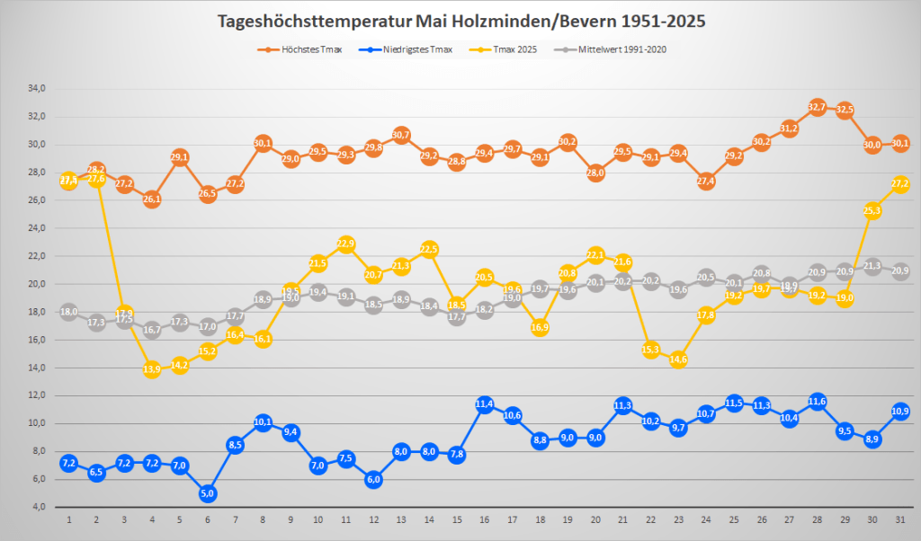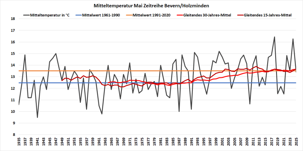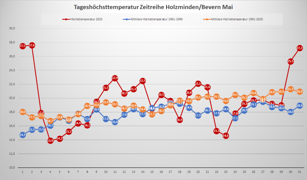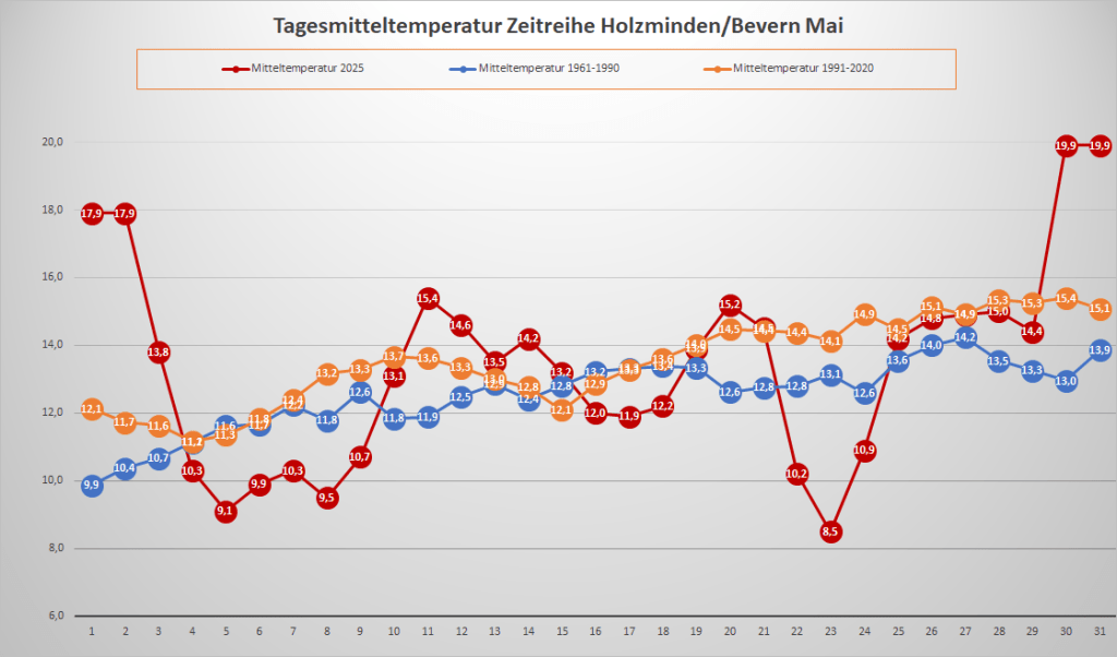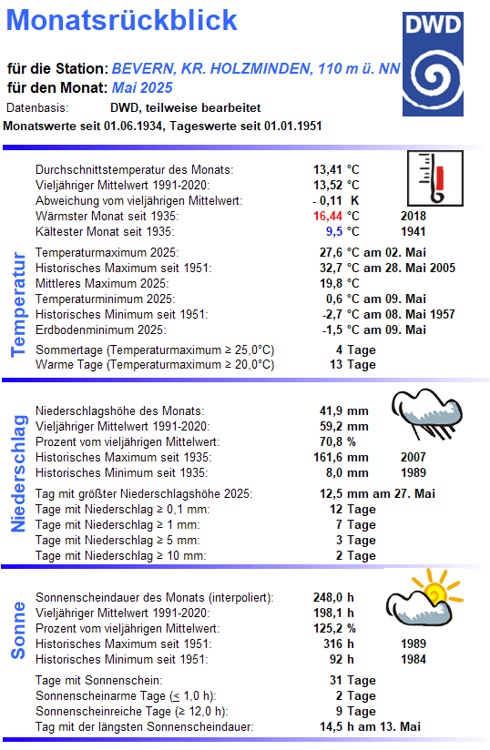 Mit einer Monatstemperatur von 13,41 °C war der Mai 2025 an der DWD-Klimastation in Bevern um 0,11 Kelvin kühler als im Mittel der Jahre 1991-2020, im Vergleich zur Klimaperiode von 1961-1990 bedeutet dies ein Plus von gut 0,9 K. Damit war es seit dem Rekord von 2018 (16,44 °C) der fünfte von sieben Maien, der das jüngere Klimamittel verfehlte – so oft wie kein anderer Monat in diesem Zeitraum. Am wärmsten wurde es gleich am 2. mit einem Höchstwert von 27,6 °C, ab 4. folgte eine Reihe von Tagen, an denen die 15-Grad-Marke kaum mehr überschritten oder sogar verfehlt wurde. Auch wenn es für Luftfrost nicht mehr ganz reichte, lagen die Tiefstwerte oft im niedrigen einstellen Bereich mit einem Minimum von 0,6 °C am 9.; letzter Bodenfrost wurde am 23. und damit ungewöhnlich spät gemessen.
