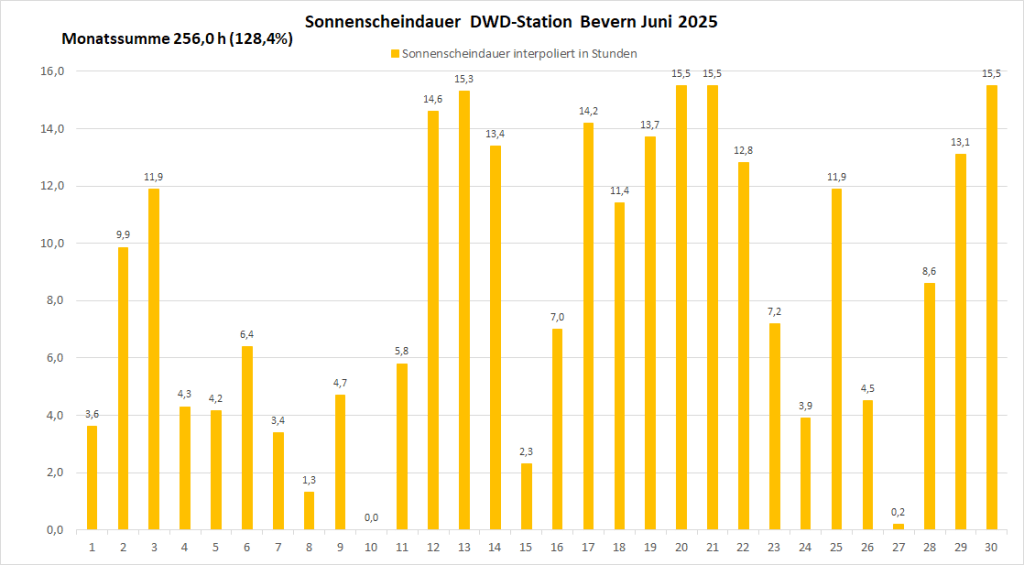 Beim Sonnenschein ergibt sich das seit Februar gewohnte Bild mit einem deutlichen Plus gegenüber den 30-Jahres-Mitteln, diesmal brachten 256 Stunden einen „Überschuss“ von fast 57 Stunden oder gut 28%. Dabei war es wie schon im Mai vor allem ein sehr sonniger Abschnitt im Laufe des Monats, der bei ansonsten wechselnd bewölkten und teils auch recht trüben Tagen wesentlich zum Monatsergebnis beitrug – in diesem Fall brachten allein die elf Tage vom 12. bis 22. fast 136 Stunden. Nach ein paar wolkigeren Tagen gab es zum Ende wieder „Sonne satt“ mit der maximal messbaren Tagessumme von 15,5 Stunden am Monatsletzten.