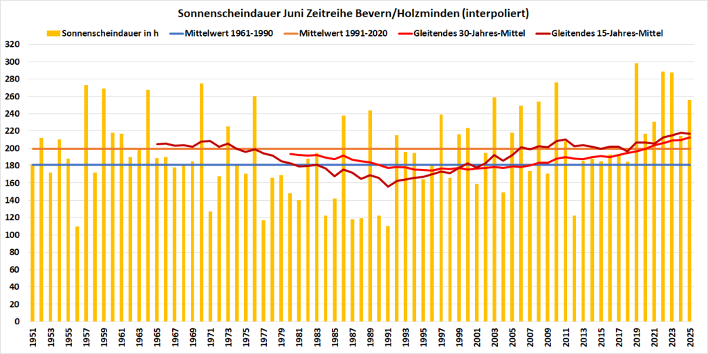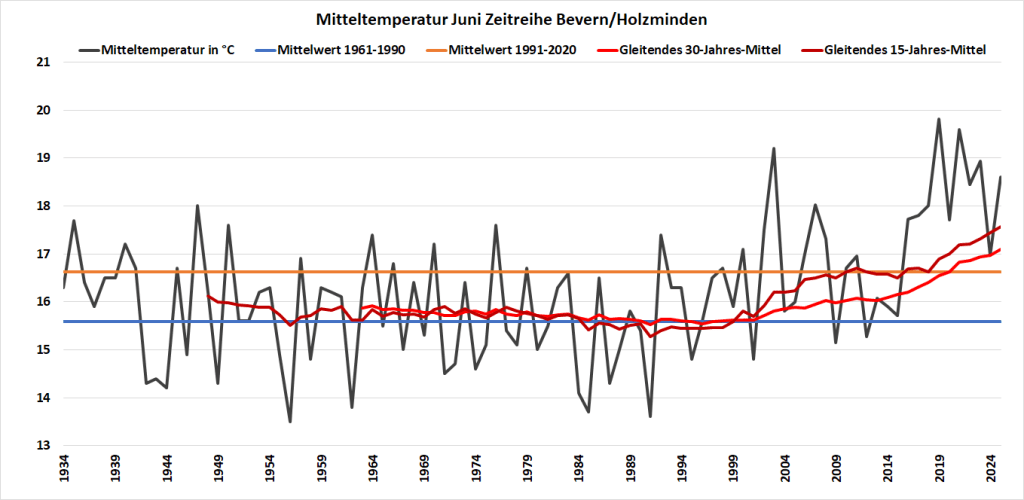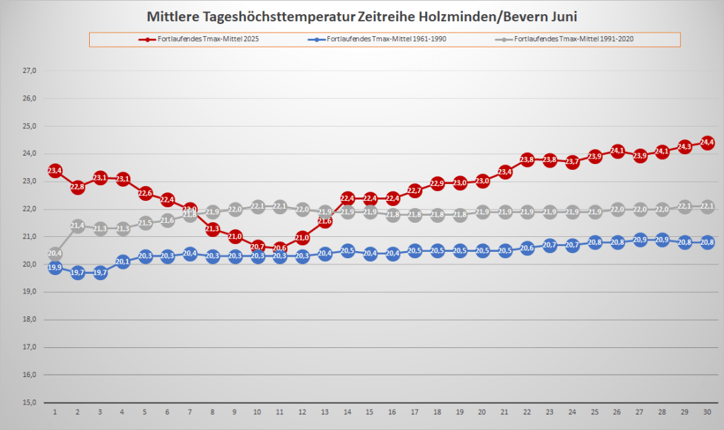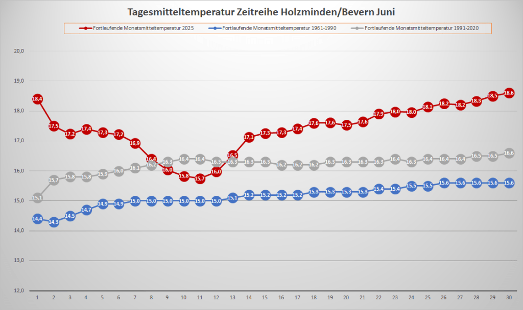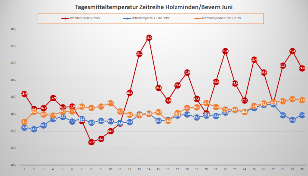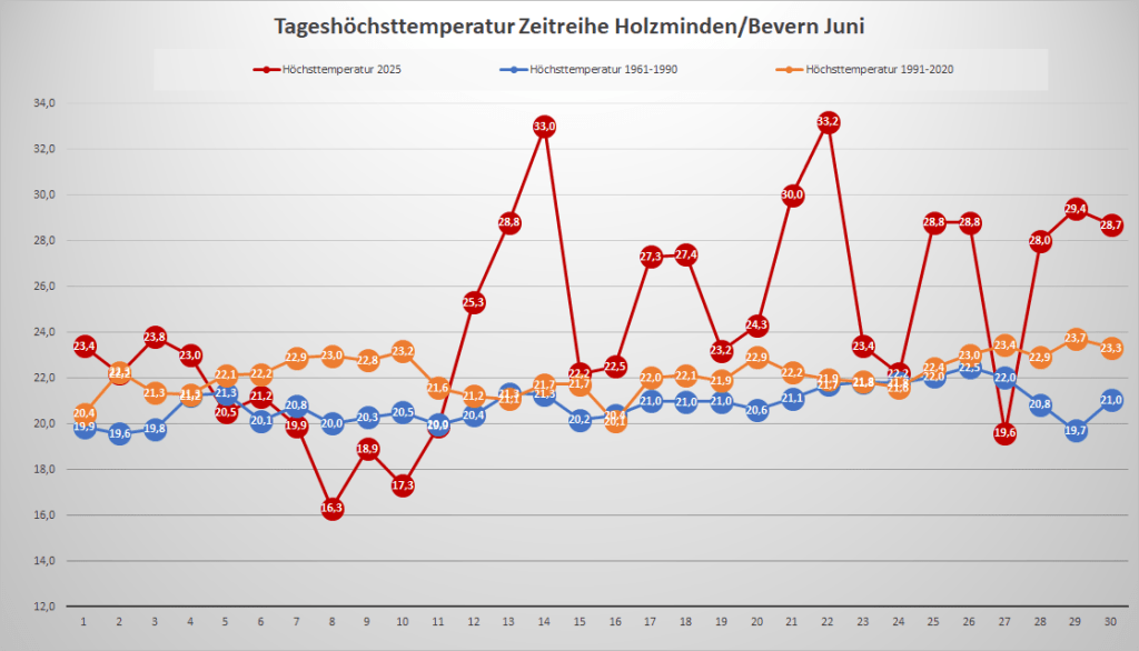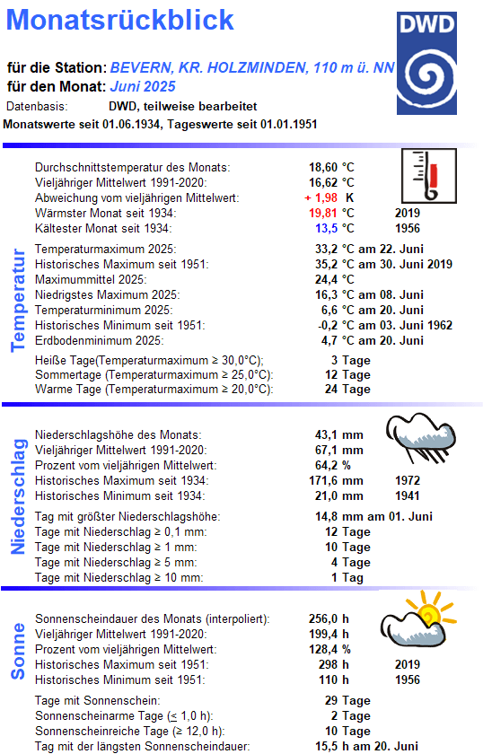 Mit einer Monatstemperatur von 18,60 °C war der Juni 2025 an der DWD-Klimastation in Bevern um fast genau 2 Kelvin wärmer als im Mittel der Jahre 1991-2020, im Vergleich zur Klimaperiode von 1961-1990 bedeutet dies ein Plus von exakt 3,0 K. Damit war es der fünftwärmste Juni seit Beginn der Aufzeichnungen für die Klimareihe Holzminden/Bevern im Sommer 1934. Drei der vier noch wärmeren stammen aus den Jahren 2019-2023, der älteste aus dem Rekordsommer 2003. Das erste Drittel verlief nur mäßig warm mit Höchstwerten zwischen meist 19 und 23 Grad, am kühlsten blieb es am Pfingstsonntag mit maximal 16,3 Grad. Nachfolgend wurde die 20-Grad-Marke nur noch einmal um ein paar Zehntel am 27. verfehlt, ansonsten lagen die Höchstwerte zwischen 22 und dem Monatsmaximum von 33,2 Grad am 22. mit jeweils überdurchschnittlichen zwölf Sommer- und drei heißen Tagen. Eine Hitzewelle blieb aber (noch) aus und die meisten Nächte brachten Abkühlung in den niedrigen zweistelligen oder in gut einem Drittel der Fälle sogar bis in den einstelligen Bereich.