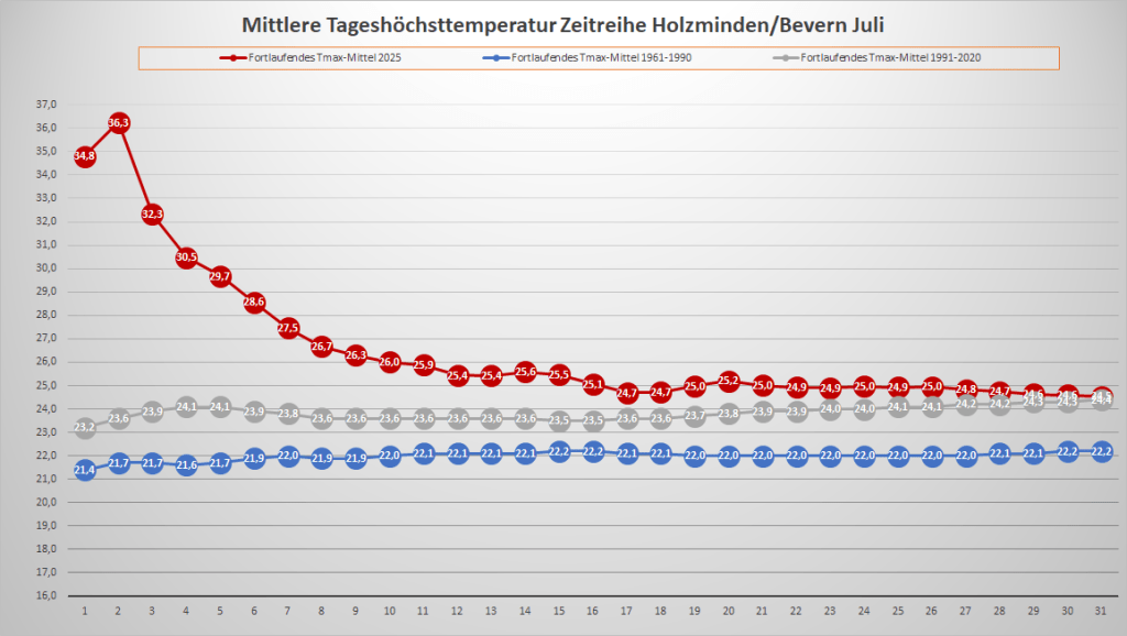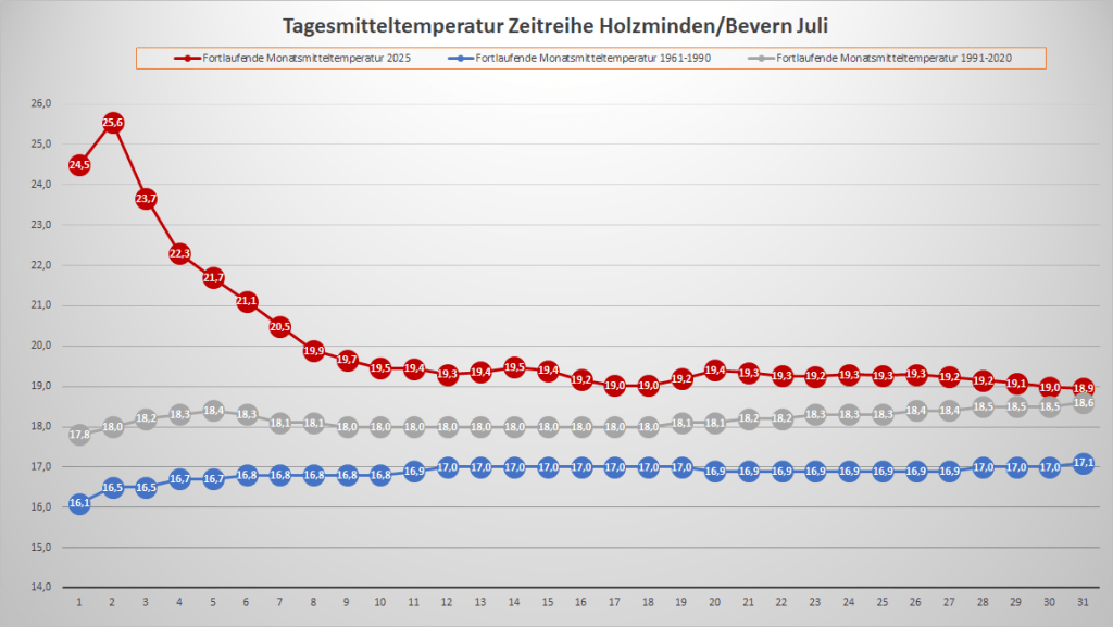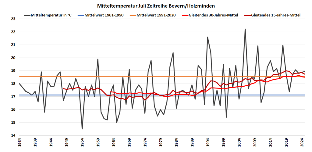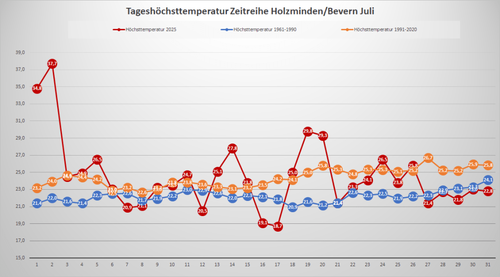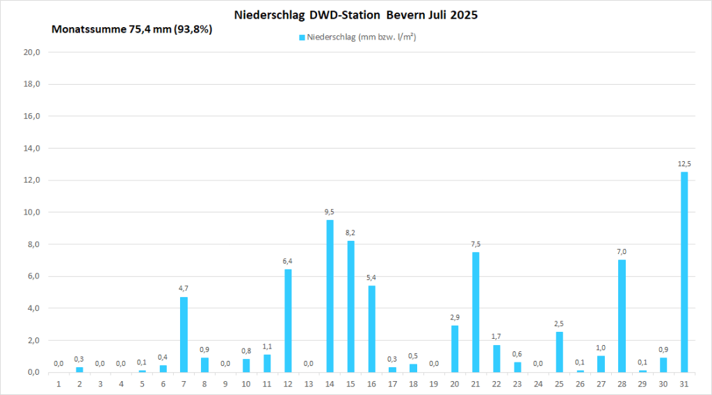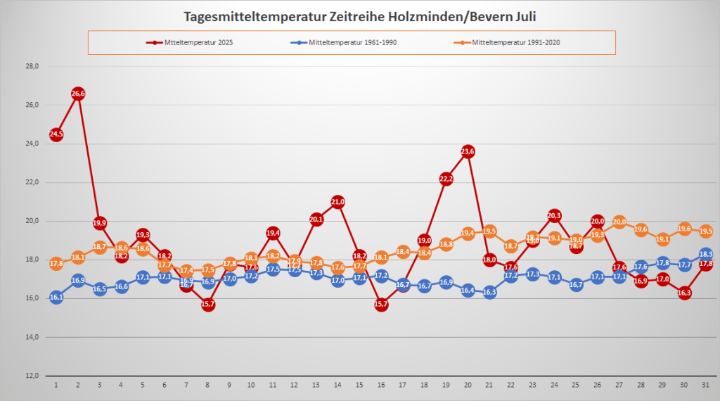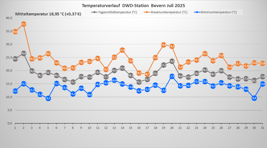 Mit einer Monatstemperatur von 18,95 °C lag der Juli 2025 an der DWD-Klimastation in Bevern um knapp 0,4 K über dem Mittel der Jahre 1991-2020 und gut 1,8 K über dem Durchschnitt der Zeit von 1961-1990, die repräsentativ für die Jahre vor Einsetzen der globalen Erwärmung Ende der 1980er Jahre ist. Damit war es der fünfte Juli in Folge, der innerhalb eines sehr schmalen Korridors zwischen 18,7 und 19,1 °C landete. Die kurze, aber sehr kräftige Hitze zu Beginn des Monats brachte mit 37,7 °C den dritthöchsten bisher in Bevern gemessenen Wert – zugleich war der zweite heiße Tag am 2. aber auch schon der letzte für den gesamten Monat. Die Zahl der Sommertage mit einer Höchsttemperatur von mindestens 25,0 °C blieb mit zehn unterdurchschnittlich, wirklich kühl wurde es aber auch kaum einmal: Nur zwei Tage blieben unter der 20-Grad-Marke. Die Tiefstwerte lagen oft zwischen elf und 16 Grad, etwas aus dem Rahmen fiel die Nacht zum 20.07. mit 19,9 °C – dem höchsten Minimum seit fast fünf Jahren.