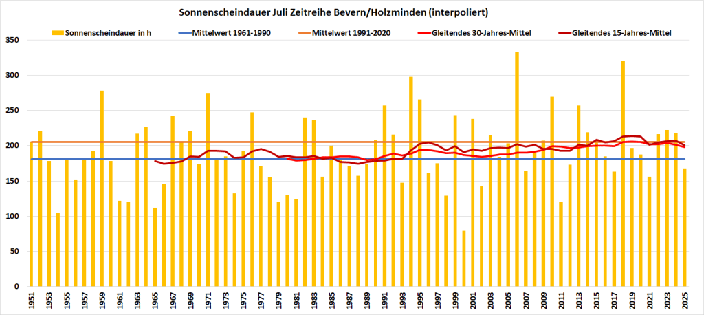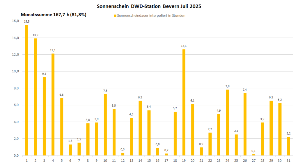 Weniger komplex gestaltet sich die Auswertung der Sonnenscheindauer, sie lag mit 168 Stunden klar und erstmals seit Januar wieder unter dem Klimawert von 1991-2020, der um fast ein Fünftel verfehlt wurde. Noch weniger gab es im Juli zuletzt vor vier Jahren mit 156 Stunden. Der erste Tag war mit 15,5 Stunden zugleich der (mit Abstand) sonnigste, danach schafften es nur noch drei Tage über die Marke von zehn Stunden, davon nur noch einer nach dem Monatsvierten. Die Sommerferien verliefen damit bisher alles andere als sonnig und daran wird sich wohl erst in der letzten Ferienwoche etwas zum Besseren ändern.