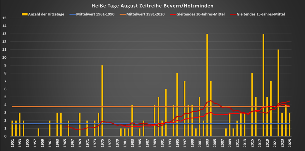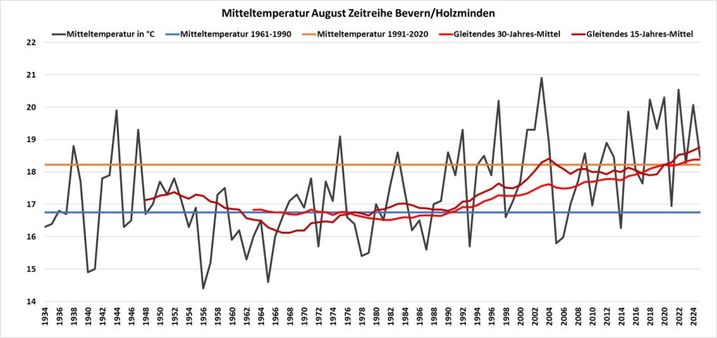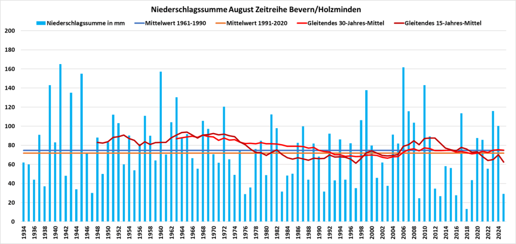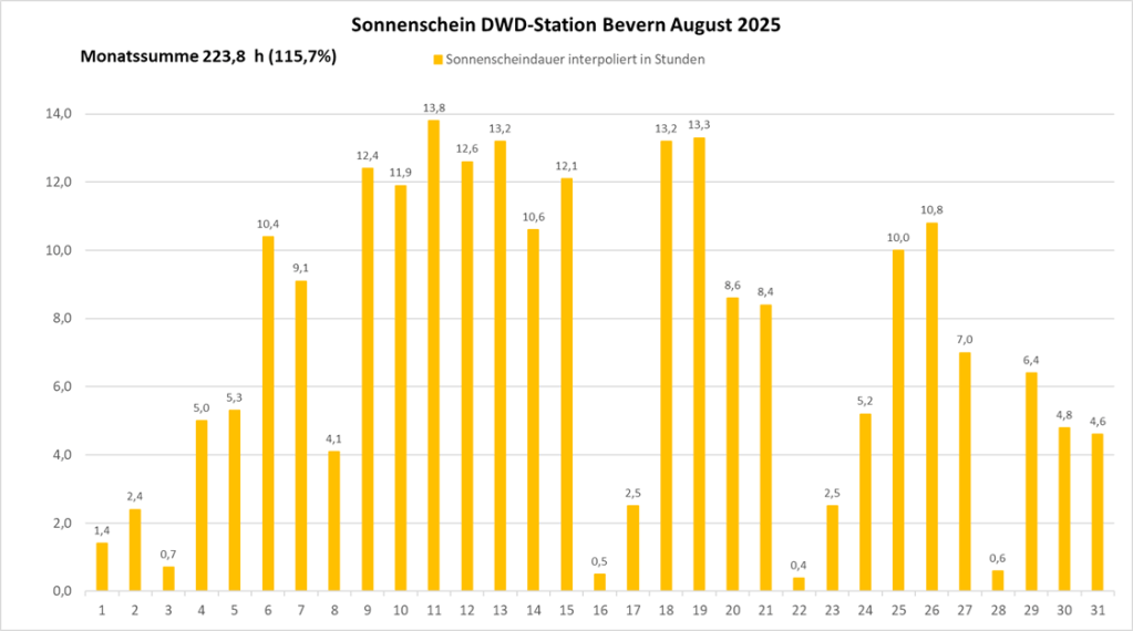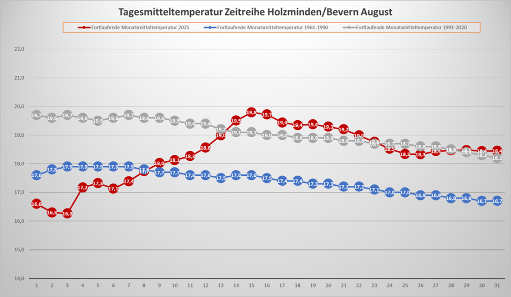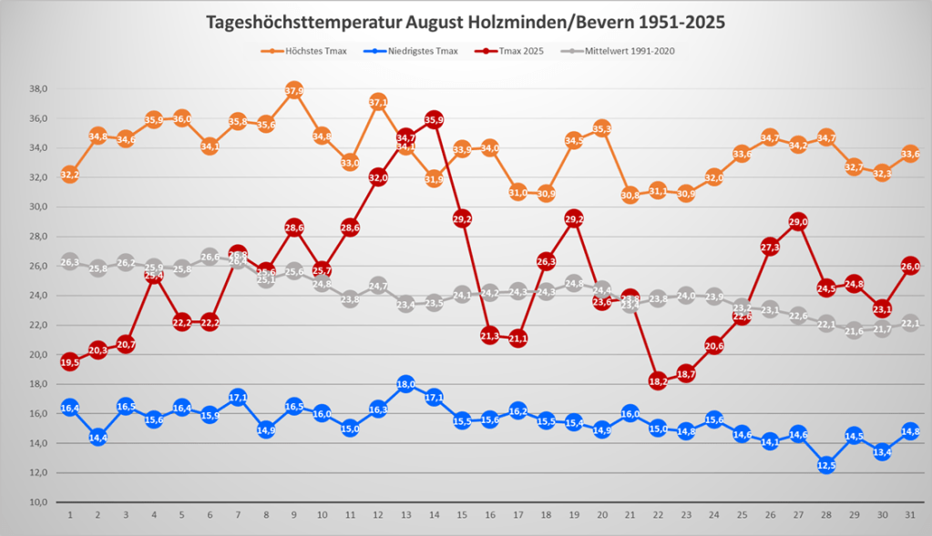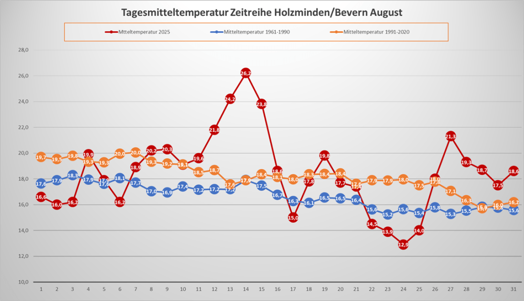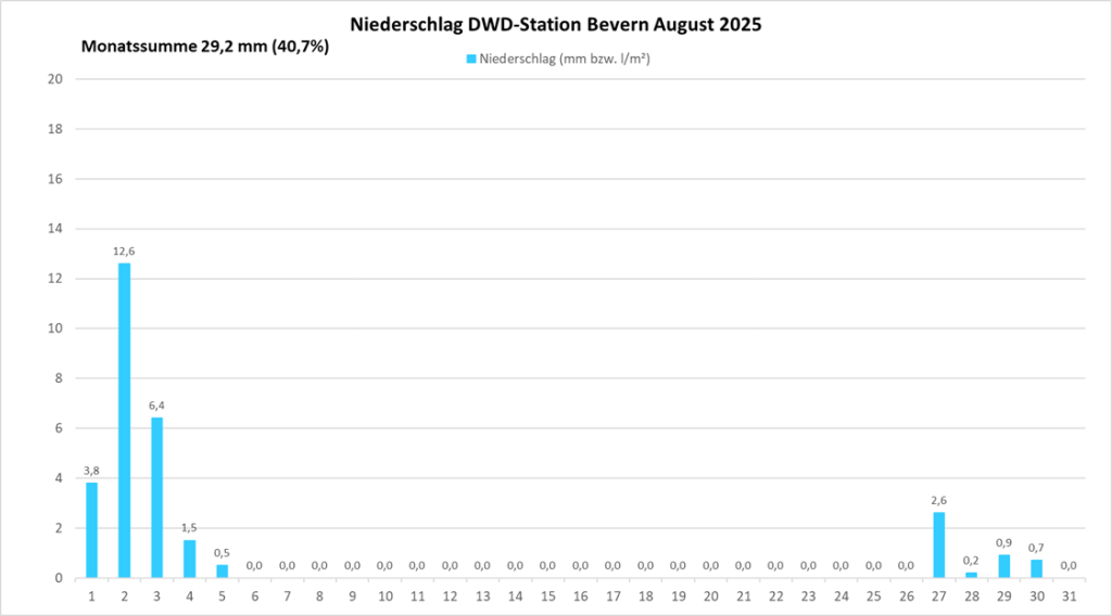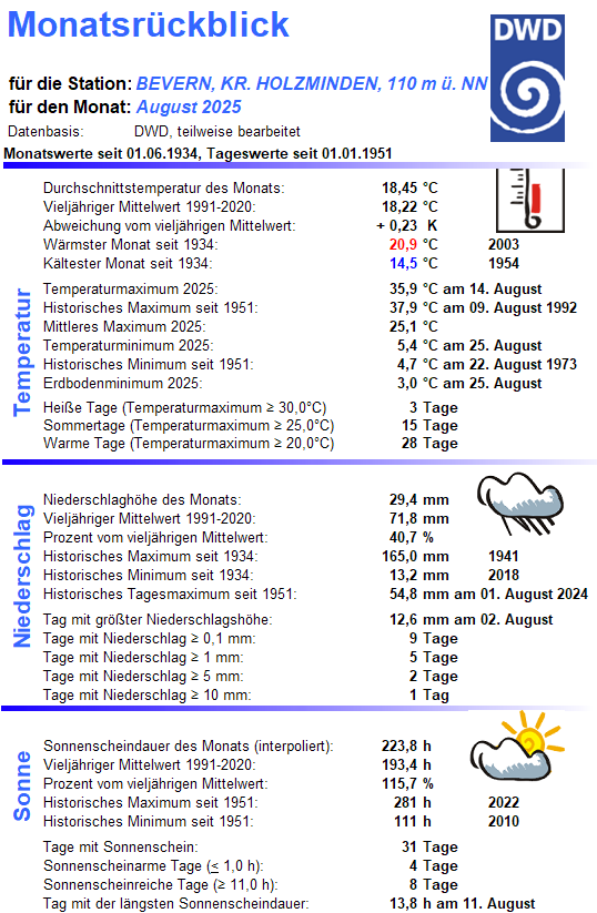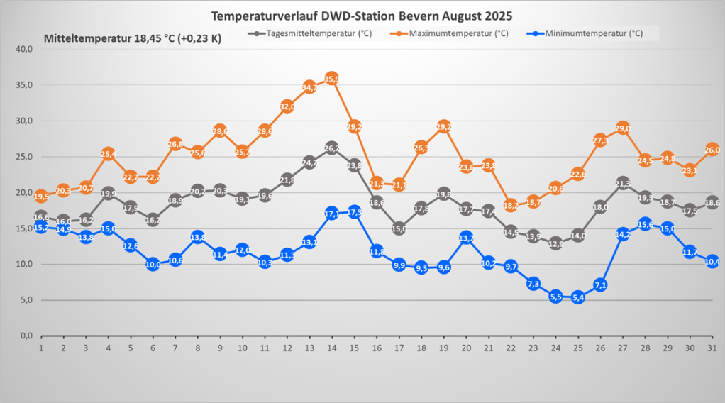 Mit einer Monatstemperatur von 18,45 °C lag der August 2025 an der DWD-Klimastation in Bevern um 0,23 K über dem Mittel der Jahre 1991-2020 und um 1,7 K über dem Durchschnitt der Zeit von 1961-1990. Nach einem mäßig warmen Start kletterten die Höchstwerte ab Ende der ersten Woche wieder in den Sommertagsbereich, ab 12.08. folgte eine kurze, aber recht knackige Hitzewelle mit drei heißen Tagen (die erste seit immerhin drei Jahren) und einem Maximum von 35,9 °C. In der zweiten Monatshälfte lagen die Höchstwerte meist zwischen 21 und 26 Grad. In Summe wurden 15 Sommertage mit mindestens 25,0 °C gemessen, das mittlere Maximum erreichte 25,1 °C und lag damit fast genau im Schnitt der letzten 25 Jahre. Empfindlich kühl wurden die Nächte zu Beginn der dritten Dekade mit Tiefstwerten im klar einstelligen Bereich, darunter zweimal nur wenige Zehntel über der Fünf-Grad-Marke und damit nicht allzu weit entfernt vom Monatsrekord von 4,7 °C, der aus dem Jahr 1973 stammt.