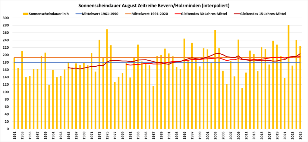 So sehr das Jahr 2025 bisher mit Regen geizt, so großzügig zeigt es sich seit Mitte Februar (bis auf die Delle im Juli) beim Sonnenschein. Der August steuerte ca. 224 Stunden zur Jahreszwischensumme von fast 1.490 Stunden bei – damit fehlen vier Monate vor Schluss nur noch 30 Stunden bis zum Erreichen des Jahresdurchschnitts von ca. 1.520 Stunden. Für den August ergibt sich ein Plus von 30 Stunden oder 16% zum Mittel der Jahre 1991-2020. Nach trübem Monatsbeginn zeigte sich die Sonne zunächst mal mehr, mal weniger häufig, bevor am 9. die beständigste Phase begann, die an vielen Tagen zwischen zwölf und fast 14 Stunden eine Wochensumme von 87 Stunden brachte. Die zweite Monatshälfte war dann von einem wechselhaften Auf und Ab gekennzeichnet.