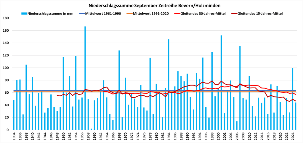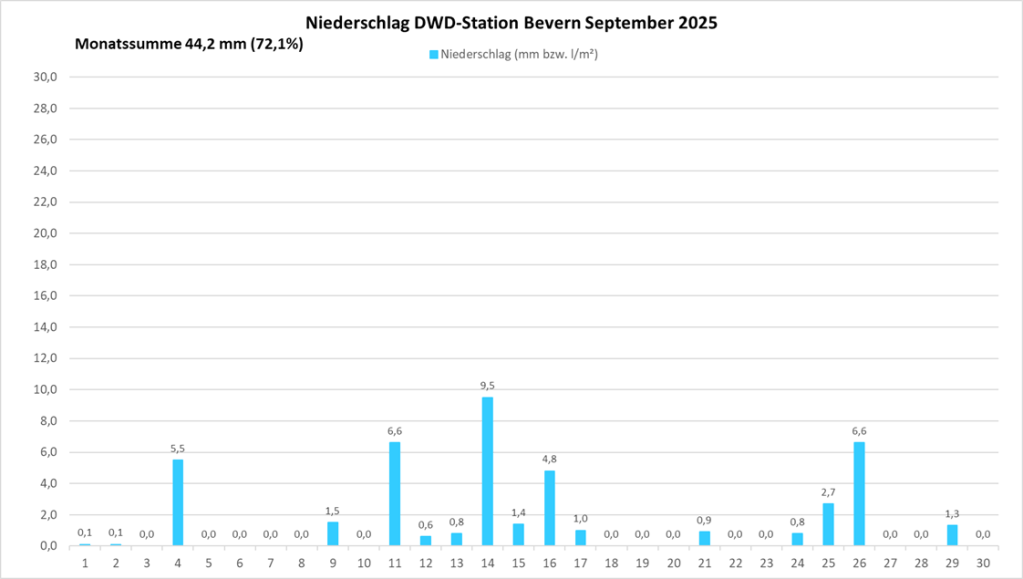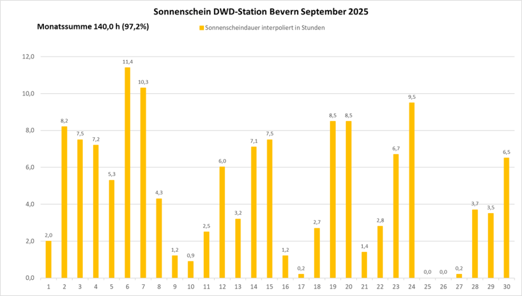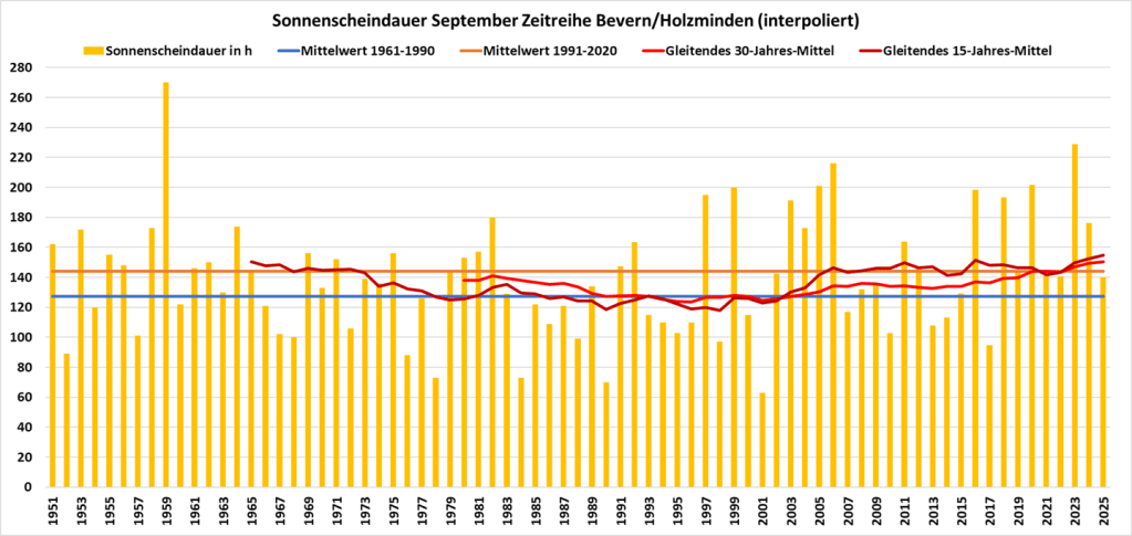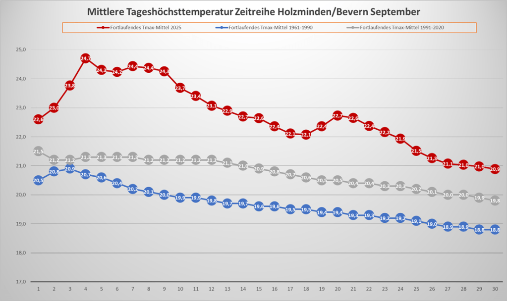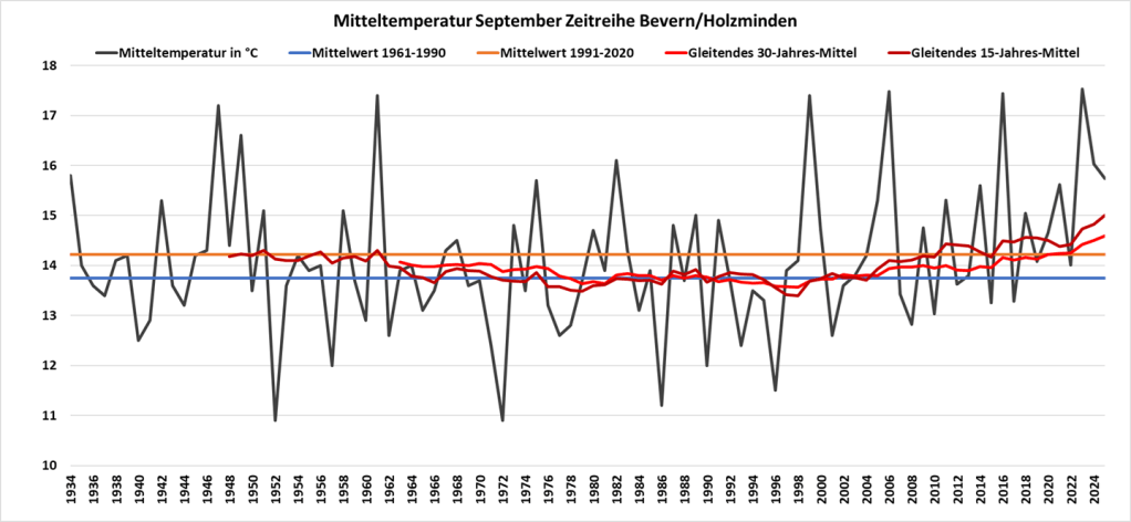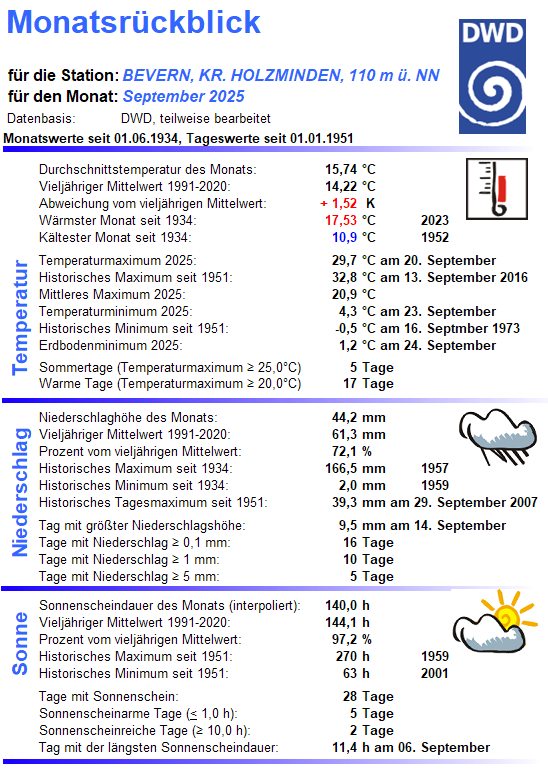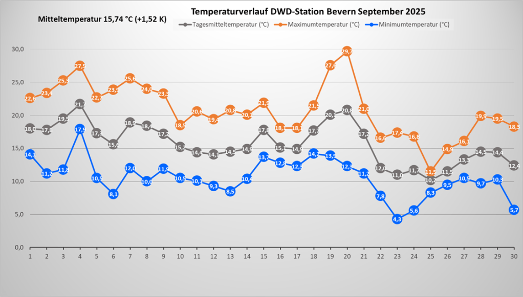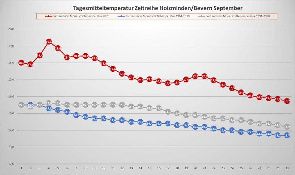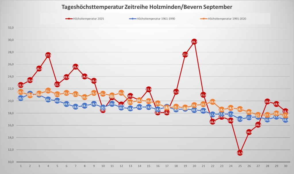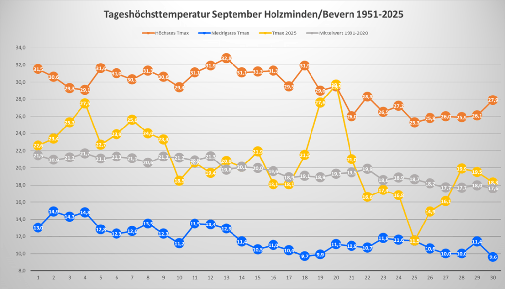 Mit einer Mitteltemperatur von 15,74 °C war der September 2025 an der DWD-Station in Bevern um 1,52 K wärmer als im Mittel der Jahre 1991-2020, was einem Plus von fast genau zwei Grad gegenüber der älteren Klimanorm von 1961-1990 entspricht. Spätsommerlich warm präsentierte sich die erste Woche, nachfolgend pendelten die Werte bis nach Monatsmitte um die langjährigen Durchschnittswerte herum. Ein kurzes, aber kräftiges (und wohl letztes) Aufbäumen des Sommers ließ die Tageshöchstwerte zum Ende der zweiten Dekade nochmals deutlich ansteigen. Am 20. wurde mit einem neuen Tagesrekord von 29,7 °C sogar ein heißer Tag nur um drei Zehntel verfehlt. Es folgte eine deutliche Abkühlung und mit Beginn des astronomischen Herbstes am 22. verabschiedeten sich Höchstwerte von über 20 Grad zumindest für den Rest des Monats (vielleicht auch bis ins nächste Frühjahr). Stattdessen gab es einige frische Nächte und am 25., dem kühlsten Tag des Monats, kam das Maximum nicht über 11,5 °C hinaus. Zum Ende wurde es dann wieder ein ganzes Stück milder, so dass der Monat unter dem Strich zwar weniger warm bilanziert als seine beiden Vorgänger, mit Platz elf aber die Top Ten der wärmsten September in der Messreihe Bevern/Holzminden ab 1934 aber nur knapp verfehlte.