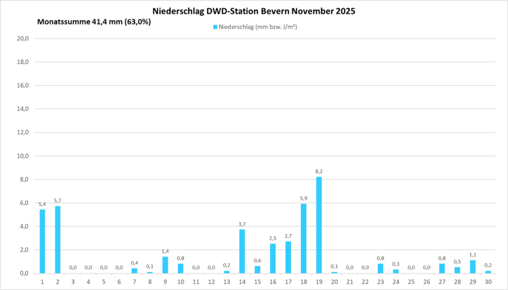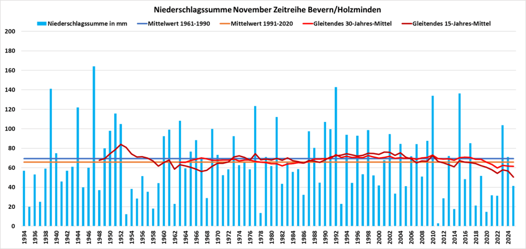 Mit dem November endete der meteorologische Herbst 2025 und dieser hinterließ im Vergleich zu den 30-jährigen Mittelwerten Defizite bei Niederschlag und Sonnenschein und den obligatorischen Überschuss bei den Temperaturen. An der Station in Bevern war es mit 10,81 °C um 0,9 Grad wärmer als im Durchschnitt der Jahre 1991-2020; 172,6 mm bedeuten gut 88% des mittleren Niederschlags und 248 Stunden Sonnenschein ein Minus von knapp 39 Stunden bzw. gut 13%. In Silberborn wurden 8,8 Grad gemessen, was einem Plus von 0,7 Grad gegenüber dem Mittel von 1991-2020 entspricht, die Niederschlagssumme von knapp 235 mm lag um gut 31 mm bzw. zwölf Prozent im Minus. Die bisherige Jahressumme liegt nach elf Monaten noch um gut 75 mm unter der Jahresendsumme des Trockenjahres 2018, das allerdings wärmer und sonniger war und dadurch eine höhere Verdunstung aufwies.