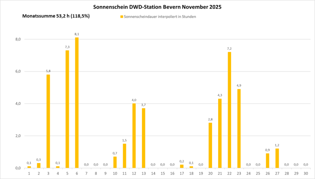Die Sonnenscheindauer war für Novemberverhältnisse durchaus recht achtbar und übertraf mit gut 53 Stunden den langjährigen Durchschnitt um gut acht Stunden bzw. 18% – nur knapp zwei Stunden weniger als im sehr trüben Vormonat Oktober. Immerhin an drei Tagen gab es „Sonne von früh bis spät“, zweimal zu Monatsbeginn am 5. und 6. begleitet von 15-16 Grad sowie am 22. mit frühwinterlichen Temperaturen. Der Wind war meist schwach bis mäßig unterwegs, im Mittel oft mit Stärke 2-3 und in Böen meist bei 4-5. Nur am 23.11. kamen die Spitzenböen kurzzeitig mal bis auf Stärke 7.