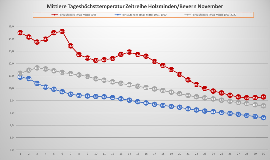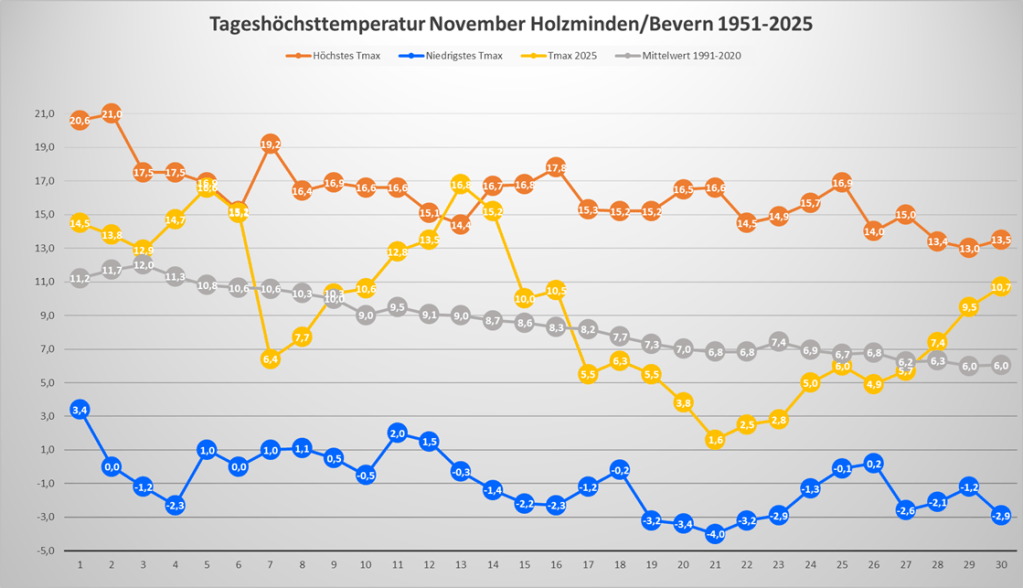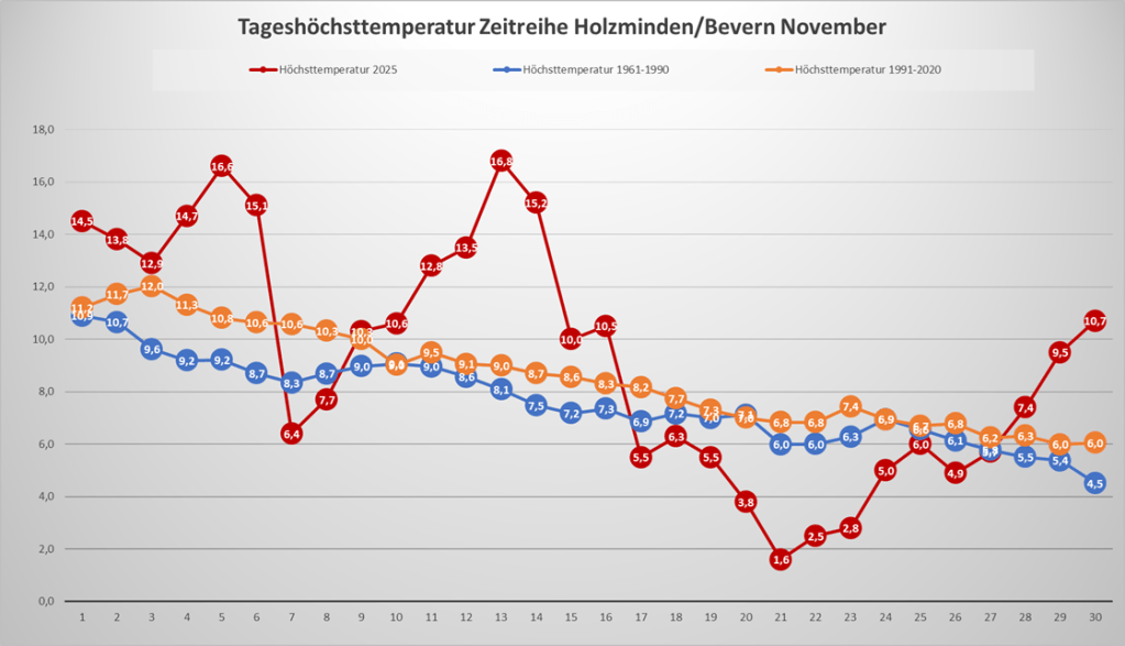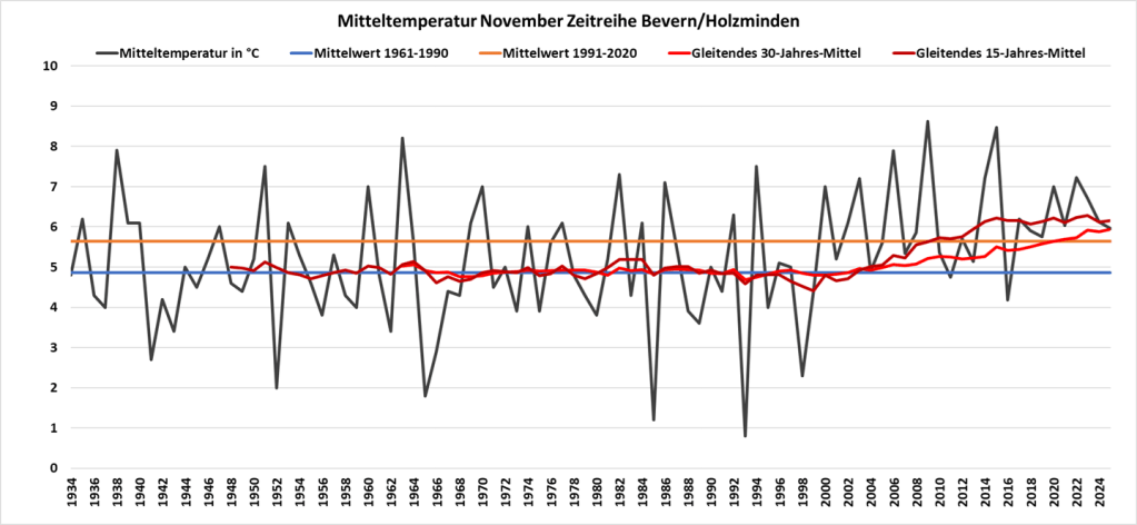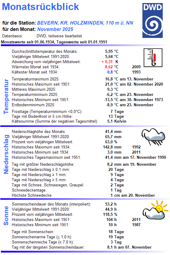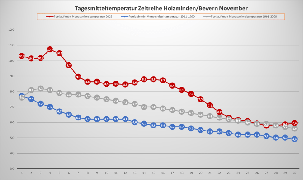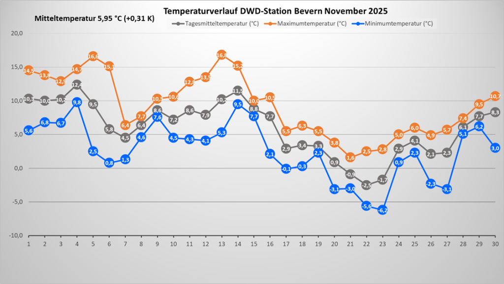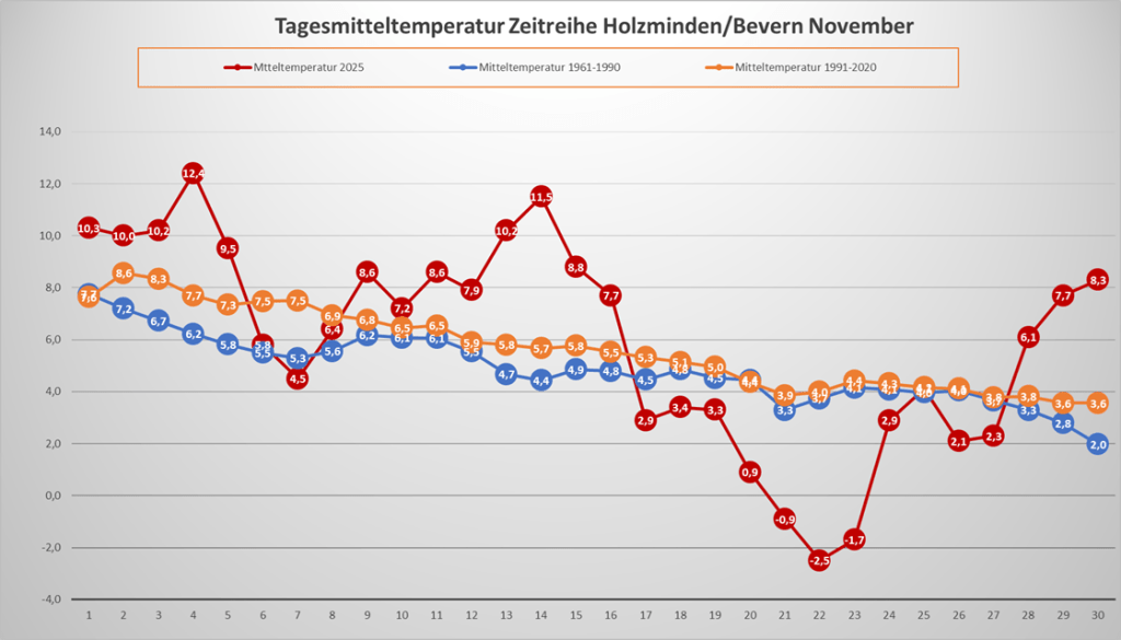 Mit einer Mitteltemperatur von 5,95 °C war der November 2025 an der DWD-Station in Bevern um 0,3 K wärmer als im Mittel der Jahre 1991-2020. Gegenüber dem älteren Referenzmittel der Periode von 1961-1990 betrug das Plus 1,1 K. Die ersten sechs Tage brachten durchschnittliche Höchstwerte von fast 15 Grad, auf einen kurzen Rückgang folgte ein nochmaliger Anstieg auf bis zu fast 17 Grad kurz vor Monatsmitte. Solche warmen Witterungsabschnitte in der ersten Novemberhälfte werden oft als Martinisommer bezeichnet. Doch man sollte sich davon nicht täuschen lassen, der nachfolgende Absturz fällt gerade in jüngster Vergangenheit meist umso kräftiger aus – so auch in diesem Jahr, als es zu Beginn der dritten Dekade mäßigen Frost mit einem Tiefstwert von -6,2 °C am 23. gab. Nur sechs Tage zuvor hatte es in Bevern überhaupt erst den ersten Luftfrost der Saison gegeben. Eine erneute Milderung zum Monatsende beendete diesen frühwinterlichen Abschnitt, ein weiterer scheint bis in die zweite Dezemberhälfte nicht in Sicht. In der Zeitreihe Bevern/Holzminden mit Monatswerten seit 1934 ordnet sich der November 2025 im oberen Mittelfeld ein: 30 waren wärmer, 61 kälter.
