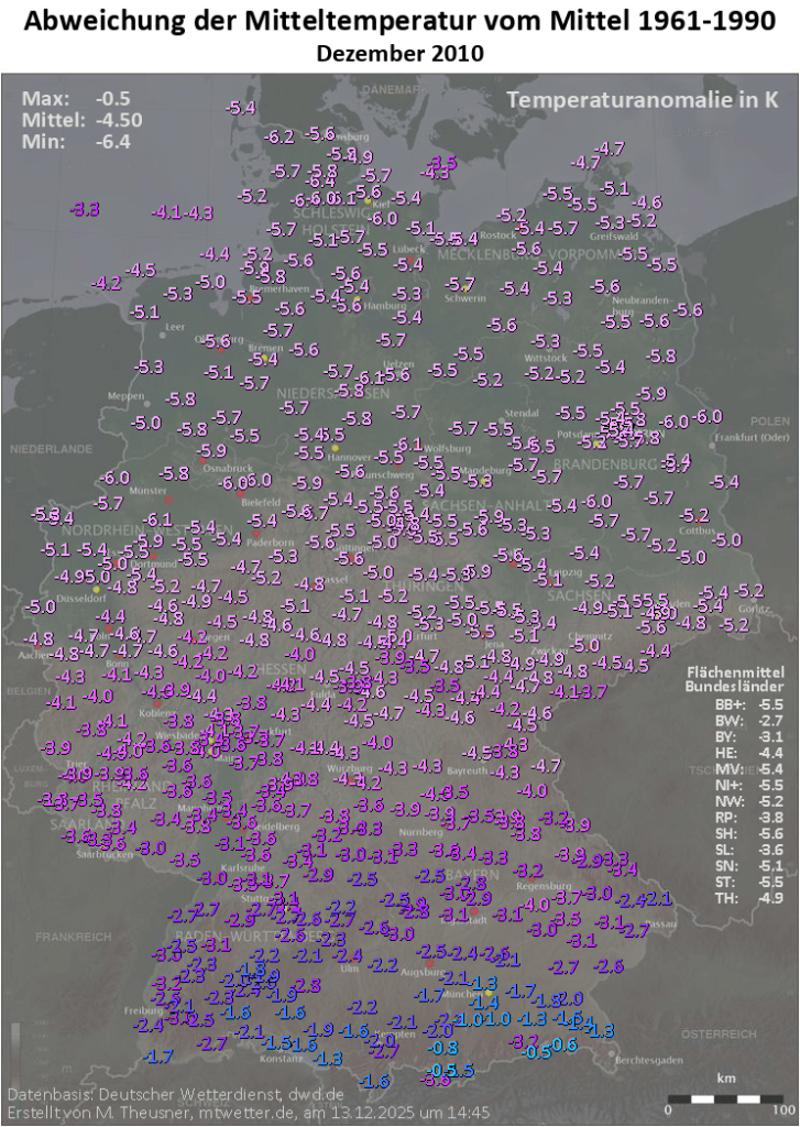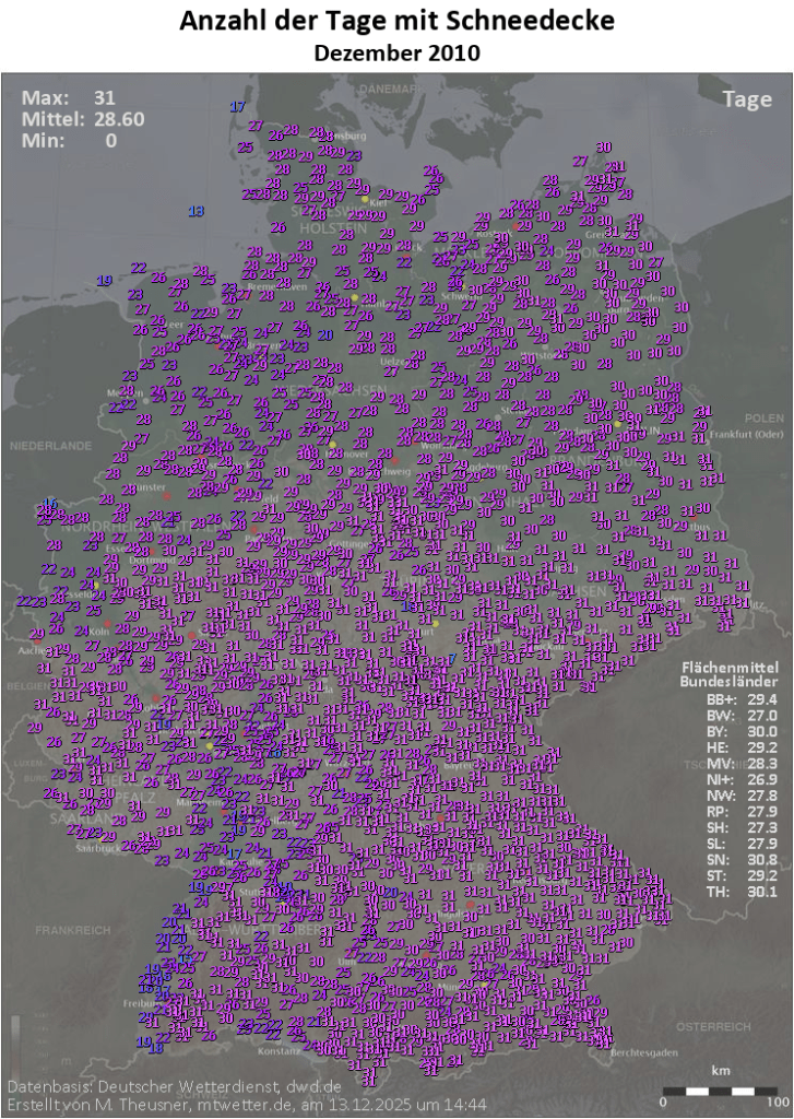 In der Bilanz stehen für die Beobachtungsreihe Holzminden/Bevern mit Monatswerten seit 1934 und Tageswerten seit 1951 beeindruckende Zahlen: Mit einer Mitteltemperatur von -3,8 °C war es nach 1940 der zweitkälteste Dezember seit Aufzeichnungsbeginn, mit 29 Schneedeckentagen wurde der bis dahin bestehende Rekord von 23 (1969+1981) deutlich übertroffen. Für den Dezember 1940 liegen aus der Region nur Messungen vom Forsthaus Torfhaus im Solling vor, dort waren es damals volle 31 Schneedeckentage. Daten aus der weiteren Umgebung deuten aber klar darauf hin, dass in den Niederungen die Marke von 29 nicht erreicht wurde, womit der neue Rekord von 2010 wohl ein historischer seit Aufzeichnungsbeginn sein dürfte – der bis heute nicht mehr annähernd erreicht wurde. Nur in den ersten Hälften 2012 und 2022 zeigte sich der Dezember seither noch einmal etwas länger winterlich, in den allermeisten Fällen aber waren zumindest im Wesertal Schnee und Eis die Ausnahme und die Regel eine Wetterlage, wie wir sie in diesen Tagen wieder einmal erleben.