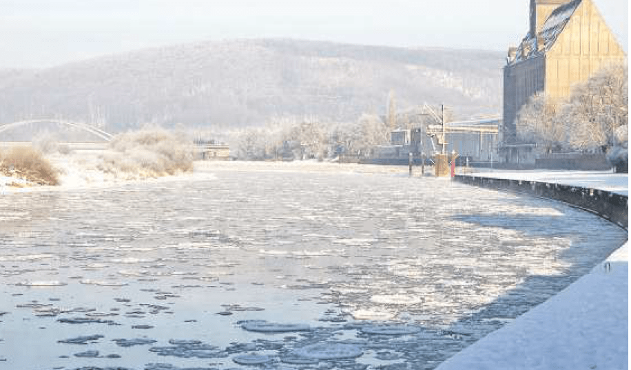 Kälteeinbruch Anfang Januar 2009: Nach langer Zeit trug die Weser wieder Eis (Foto: Archiv TAH, Frank Müntefering)