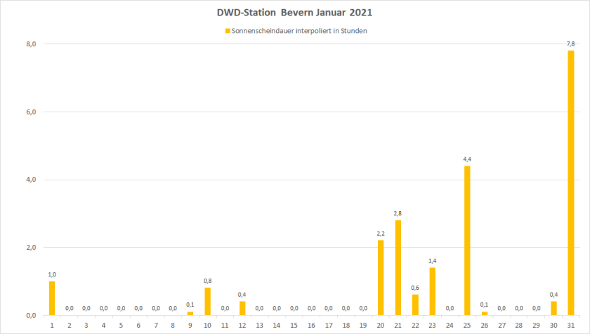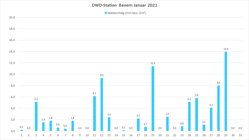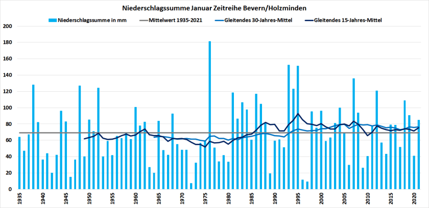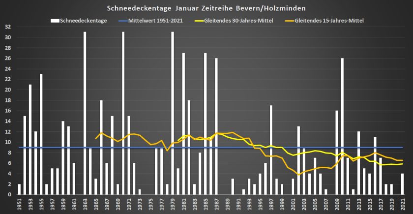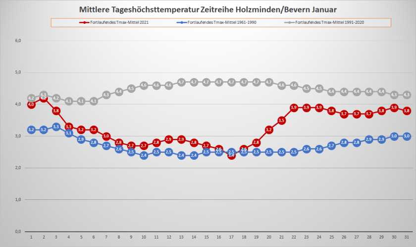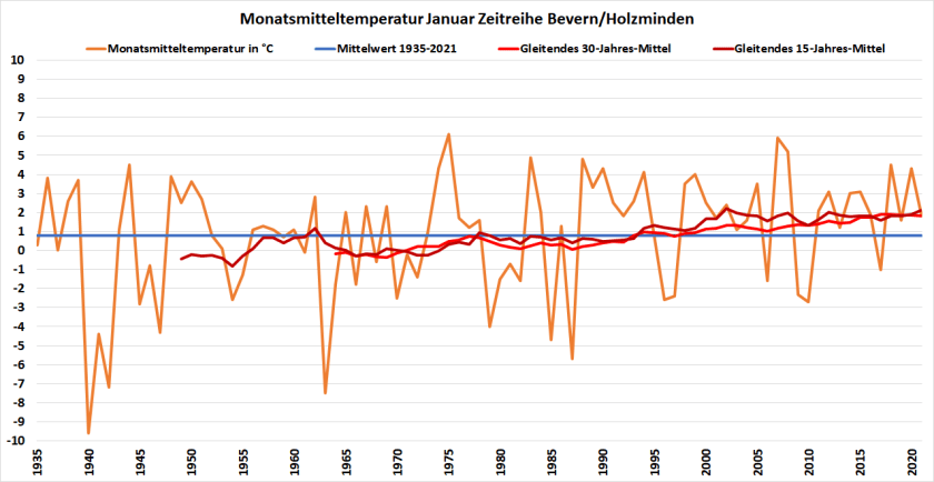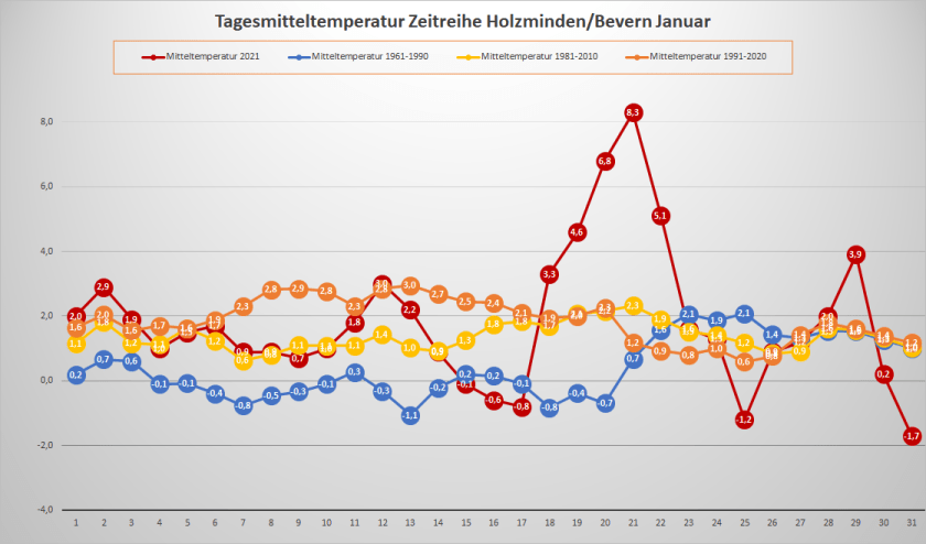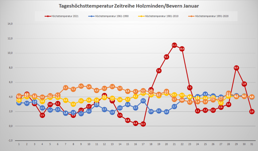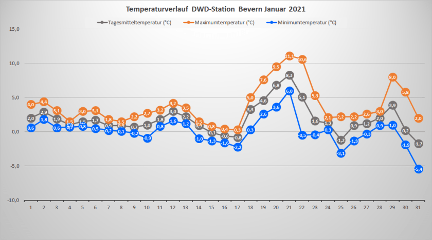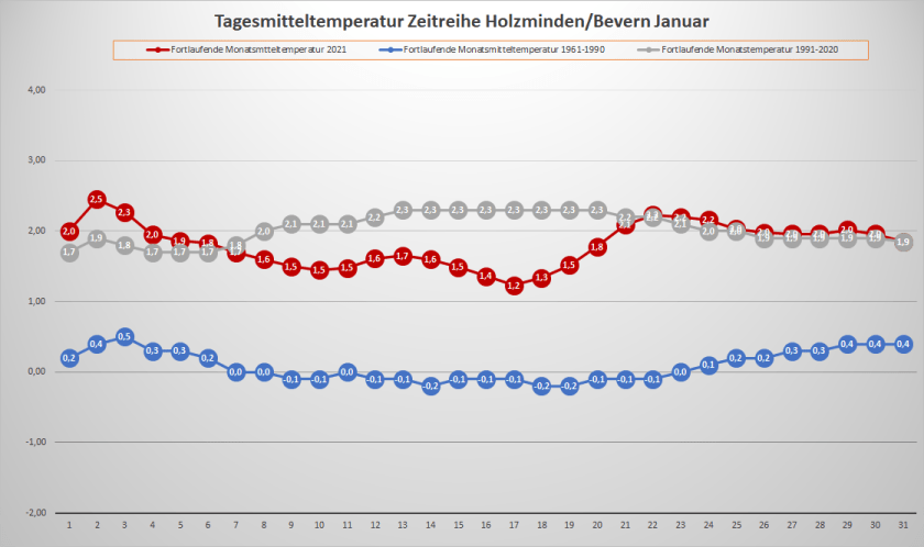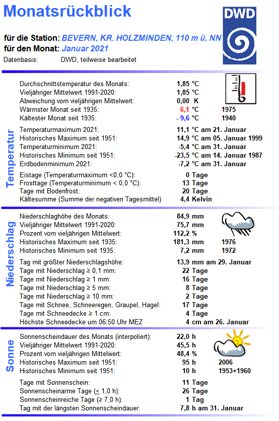 Mit einer Monatstemperatur von 1,85 °C machte der Januar an der DWD-Station in Bevern eine Punktlandung auf dem 30-jährigen Mittelwert der aktuellen Klimaperiode 1991-2020 und zählt damit im Kontext der letzten zehn Jahre bereits zu den kälteren Vertretern. Gegenüber der alten Referenzperiode von 1961-1990 betrug die Abweichung +1,44 K. In manchen Darstellungen, auch denen der DWD-Pressestelle, wird dieser ältere Klimawert weiterhin vorrangig als Bezugsmittel genannt, dort ist von einem milden Januar die Rede.
