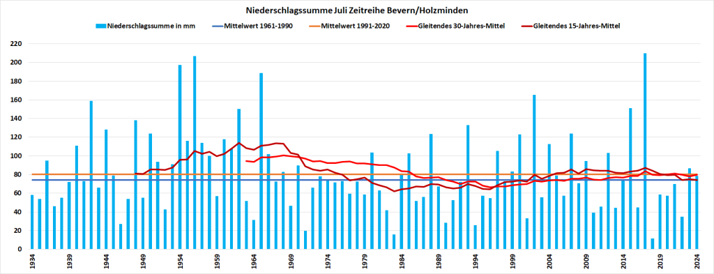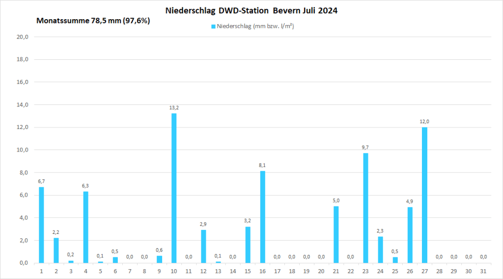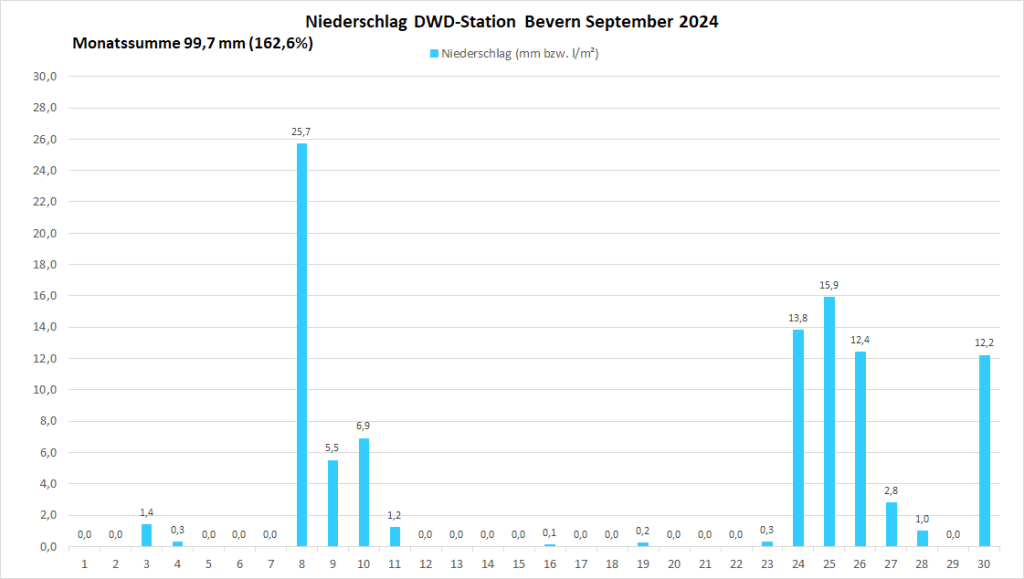 Wie schon 2023 fiel nicht nur die Temperatur-, sondern auch die Niederschlagsbilanz klar überdurchschnittlich aus. Erfreulich für die Natur: Die Regenfälle verteilten sich diesmal recht homogen über das Jahr, kurze und sehr kräftige Starkregenereignisse wie am 1. August, als flächig gut 50 Liter auf jeden Quadratmeter binnen weniger Stunden am Abend und in der frühen Nacht fielen, blieben ebenso die Ausnahme wie längere Trockenperioden. In Bevern kamen insgesamt 962 mm zusammen, ein Plus von gut 21% gegenüber dem Mittel 1991-2020. Zehn Monate waren nasser als im Schnitt, am deutlichsten Februar, April, August und September, während Oktober und Dezember unter ihrem Mittel lagen.