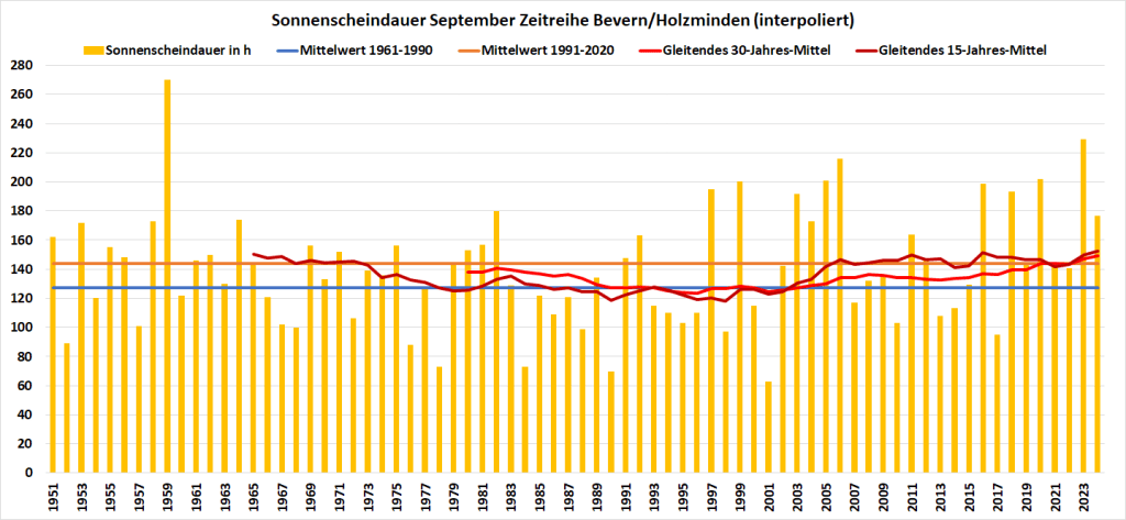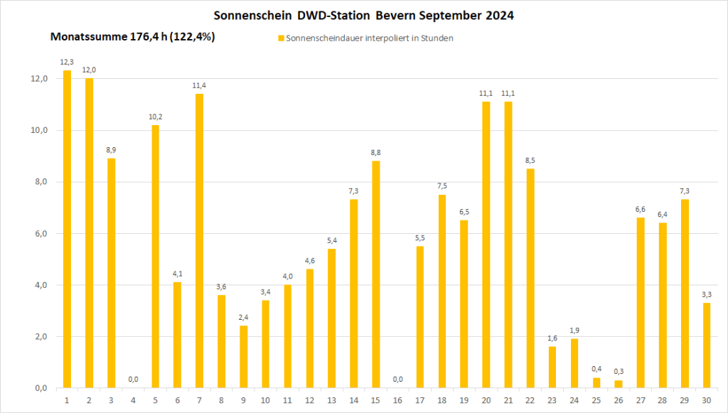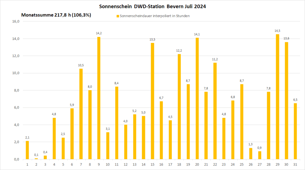 Auch die Sonnenscheindauer lag mit ca. 1.537 Stunden etwas über dem langjährigen Mittel, das Plus fiel mit 18 Stunden oder knapp 2% aber so gering aus, dass das Jahr 2024 als durchschnittlich beim Sonnenschein einzuordnen ist. Dabei war die Phase mit den höchsten Temperaturüberschüssen von Februar bis Mai die trübste in Relation zu den langjährigen Mittelwerten, während August, September und, man staune, der Januar am deutlichsten über ihrem Durchschnitt landeten. In absoluten Zahlen lag der August mit gut 240 Stunden vorn, gefolgt von Mai, Juli und Juni mit Monatssummen zwischen 222 und 214 Stunden.
