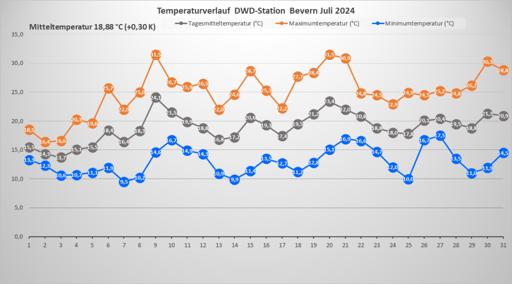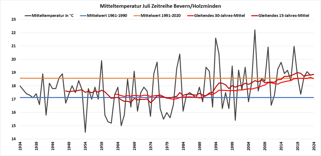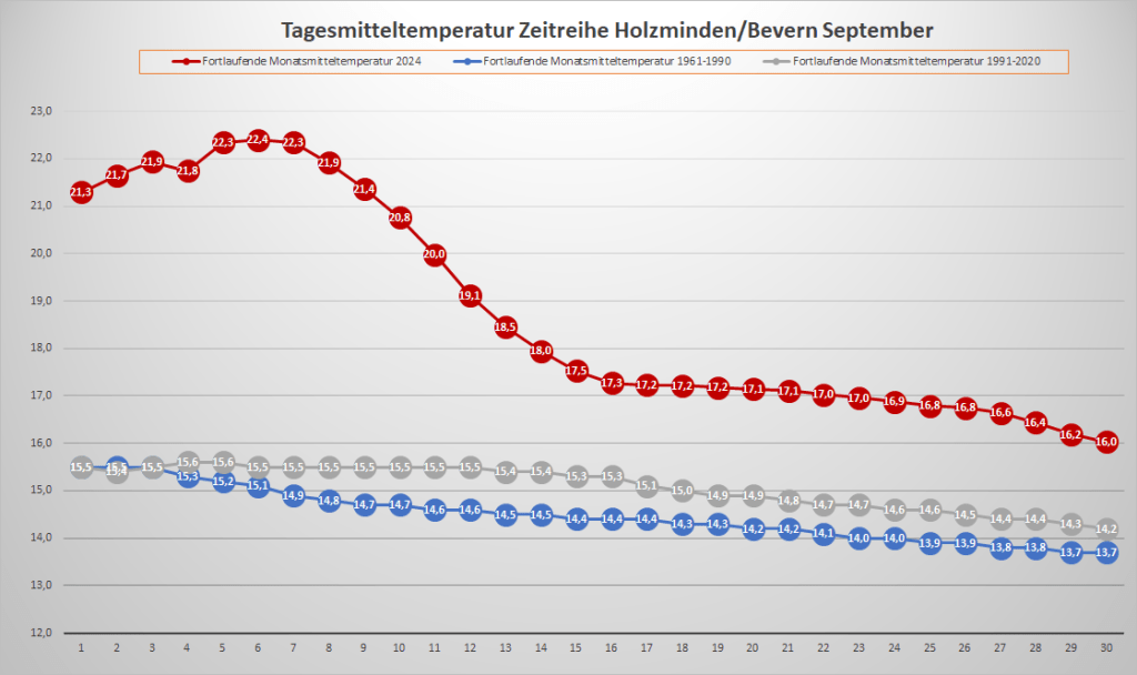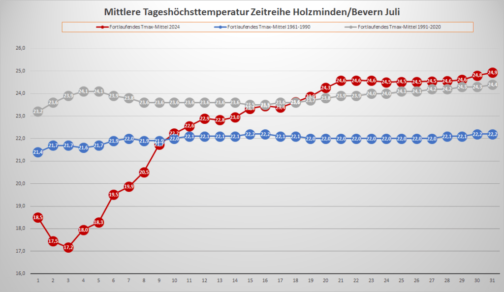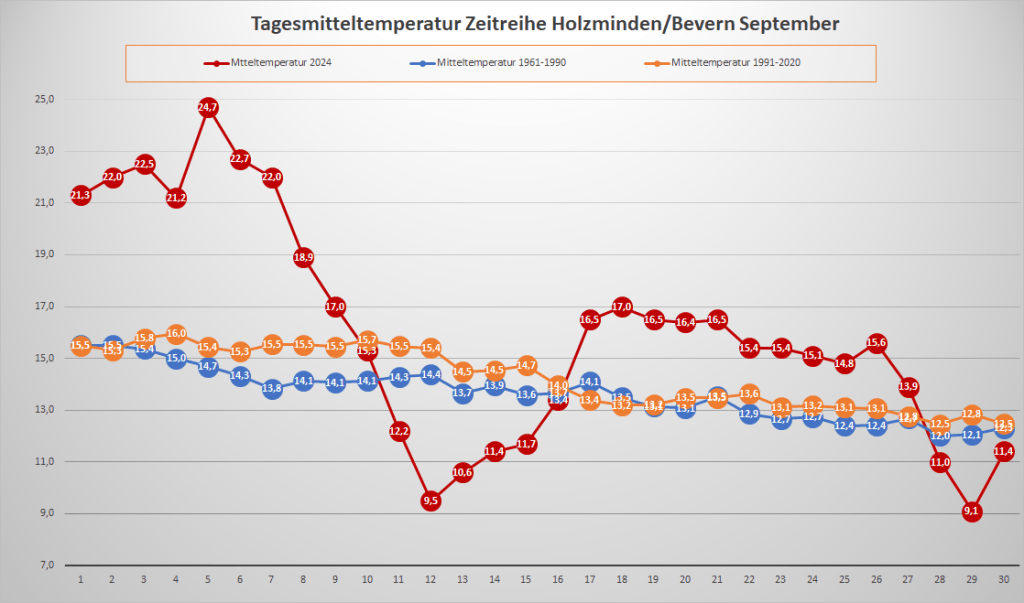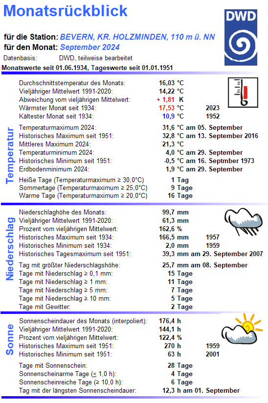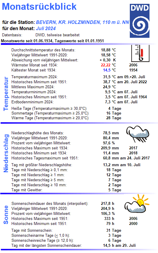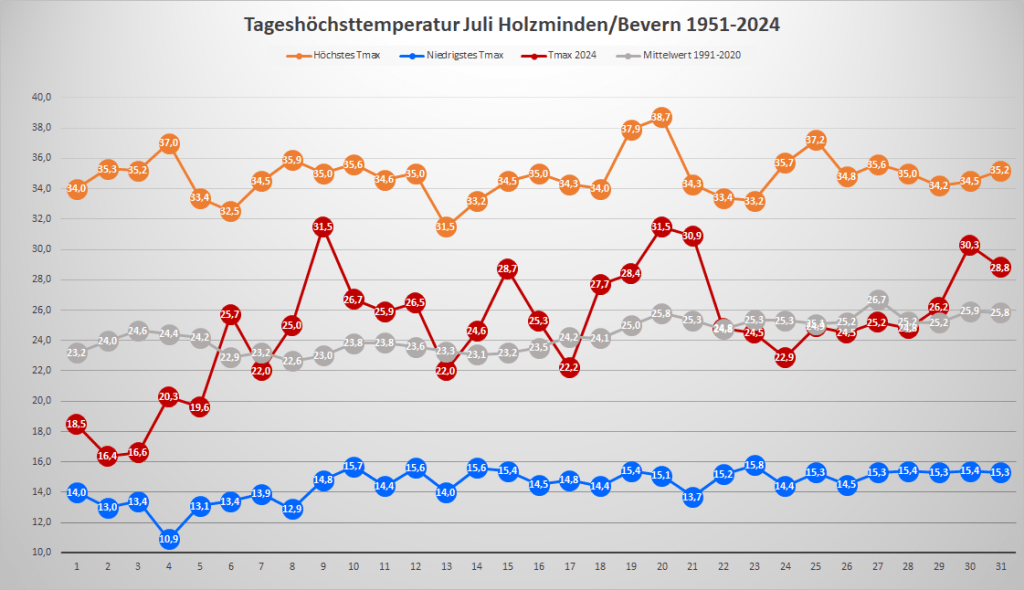 „In Deutschland war noch nie seit Messbeginn 1881 ein Jahr so warm wie 2024. Damit muss der Deutsche Wetterdienst (DWD) nach 2023 erneut ein „Rekordjahr“ melden.“ So beginnt die Pressemeldung des DWD vom 30.12.2024 und ihre Aussage trifft auch auf unsere Heimatregion zu: Sowohl an der Wetterstation des DWD in Bevern, repräsentativ für die Niederungen des Kreises, als auch an der Station in Silberborn, einem privaten Gemeinschaftsprojekt mit der Stadt Holzminden und stellvertretend für den Hochsolling, erreichten die Jahrestemperaturen 2024 neue Höhen. Und das ohne extreme Temperaturspitzen, auch in diesem Punkt unterscheidet sich das lokale Wetter nicht von der bundesweiten Bilanz des DWD.
