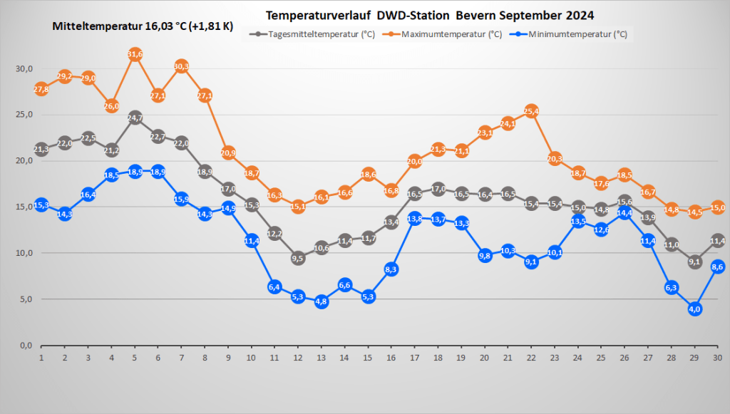 Mit einer Jahrestemperatur von 11,59 °C war das Jahr 2024 an der DWD-Station in Bevern so warm wie keines zuvor in der Geschichte der lokalen Messungen, die inzwischen 90 Jahre zurückreichen. Das Plus gegenüber dem Klimamittel der Jahre 1991-2020 betrug 1,7 K, gegenüber der älteren Periode von 1961-1990, die das Klima vor der Erwärmung abbildet, waren es sogar +2,8 K. Der erst im Vorjahr aufgestellte Rekord von 11,32 °C wurde erneut deutlich um fast 0,3 K übertroffen – wie 2023 schon der vorherige Höchstwert von 11,01 °C aus den Jahren 2020 und 2022, deren Marken nunmehr schon fast 0,6 K tiefer als der aktuelle Rekord liegen. Solche Sprünge nach oben hat es in der Vergangenheit nur nach zuvor kalten Jahren gegeben, aber noch nie von einem ohnehin schon sehr hohen Niveau aus. Salopp formuliert hat die Erwärmung seit 2014 mehr als nur eine Schippe draufgelegt, was folgender Vergleich verdeutlicht: Betrug das Mittel der Jahre 1961-1990 noch 8,80 °C, waren es 1991-2013 schon 9,65 °C und der Zeitraum seit 2014 kommt in nur elf Jahren auf einen weiteren Anstieg von über einem Kelvin auf 10,73 °C.