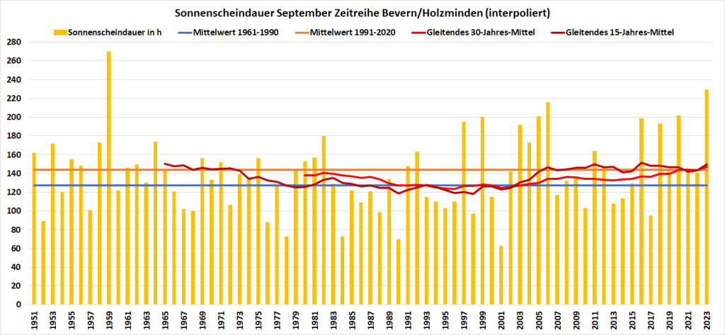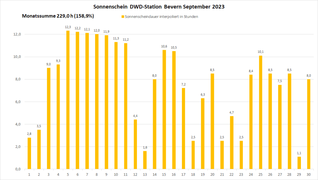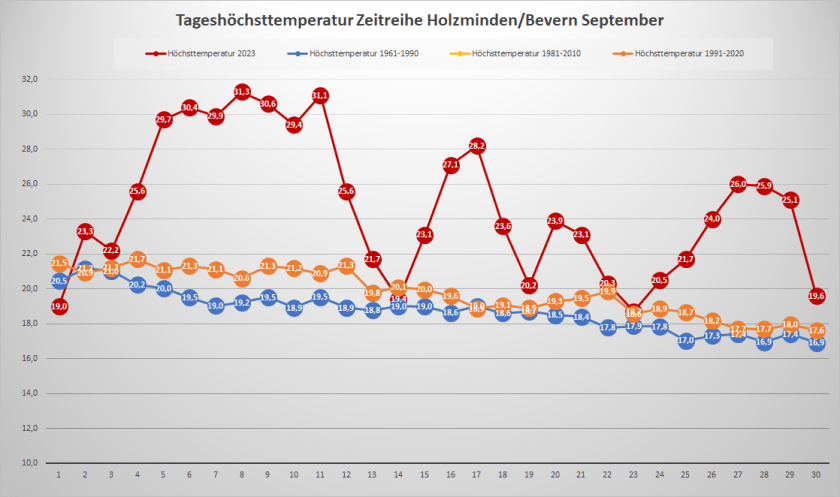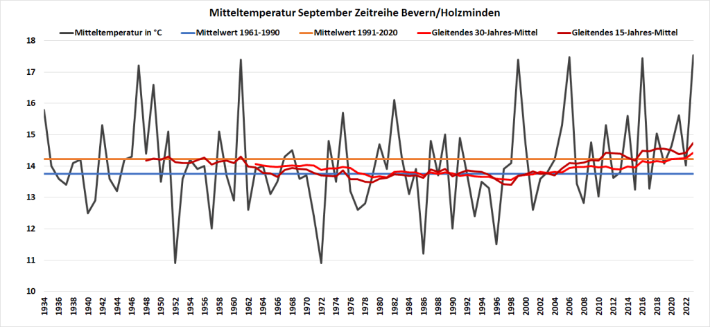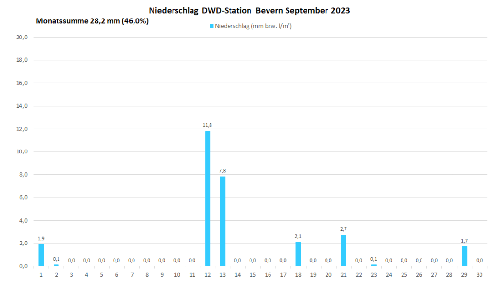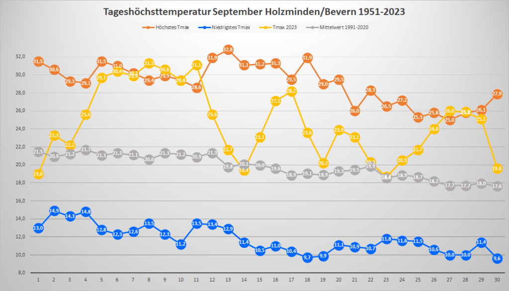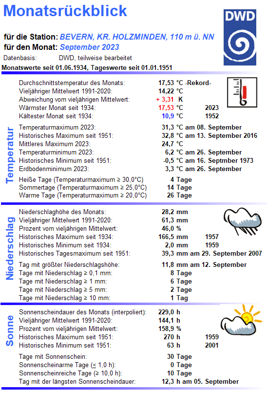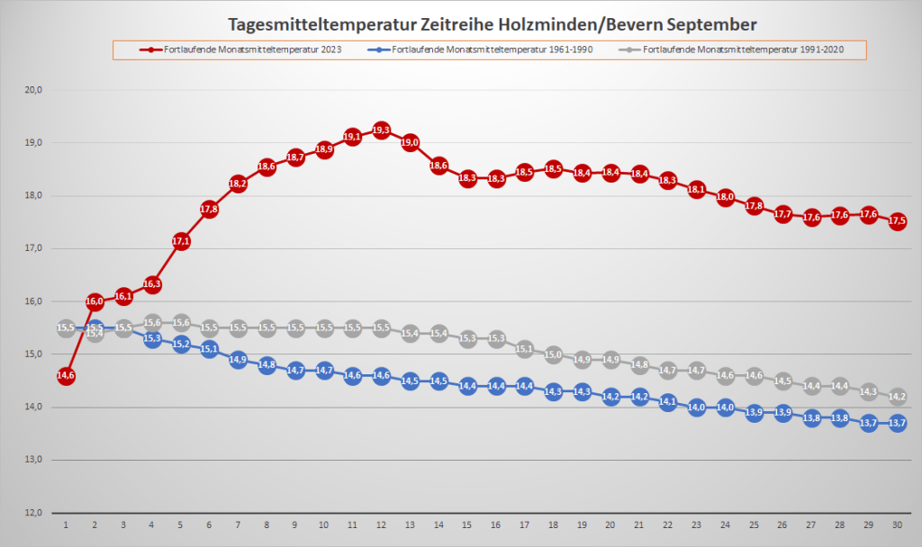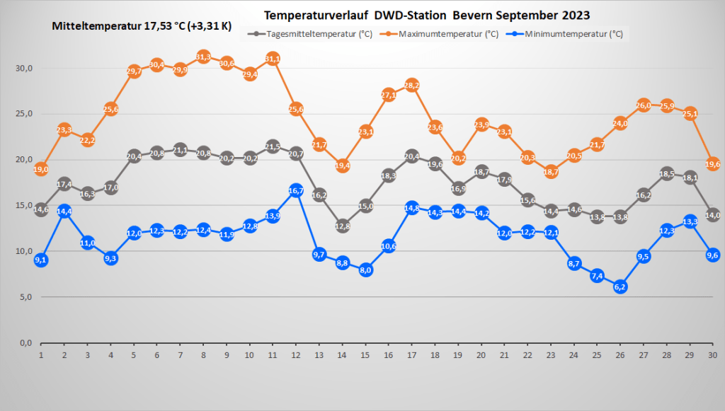 Mit einer Monatstemperatur von 5,43 °C war der Dezember 2023 an der DWD-Klimastation in Bevern um fast 2,7 Kelvin wärmer als im Mittel der Jahre 1991-2020. Im Vergleich zum niedrigeren, 30 Jahre älteren Klimawert der Periode 1961-1990 betrug das Plus sogar 3,7 K. Damit war es der fünftwärmste Dezember seit Aufzeichnungsbeginn 1934 – trotz eines durchaus winterlichen Starts mit leichtem Dauerfrost. Von außergewöhnlichen Höchstwerten wie den rekordwarmen 18,1 Grad am Silvestertag 2022 blieb die milde Westwetterlage ab dem Ende der ersten Dekade in diesem Jahr zwar weit entfernt, dafür gab es bis zum Jahresende aber keine kühle, geschweige denn kalte Phase mehr – Durchschnittswerte bei den Maxima von 9,5 °C und fast fünf Grad bei den Minima ab dem 10. Dezember erinnern deutlich mehr an Herbst als an Winter. Auch die Zahl der Frosttage blieb mit sieben, die allesamt in den ersten acht Tagen gemessen wurden, deutlich unter den langjährigen Mittelwerten. Die Zeit ab 9. markiert eine der bisher längsten frostfreien Perioden in einem Dezember überhaupt.