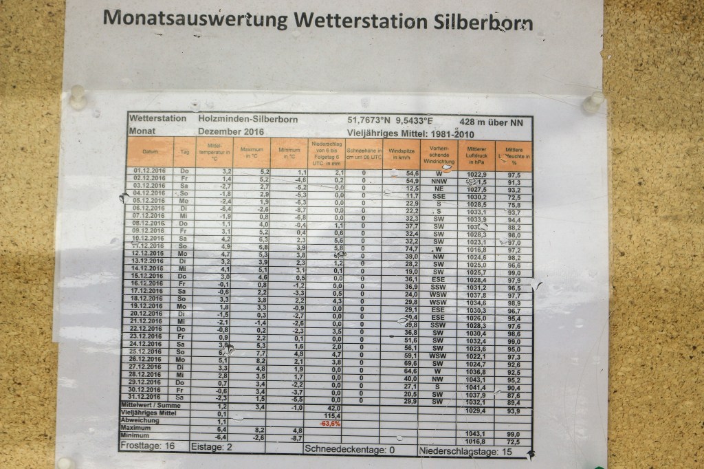 Weitere Unterstützer: Tourist Information Neuhaus/Silberborn, Gebäudeverwaltung Dorfgemeinschaftshaus Silberborn, Grünamt Stadt Holzminden, DWD RZ Hamburg (Niederschlagsmesser Hellmann), Täglicher Anzeiger Holzminden – sowie jede(r), der dieses Projekt gerne ab sofort fördern möchte, gerne mit einer Spende für den erfolgreichen Weiterbetrieb!